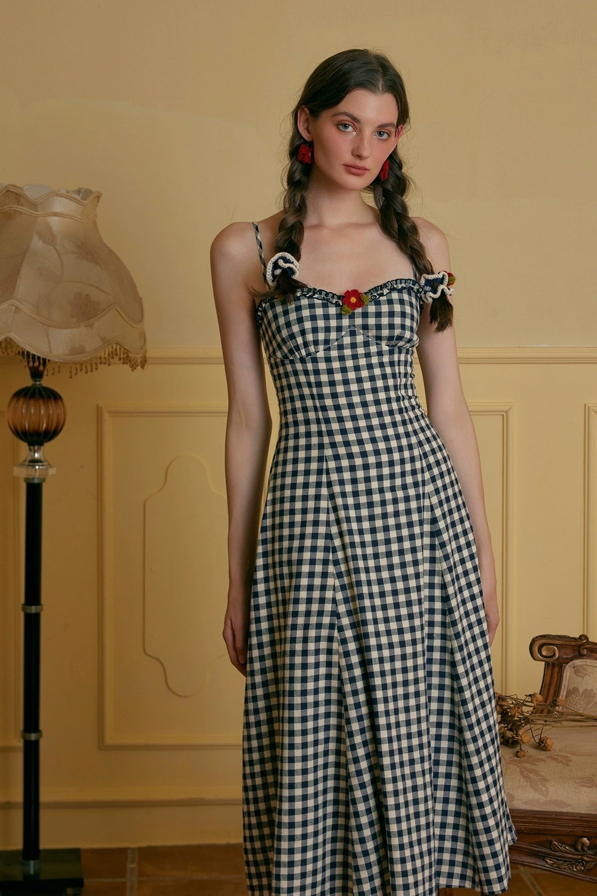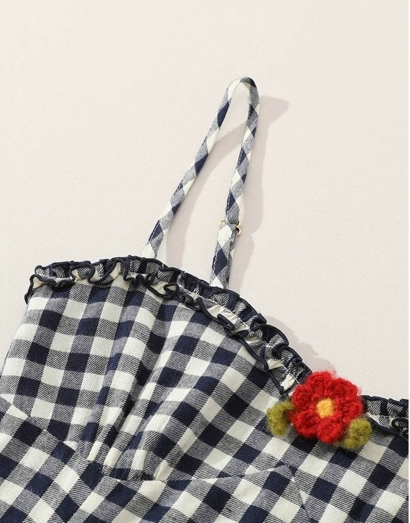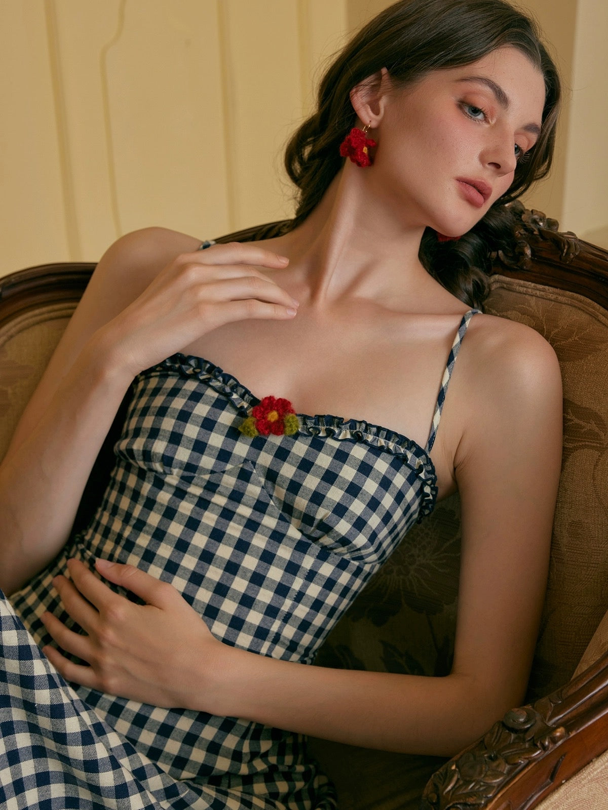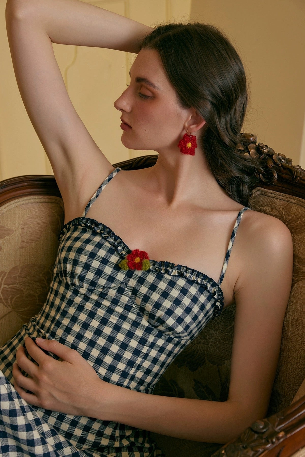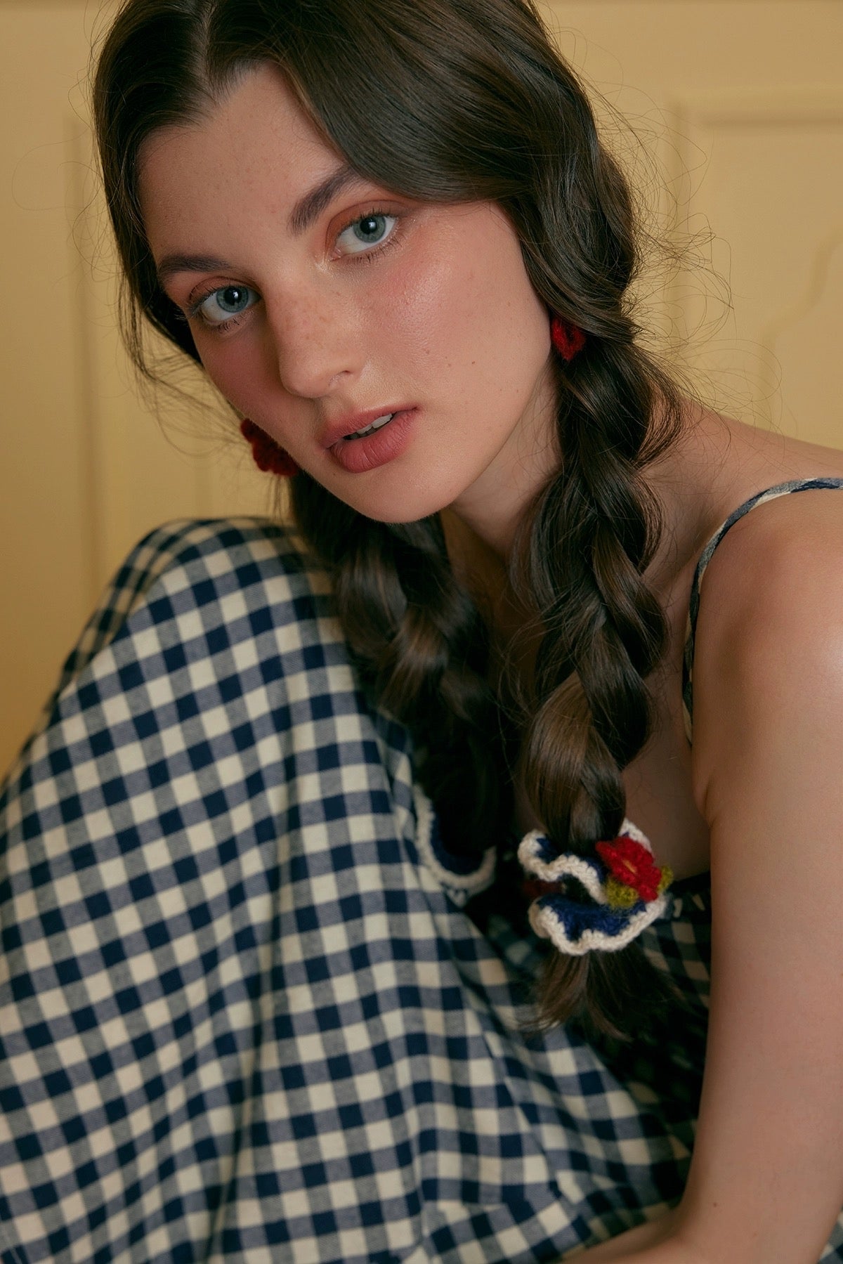 Meet ‘Carmila’, a dreamy duo where comfort meets charm. Crafted from 100% brushed cotton in a delicate gingham pattern, the dress feels buttery-soft, smooth against the skin, and oh-so breathable thanks to its airy cotton voile lining, perfect for warm days or cozy layering. Ruched at the bust for a flattering fit, with playful ruffle trim at the neckline, adjustable straps because we know the perfect fit matters. A hand-crocheted flower brooch adds that sweet, eye-catching touch. And the back zip? Smooth and easy, so you’re out the door in seconds.