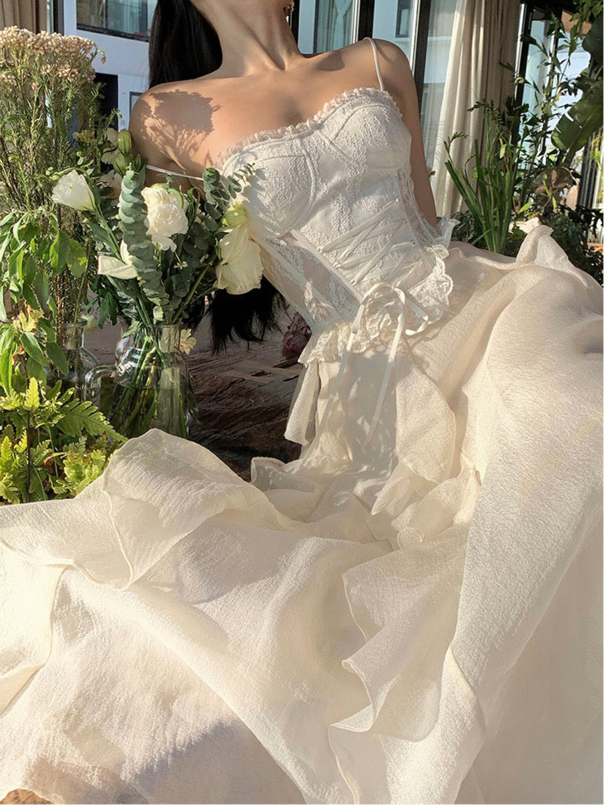 From the moment we laid eyes on this design, we knew it was special. Think vintage coquette meets modern muse, with soft lace, sculpted lines, and ethereal movement in all the right places.