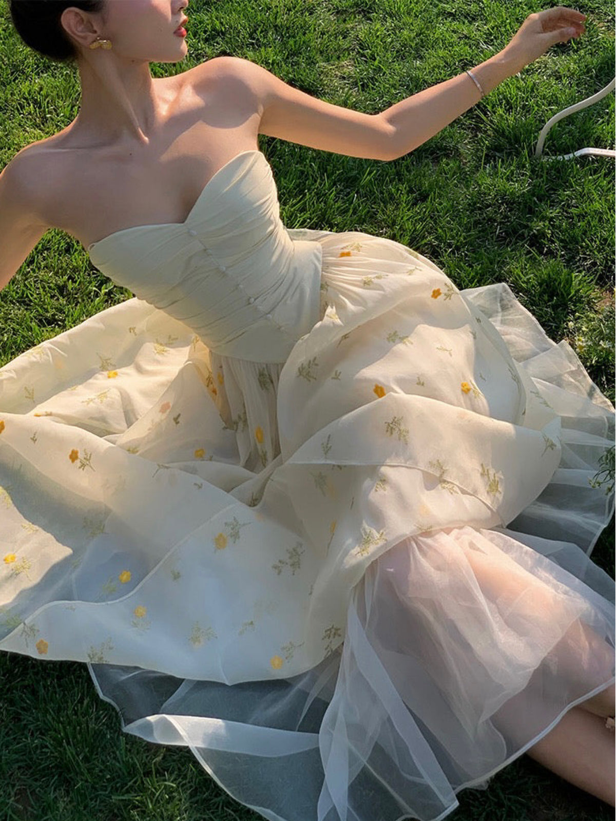 The skirt is full of texture and movement, made even more playful with a hidden layer of mesh underneath for extra volume. Scattered yellow floral stitching gives the illusion of blossoms floating across the hem—so dreamy.