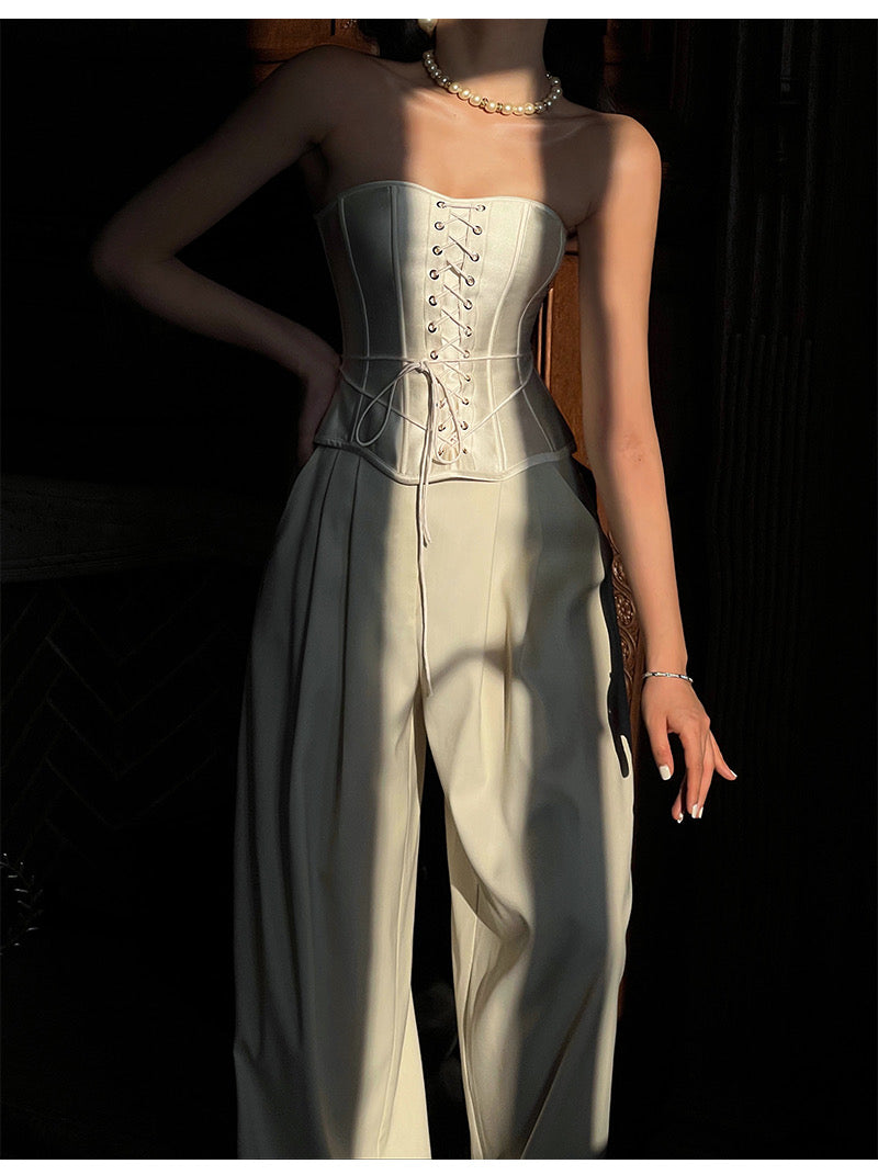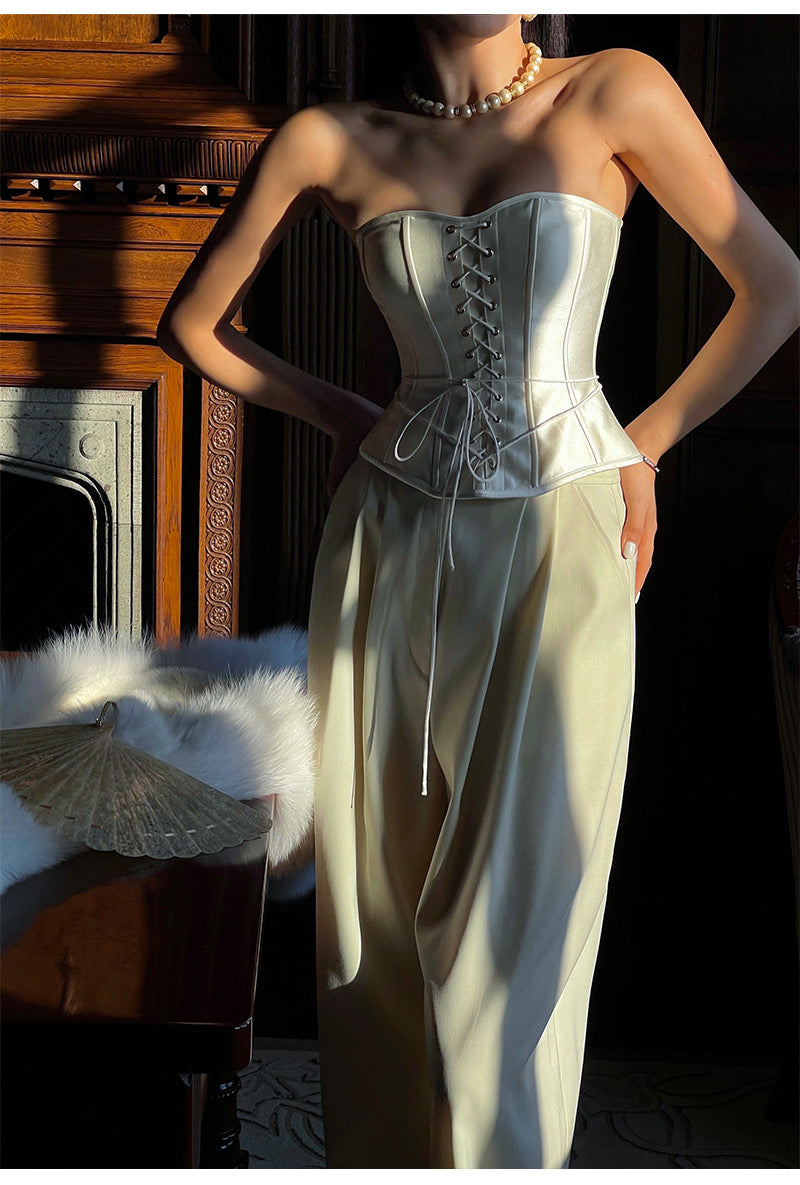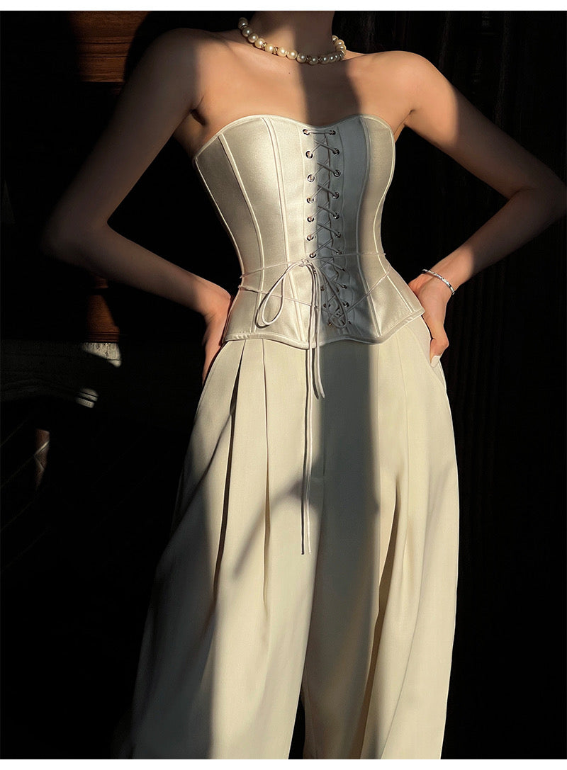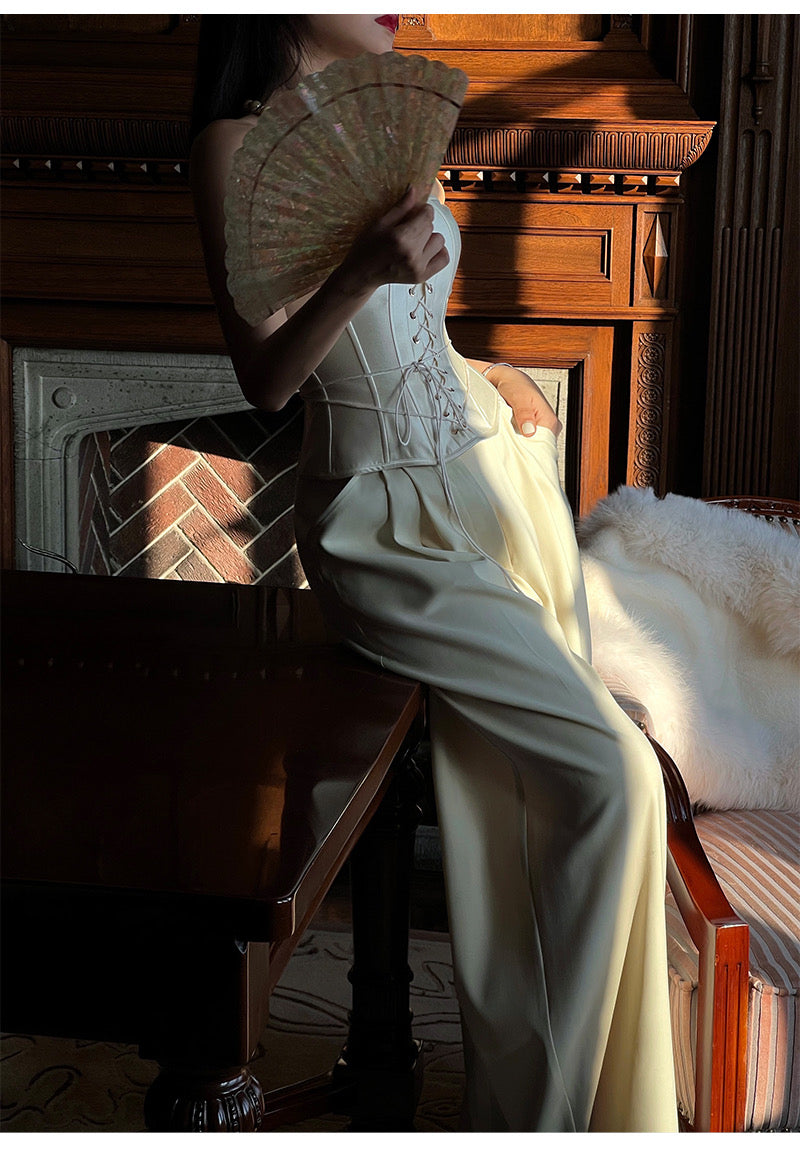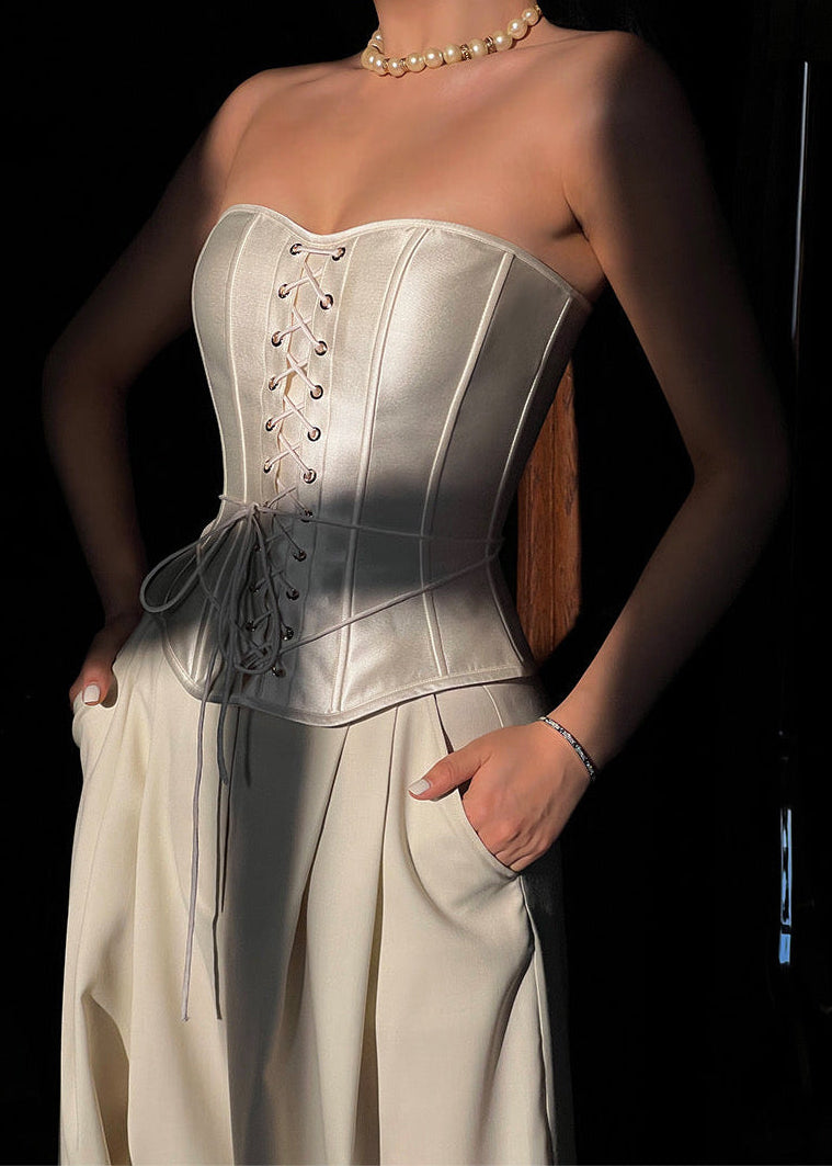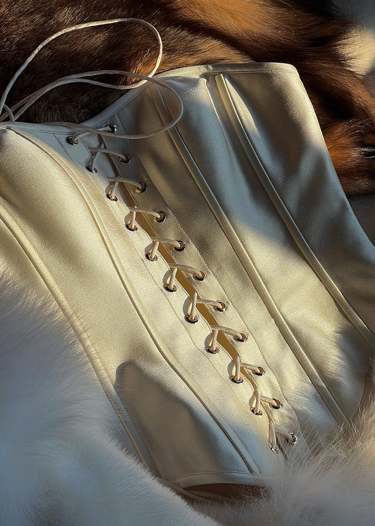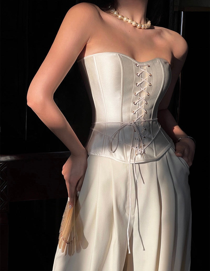 A non-slip strip around the neckline ensures a secure fit, while double rows of light gold metal eyelets on the placket, trimmed with satin strings, offer a retro-chic look with modern metal accents. The harmony of these details adds a unique touch of charm.