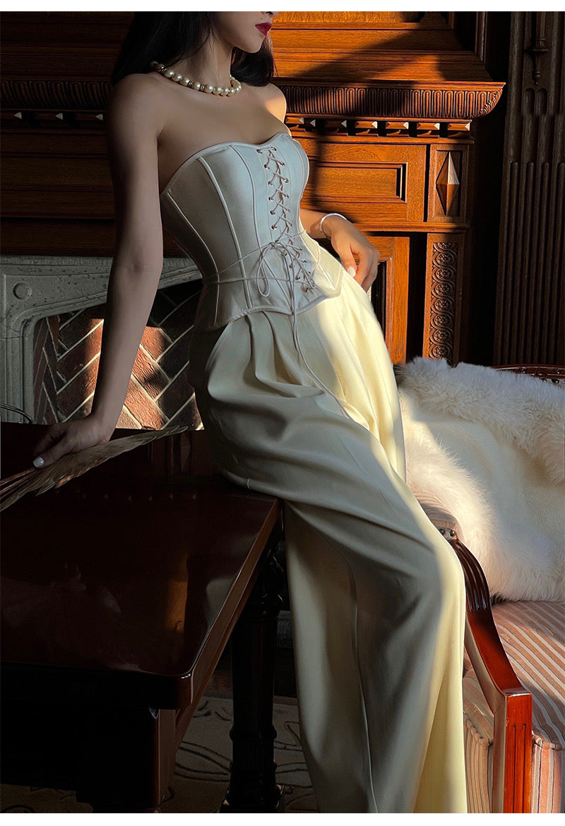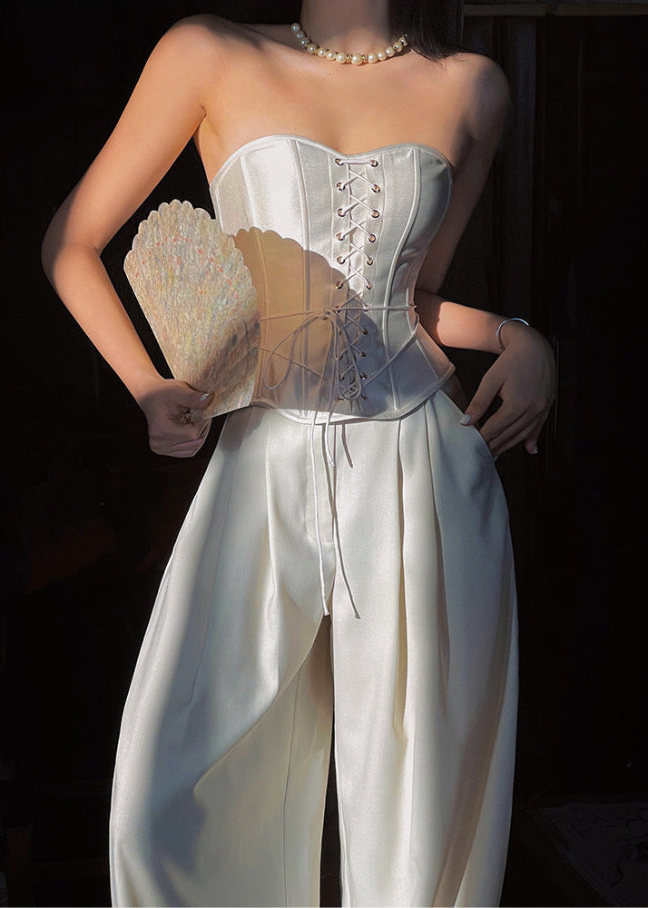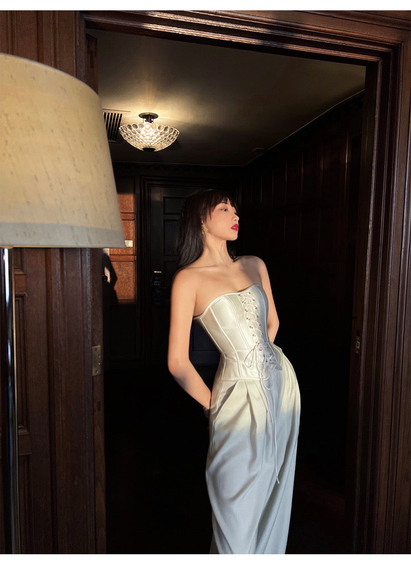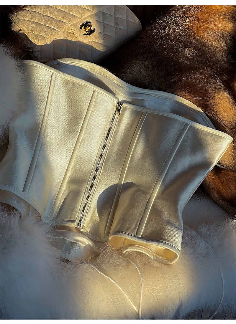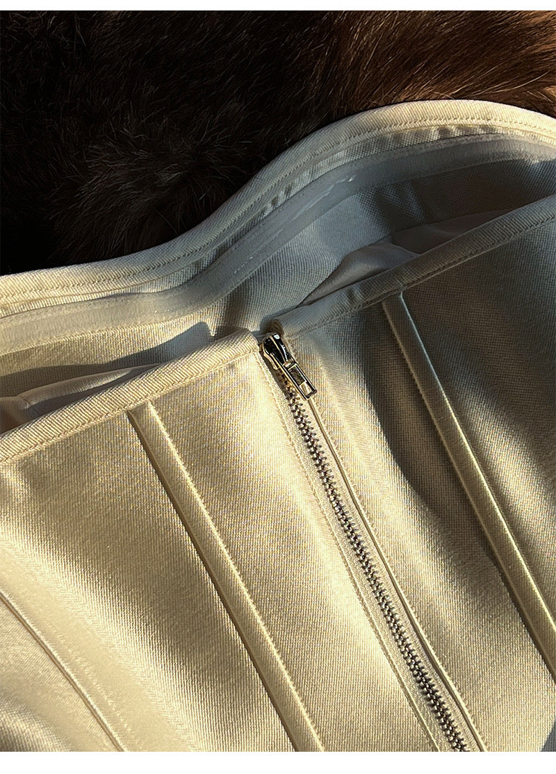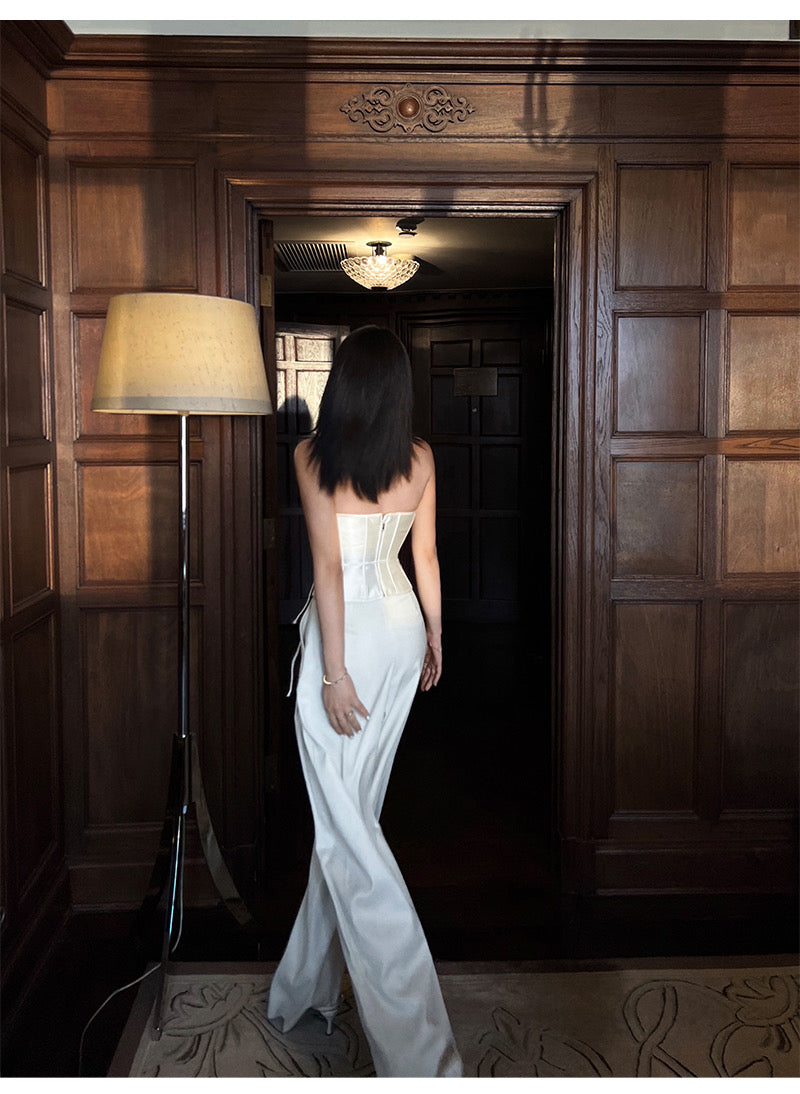 The fitted waist, combined with a compound curved neckline, creates a sweet and pure aesthetic. Ten fishbones at the waist ensure a secure fit while emphasizing the bust and slimming the waist. The fishbone structure extends to the neckline, widening the silhouette and highlighting its curves. Added chest cotton provides extra lift and enhances the shape.