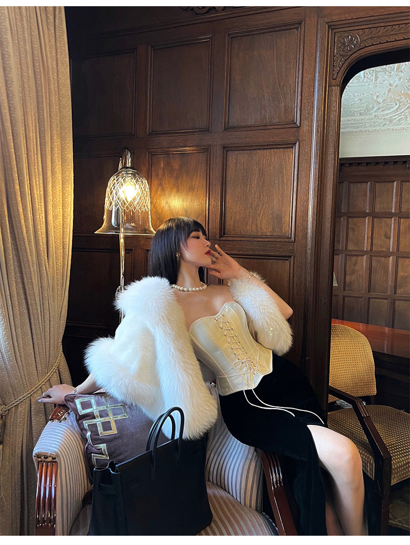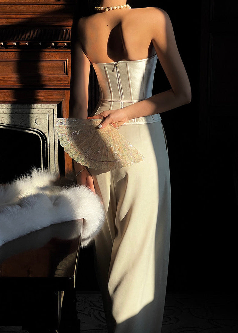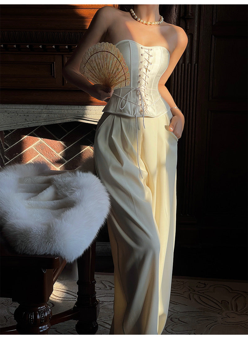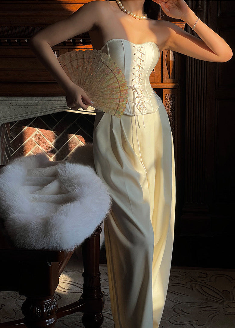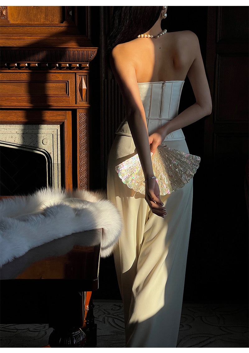 The fitted waist, combined with a compound curved neckline, creates a sweet and pure aesthetic. Ten fishbones at the waist ensure a secure fit while emphasizing the bust and slimming the waist. The fishbone structure extends to the neckline, widening the silhouette and highlighting its curves. Added chest cotton provides extra lift and enhances the shape.