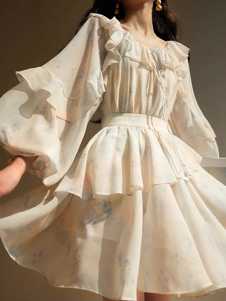 Our upgraded chiffon-linen blend is soft on your skin, breezy to wear, and kind to your suitcase — no steamer needed. The top features intricate gathered ruffles at the neckline and shoulders, with wave-like frills stitched into the sleeves for that signature dreamy volume. Elastic cuffs bloom into gentle flares for an easy, floaty finish with every movement.