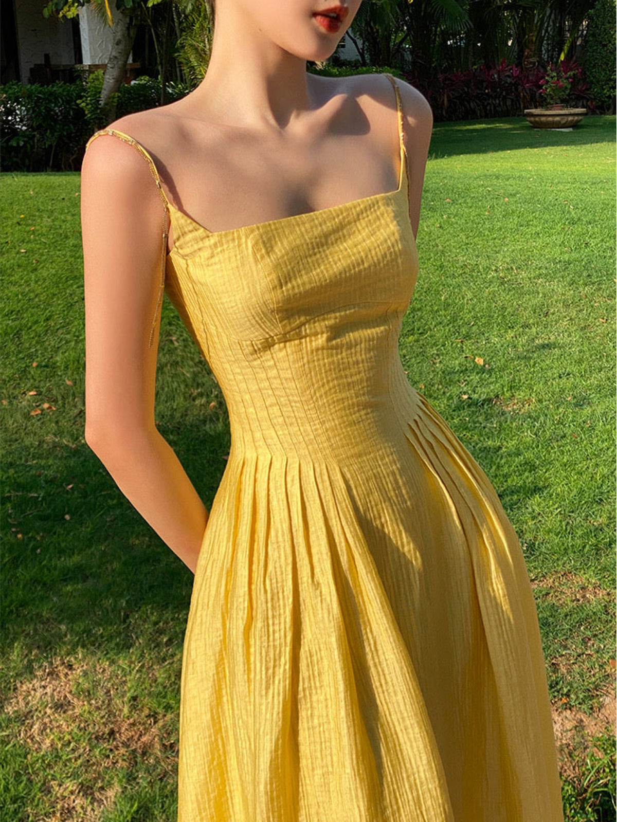 The Ludivine dress is crafted from premium woven fabric with a pleated texture that’s smooth, lightweight, breathable, and skin-friendly for all-day comfort. Its anti-static and durable properties make it ideal for any occasion. The radiant Luoxia Yellow hue captures the vibrancy of a summer sunset, while a special jacquard process adds a delicate sparkle, creating a dreamy, romantic look.