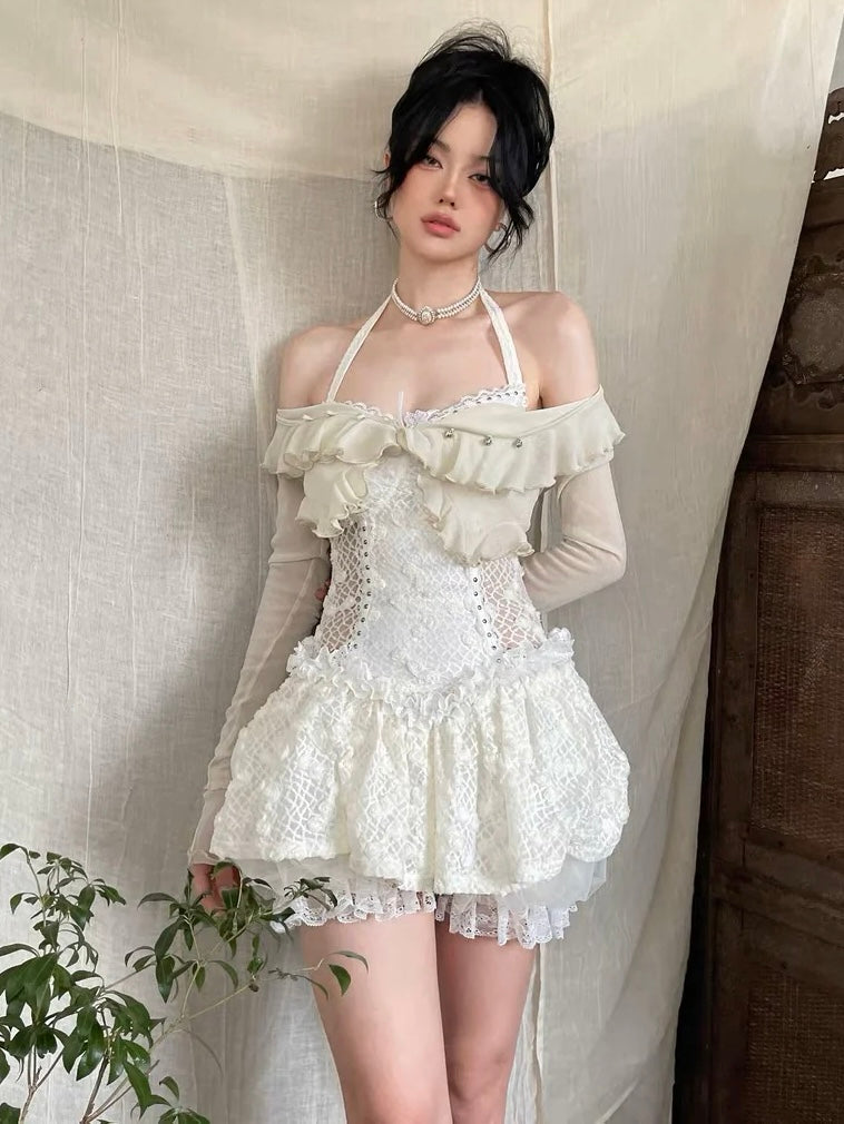 Inspired by the timeless craftsmanship of royal attire, this dress features intricate lace stitching that forms its elegant structure. Delicate metal beads and sculpted roses adorn the design, while a soft, fluffy mesh underskirt adds volume and movement.