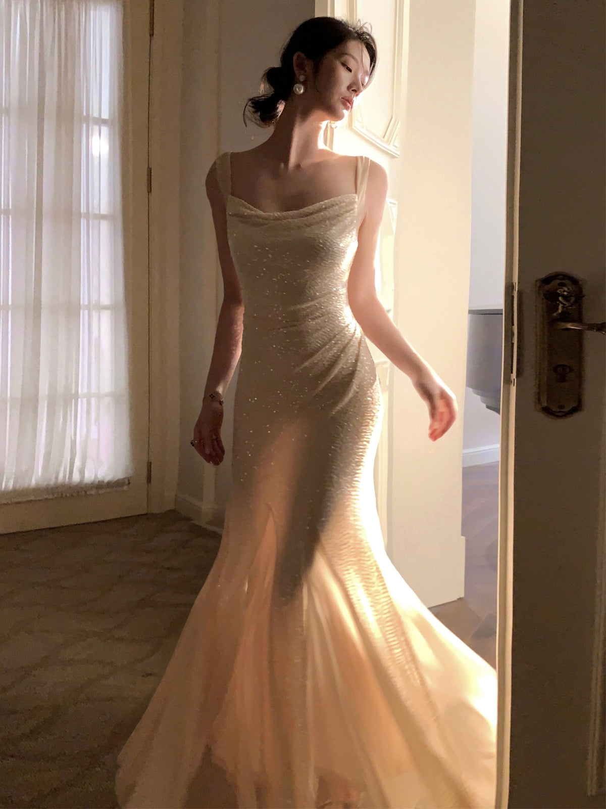 And then there’s the fishtail hem – a show-stealer in its own right. Six fan-shaped mesh inserts sway and unfold with every step, adding dreamy movement and a soft metallic flicker. Whether walking or seated, the skirt flows into a full romantic flare — no posing needed.