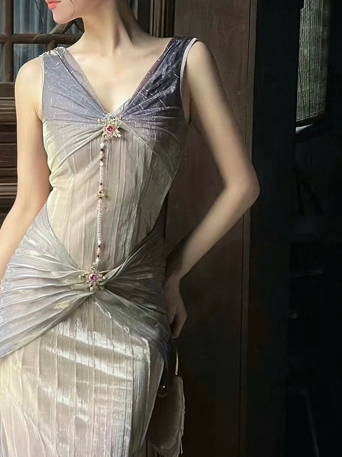 The muted gray-purple and soft gold gradient tones are understated yet sophisticated, ensuring the dress is both eye-catching and versatile. The lightweight, anti-see-through lining provides comfort and coverage, while the soft mesh fabric, with its silvery, mercerized sheen, completes the dress with a radiant glow. Perfect for making a statement with grace and style.