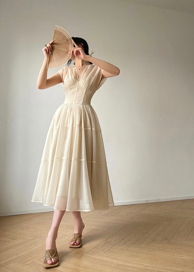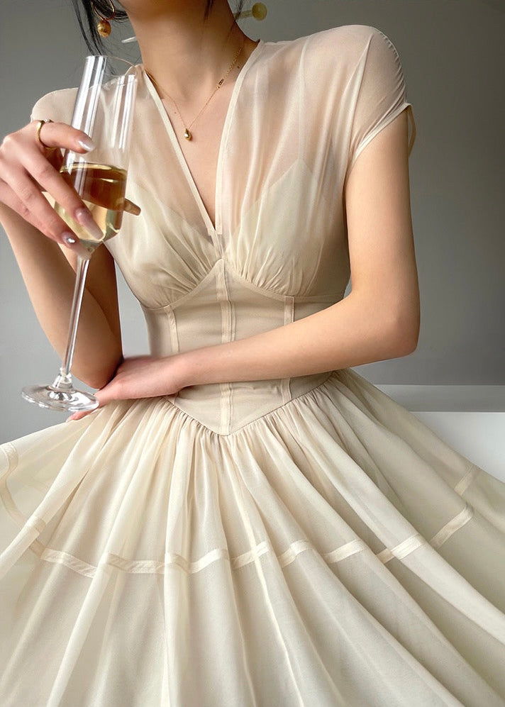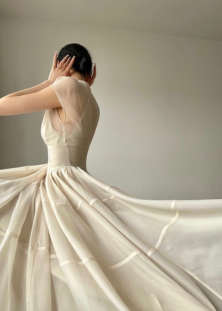 And then comes the skirt—a classic retro umbrella hem that sways with timeless charm, lined with soft milk-silk chiffon for comfort and coverage. The stitching? Clean, refined, and seamless—just how we like it.