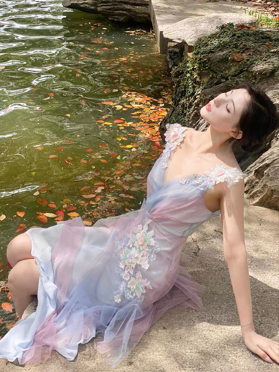 Crafted from layers of airy gradient tulle, the silhouette hugs the waist before flowing into our signature fishtail skirt—light as air with a romantic sway at every step. Each flower you see? Hand-placed, delicately cut from satin, chiffon, and tulle, then stitched with pearlescent beads and pastel gems to create a soft 3D garden across the bodice and hips—it’s the kind of intricate work we’re known for.