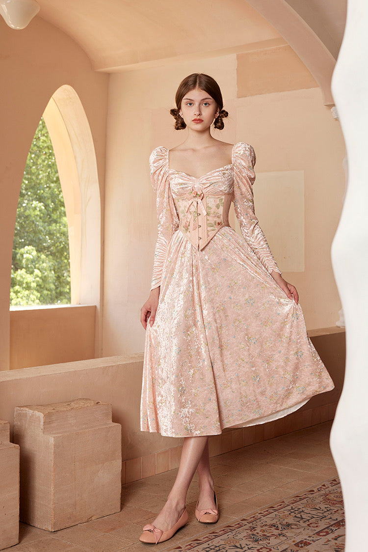 Made from silky-soft stretch velvet with a delicate pink floral print, the fabric has that subtle glisten we adore, like a candy wrapper catching the sun—comforting, whimsical, and a little bit nostalgic. The sweetheart bust is gently gathered to flatter all shapes, while the classic square neckline gives that signature French-girl elegance, framing your collarbones beautifully.
