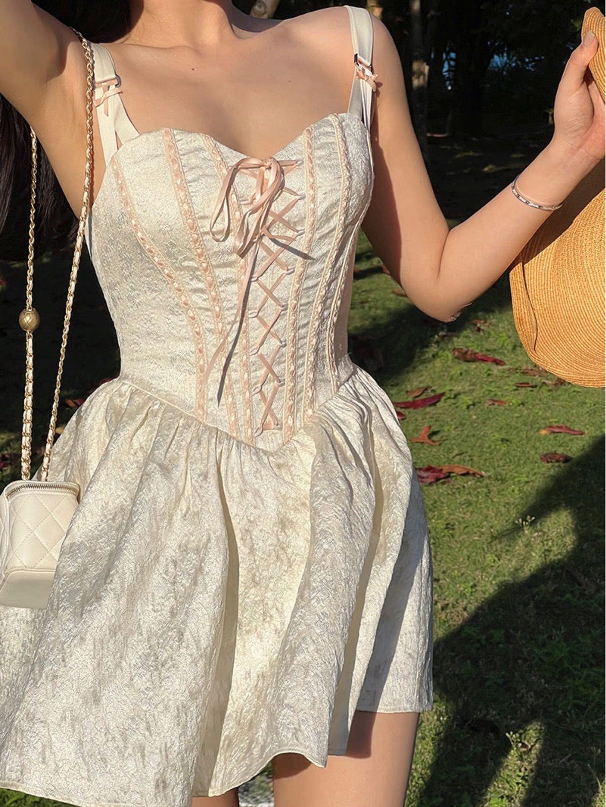 The skirt? Pure balletcore. A soft A-line silhouette with gathered pleats flares gently into a dreamy shape—voluminous yet weightless, with no petticoat needed. The fabric itself is a matte jacquard satin, textured with subtle floral embossing that catches the light just enough for that whisper of magic. It feels like dancing through a garden at golden hour.