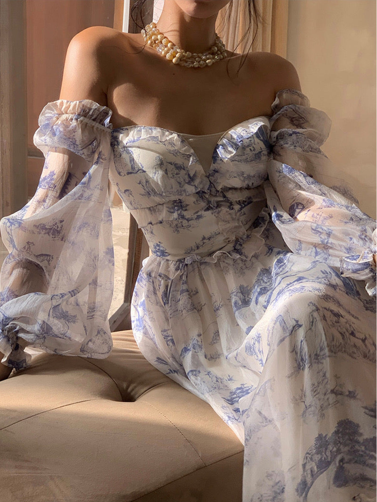 In a soft apricot hue decorated with vibrant blue motifs—think charming villages and galloping horses—the Louisiana dress evokes a fresh, pastoral vibe that's delightfully chic.
