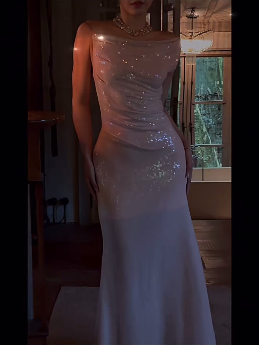 The Lafayette dress is pure magic—drenched in luminous sequins that shimmer like a starlit sky. One shoulder reveals a hint of skin with transparent threadwork, while the other is pleated from neckline to shoulder for an elegant contrast.