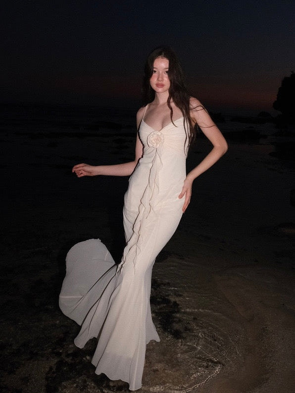 This elegant and romantic Owena dress is a perfect choice for vacations, blending style and sophistication effortlessly. Designed with just the right amount of skin exposure, the flowing fishtail skirt catches the breeze, creating a graceful silhouette with every step.