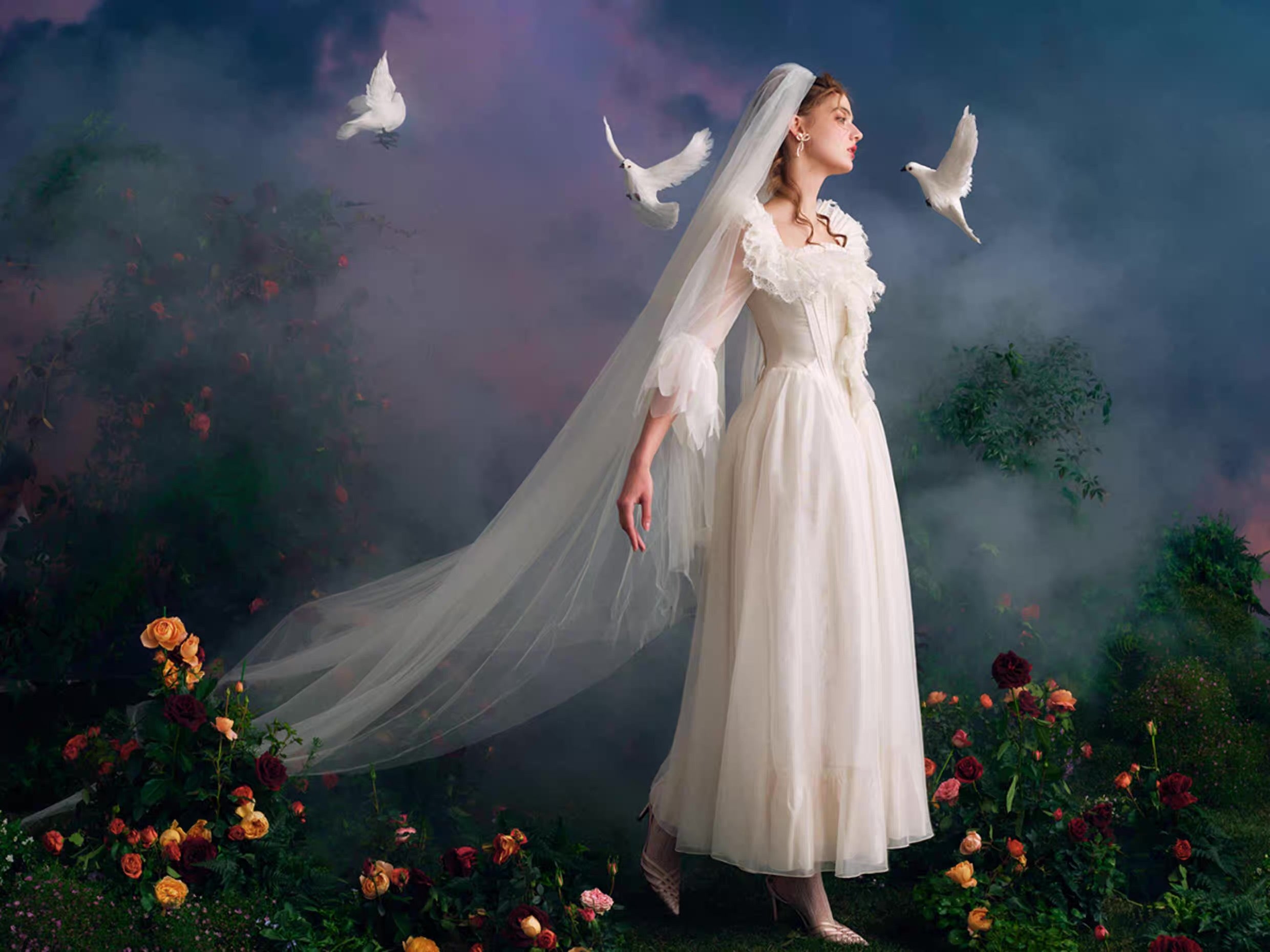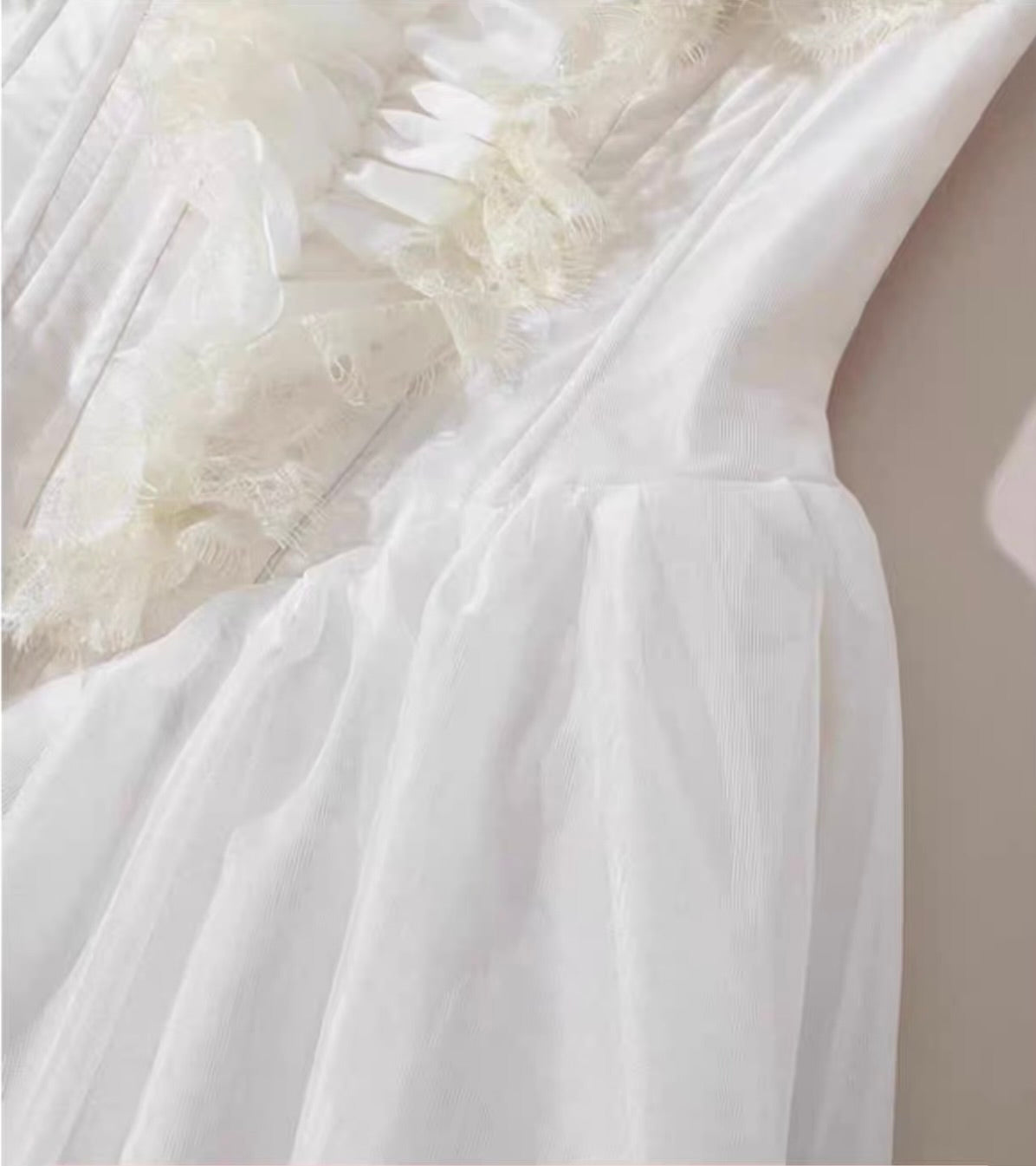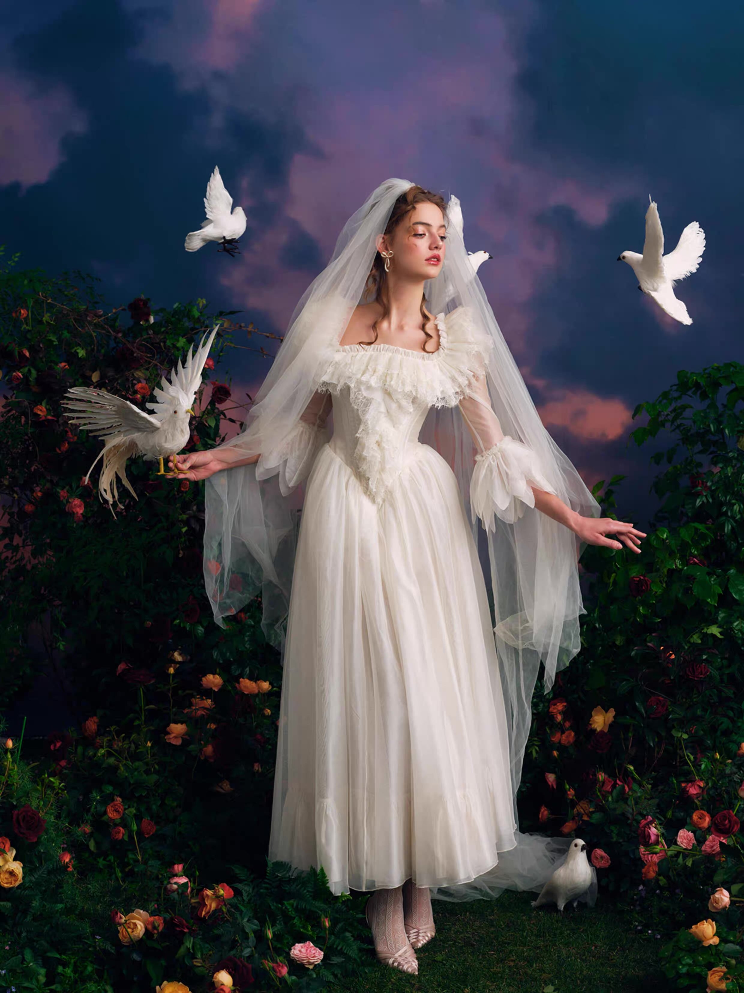 The multi-layered lace neckline is where the magic begins, inspired by Cupid’s feathers and designed to cradle the collarbone with romantic softness. You’ll notice how the vintage-inspired neckline subtly elongates the shoulders and neck, while intricate lace appliqué adds depth and old-world charm that feels truly special.