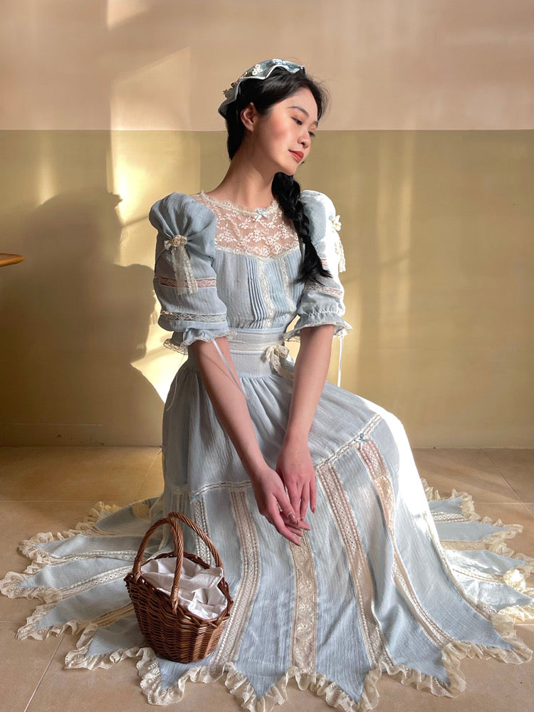 Crafted with seven distinct lace patterns, the dress features nearly 20 meters of lace along the hem for a stunning, intricate finish. The double-bud puff sleeves are designed with a draped cut and layered mesh, creating a full, voluminous look that’s both stylish and comfortable. A natural shell button adds a delicate touch at the back, while the hidden side zipper ensures easy wear.