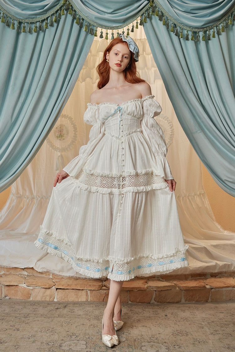 Thoughtful touches like fabric-covered mushroom buttons, scalloped lace trim at the hem, and a contrasting cotton ribbon you can tie to adjust the volume—every detail is designed to feel a little more special.