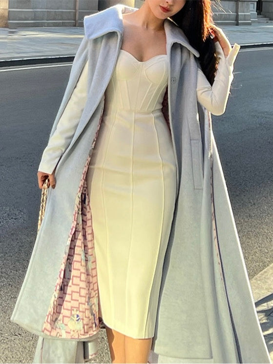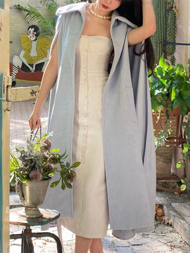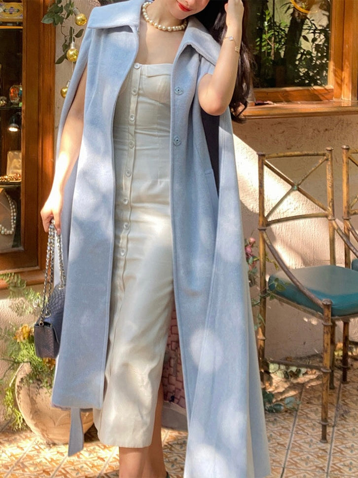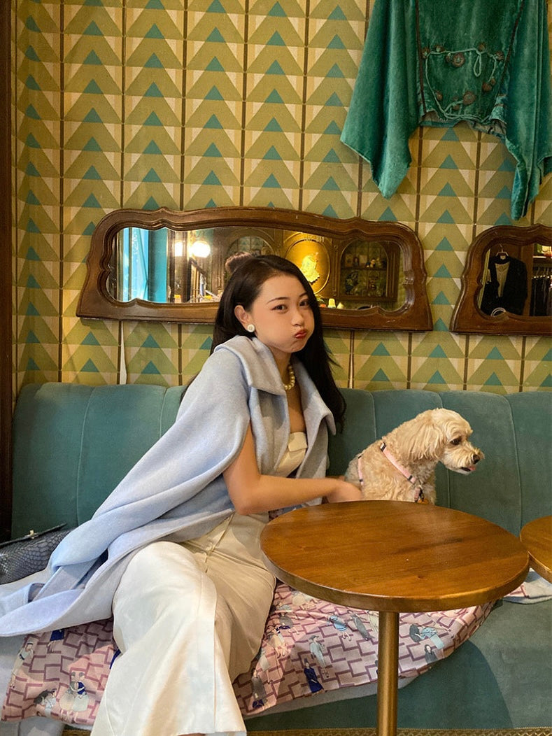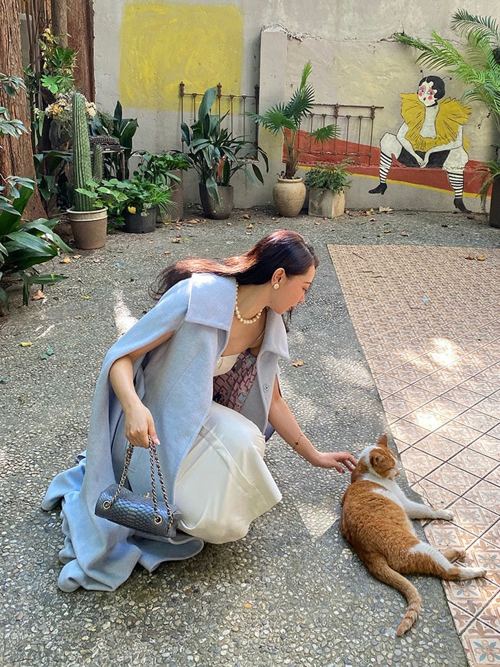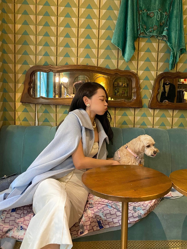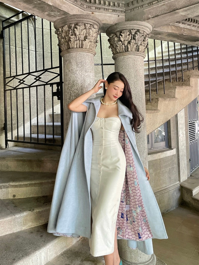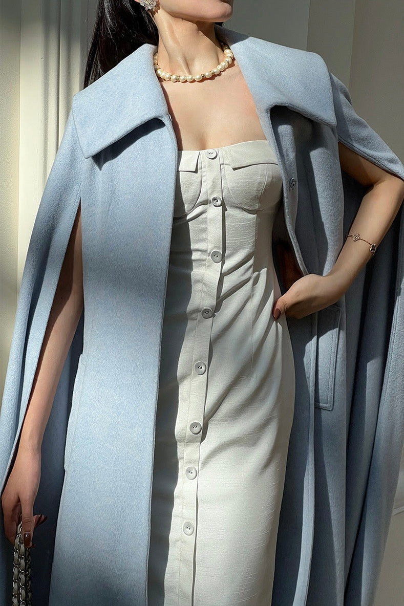The ice blue color exudes purity, evoking a sense of calm and clarity. Its transparent and vibrant hue adds a fresh and uplifting touch to the cooler autumn and winter months, while the simple, clean tailoring makes it a standout piece in any wardrobe.