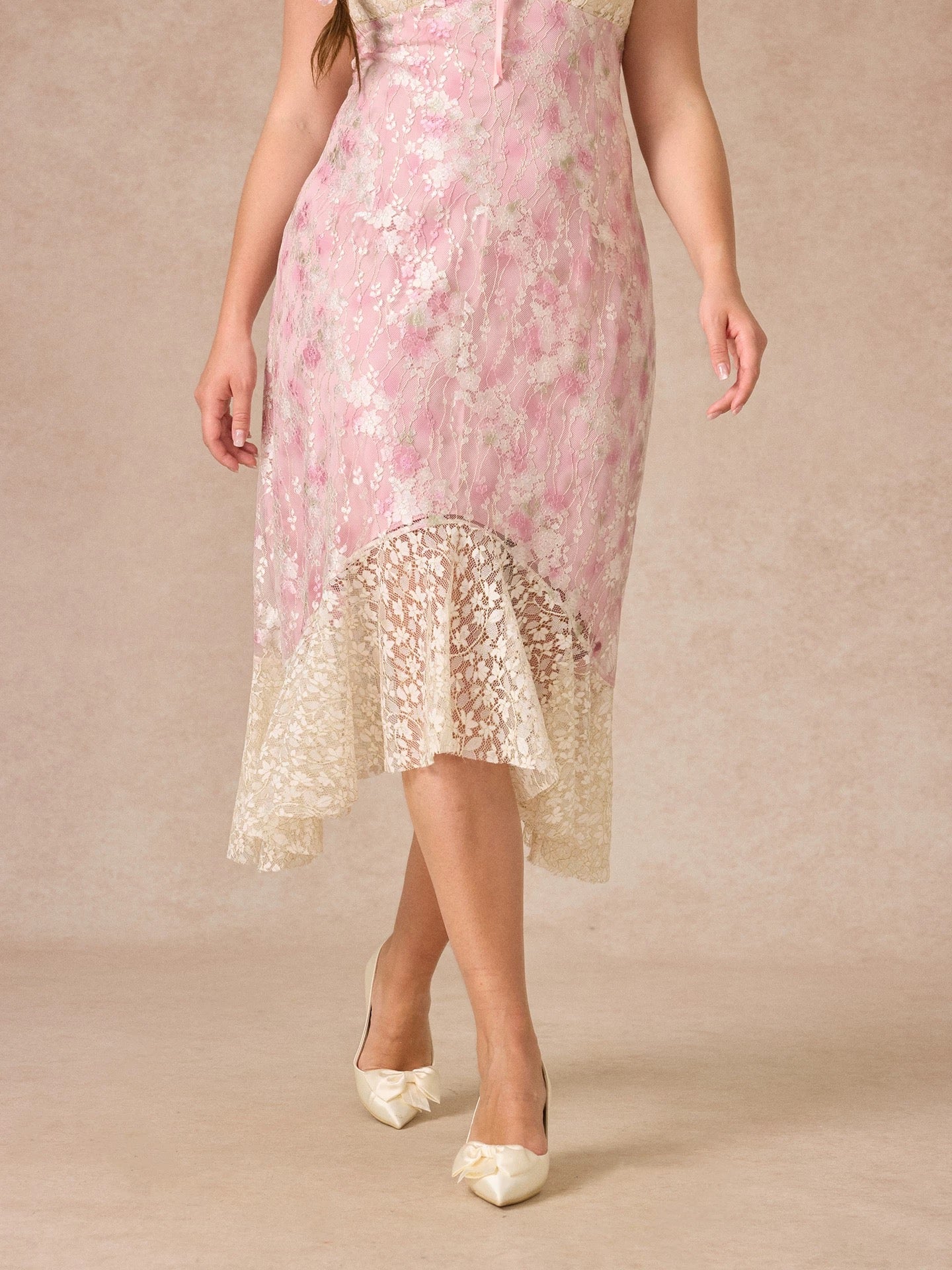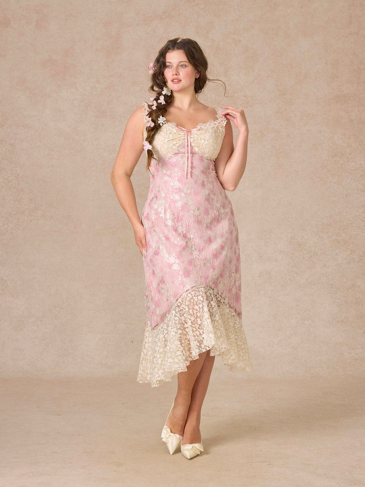 We designed ‘Botanical Muse’ with a fit-and-flare mermaid silhouette that defines the waist and flatters from every angle, finished with floral-shaped lace trim at the neckline and ribbon detailing for that layered, romantic touch. The lace-printed outer adds delicate depth, while the ruffle hem paneling brings floaty movement with every step.