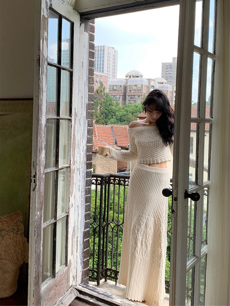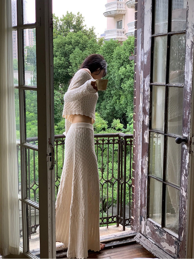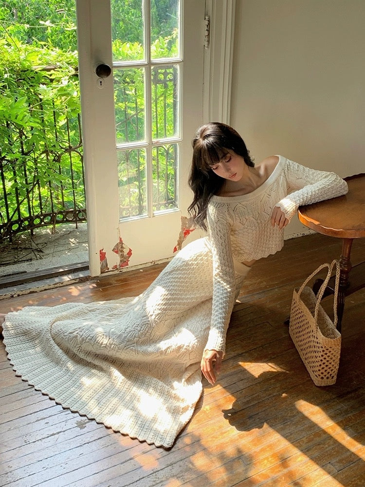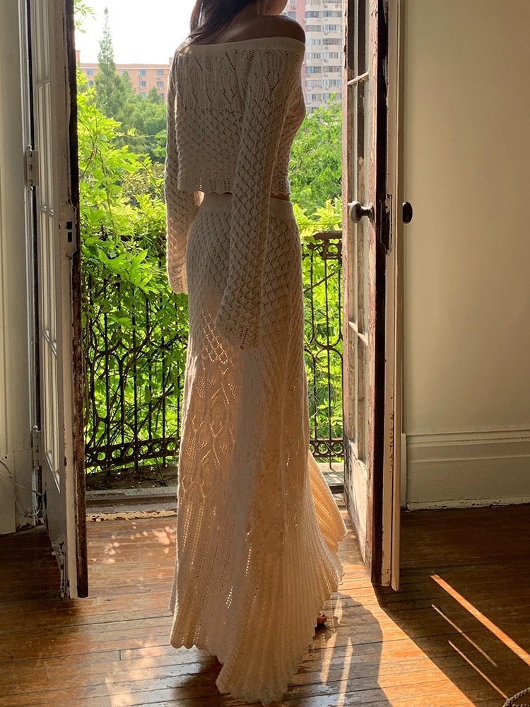‘Jourdaine’ set is everything we want to wear between seasons. This look is all about texture and airiness. The main body features a delicate mix of openwork knitting and subtle cable twists, carefully arranged in a rhythmic pattern that feels both refined and playful. At the hem, a lattice style stitch adds contrast and charm, giving the entire set a polished, hand finished feel.