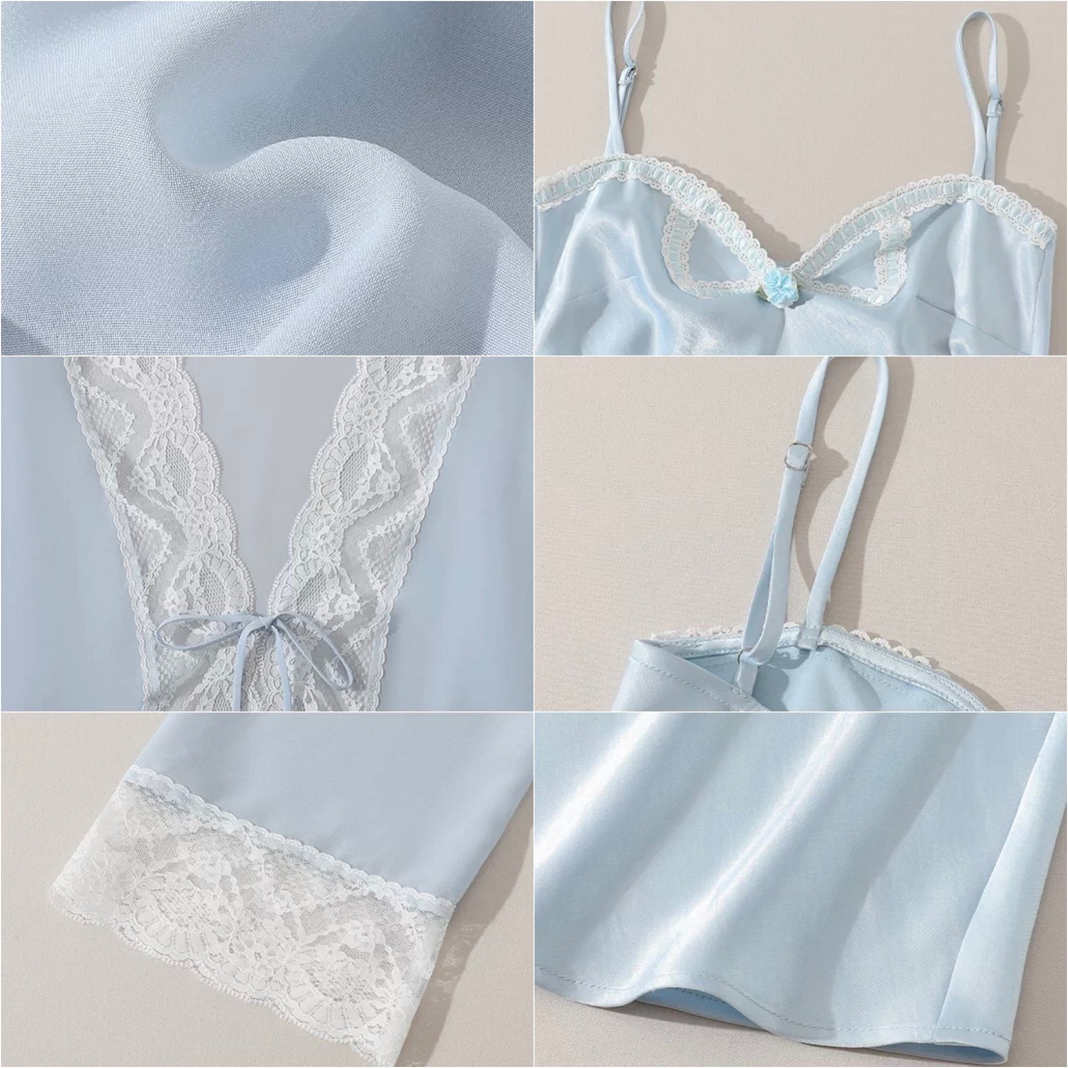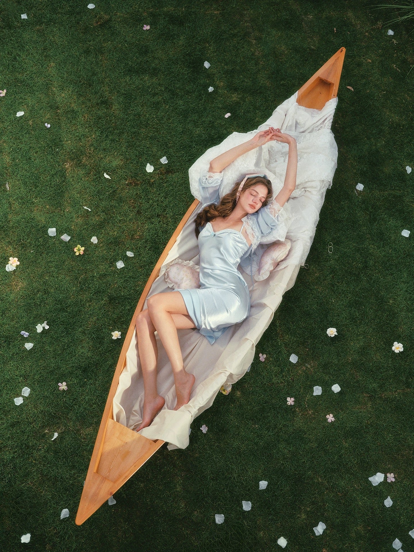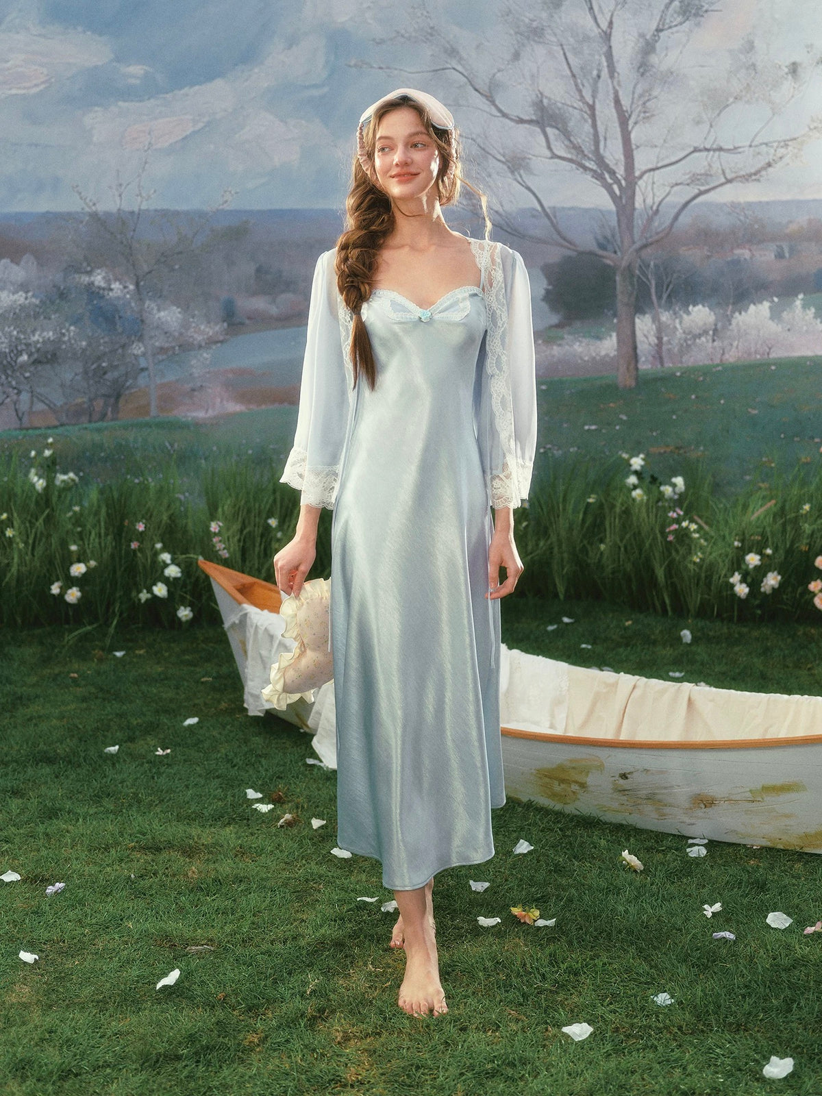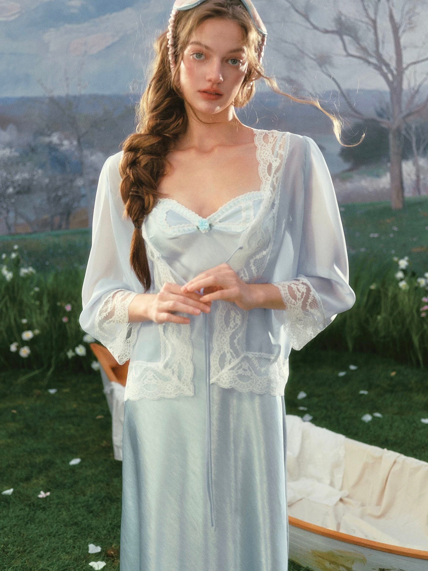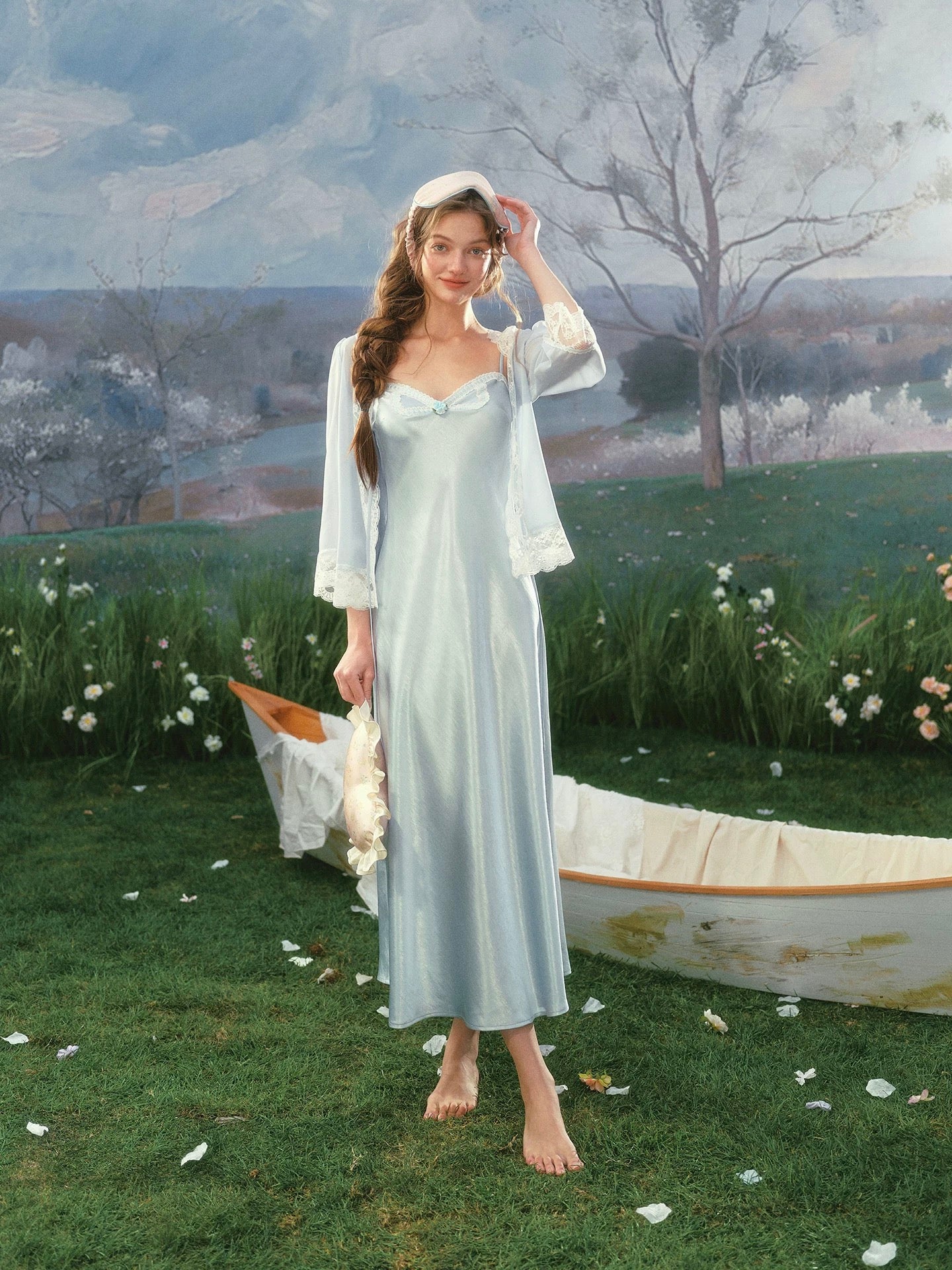 You’ll love how the set balances relaxed charm with refined detail: the subtle sheen, the scalloped lace, the way the cut follows your figure without ever clinging. Wear ‘Melinda’ at home, on slow weekends, or for those softly dressed up moments when comfort still matters.