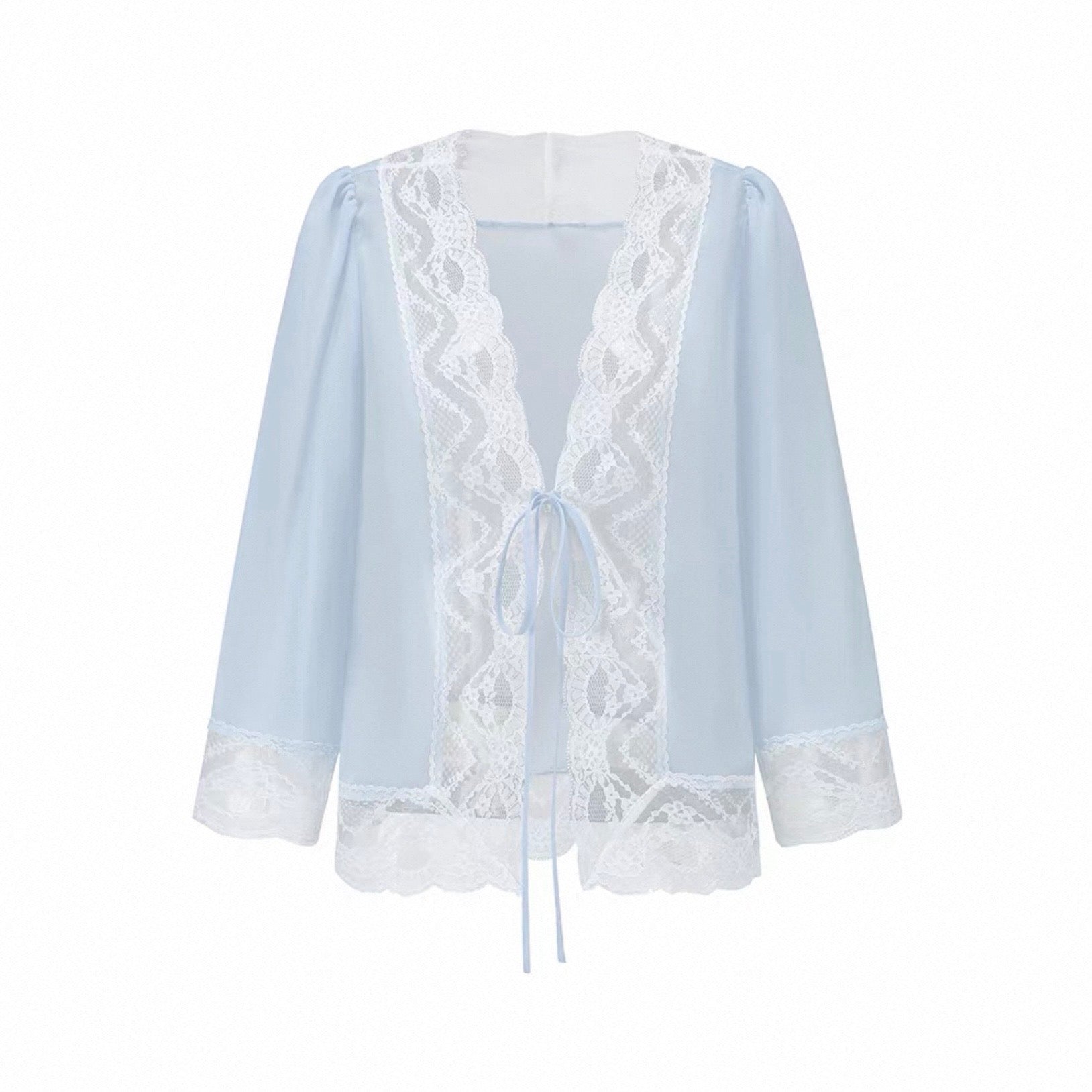 Slip on the airy eight tenth length cardigan and you’ll feel the instant ease of softly gathered sleeves. Vintage inspired lace traces the front edge, cuffs, and hem, tying at the bust with a dainty ribbon that lets you decide how open or relaxed the layer should be.