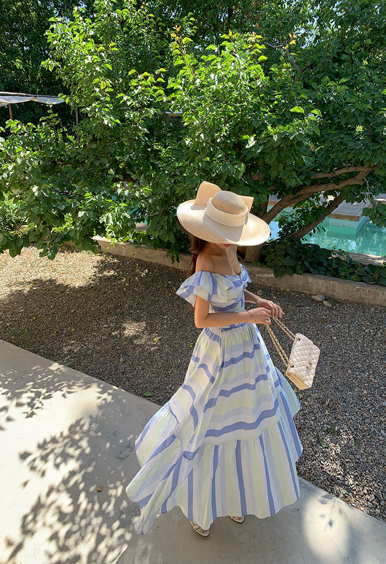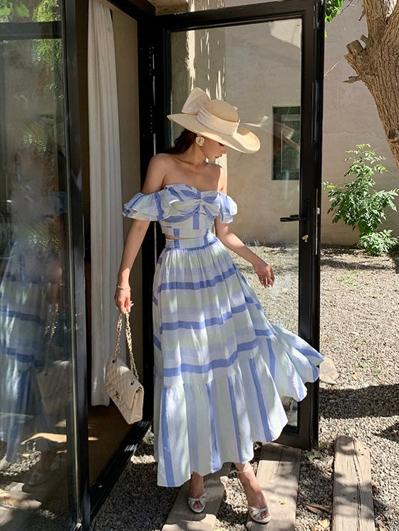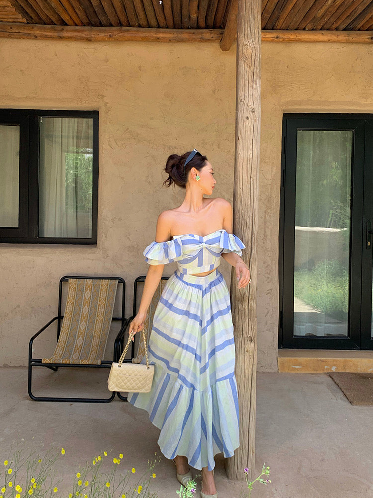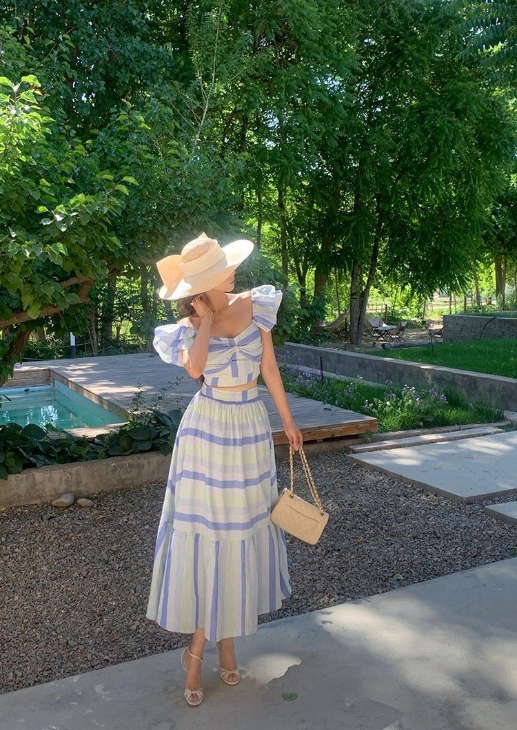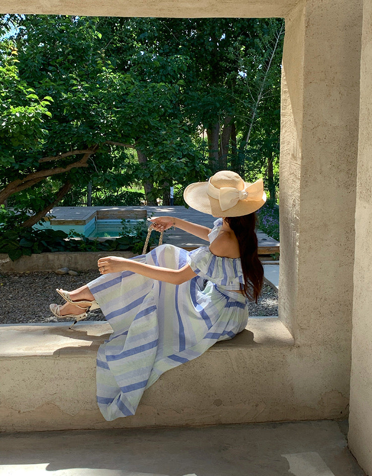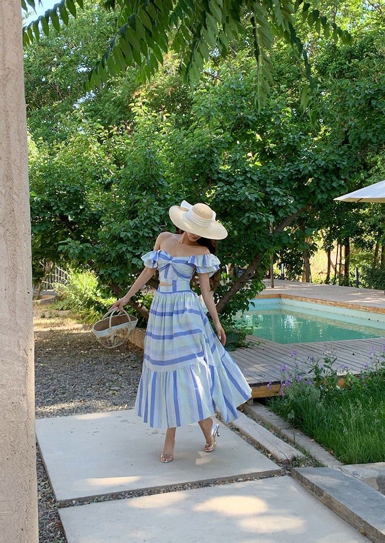 The reversible, double-layered ruffles gracefully enhance the bust, offering a flattering and flexible fit perfect for summer days. A sculptural bow at the chest adds a playful yet elegant touch, embodying a feminine charm. The A-line skirt beautifully shapes the lower body, infusing the look with an air of romantic elegance.