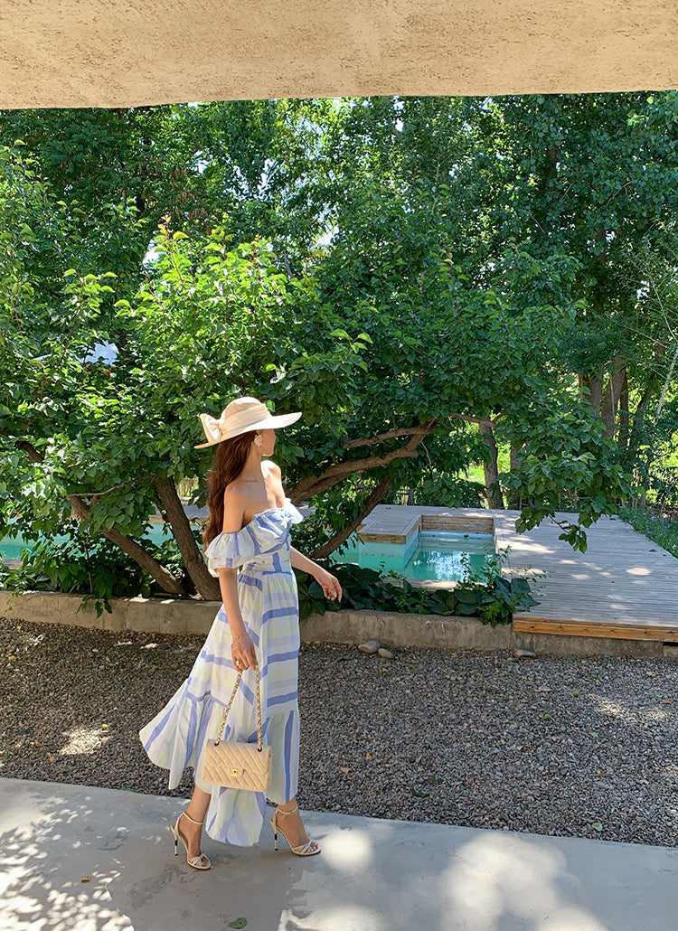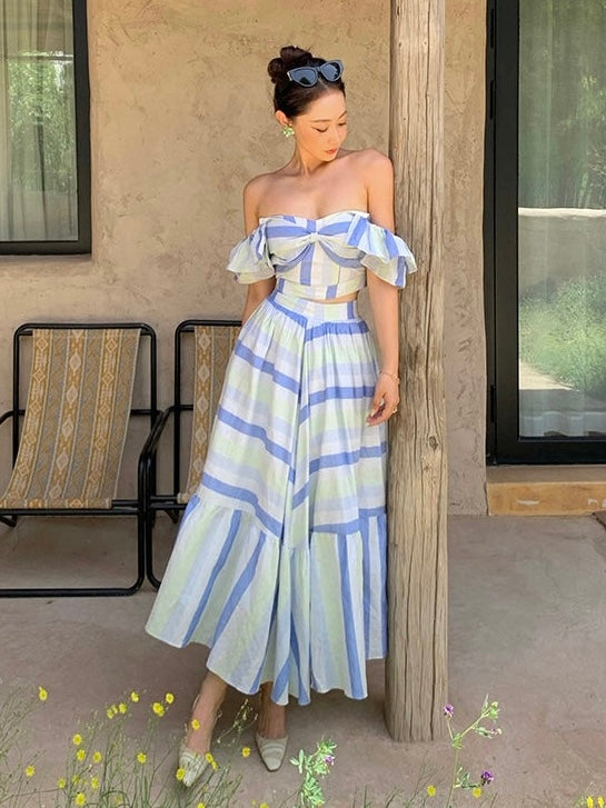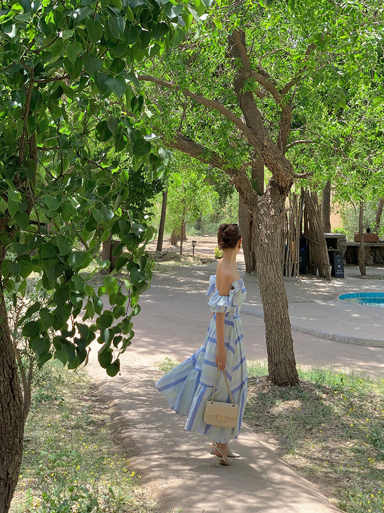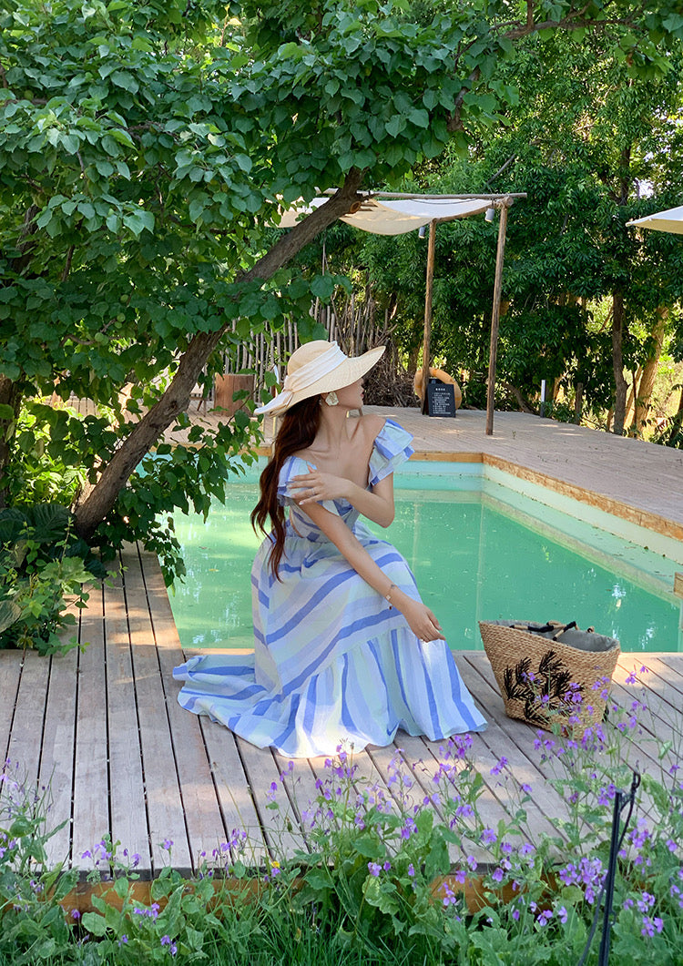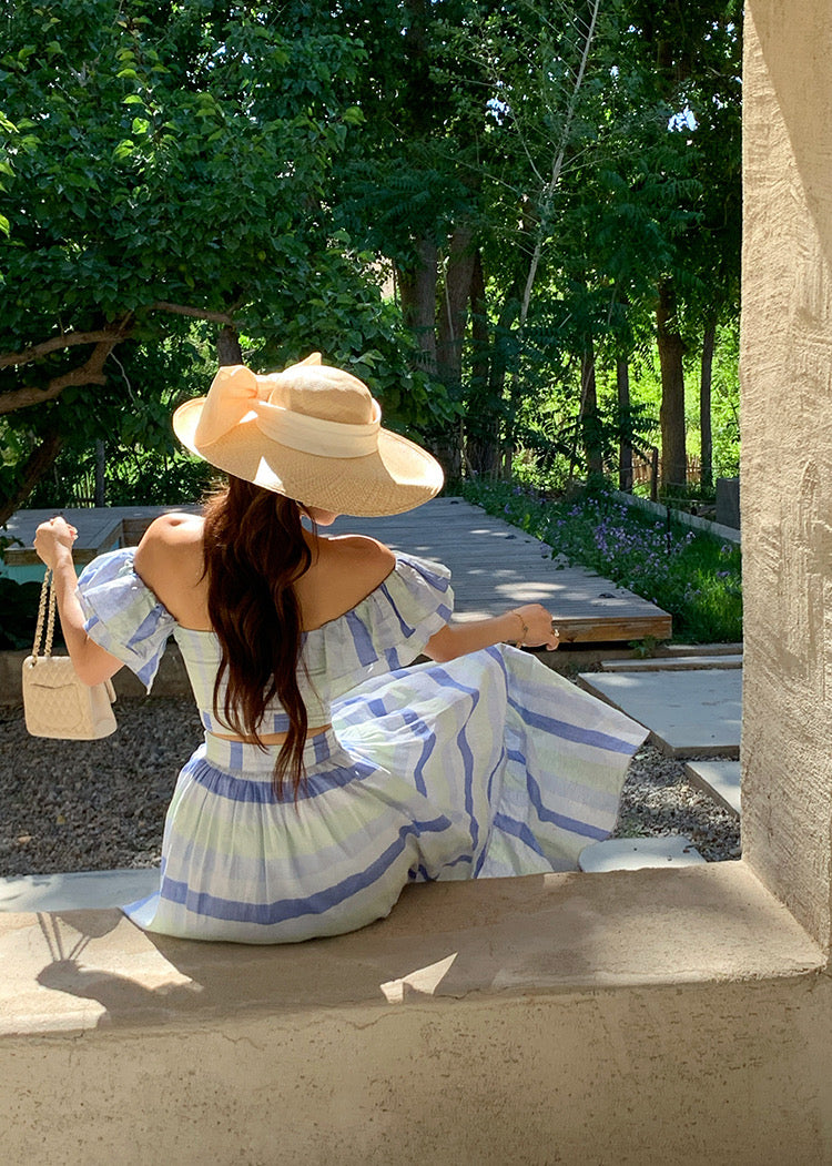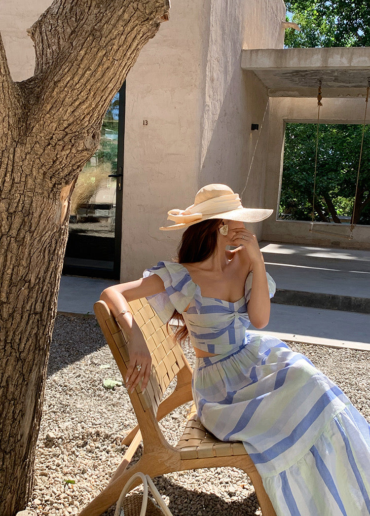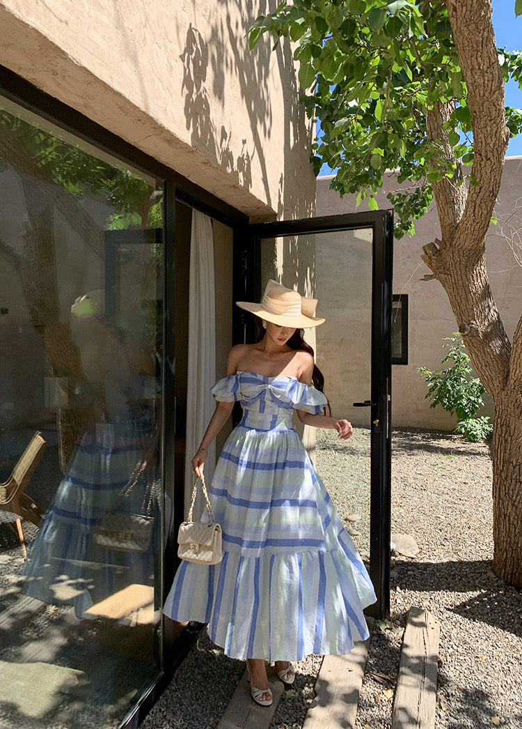 The reversible, double-layered ruffles gracefully enhance the bust, offering a flattering and flexible fit perfect for summer days. A sculptural bow at the chest adds a playful yet elegant touch, embodying a feminine charm. The A-line skirt beautifully shapes the lower body, infusing the look with an air of romantic elegance.