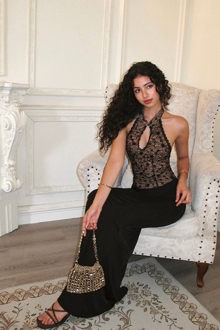 A halter qipao collar nods to Eastern elegance while the keyhole front teases a glimpse of skin; beneath the black floral lace, our nude-gold lining melts into your tone and lets every jet-black paillette catch candlelight like tiny constellations.