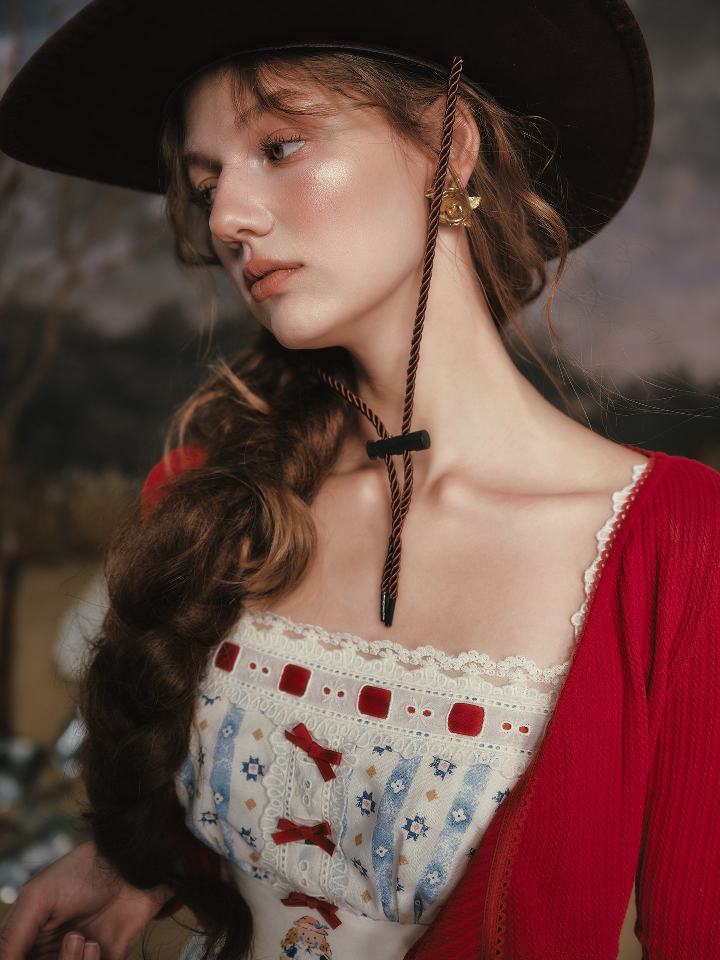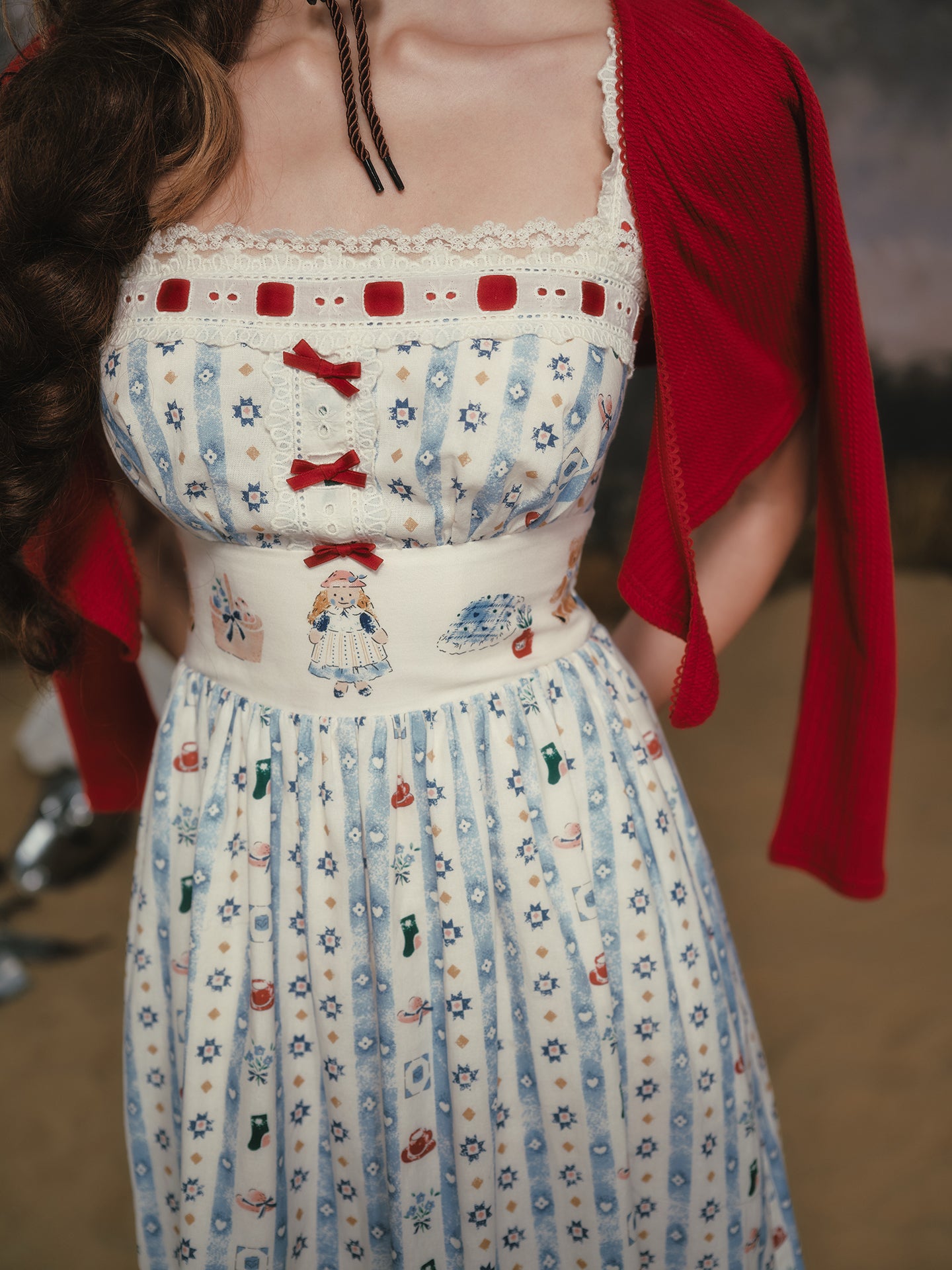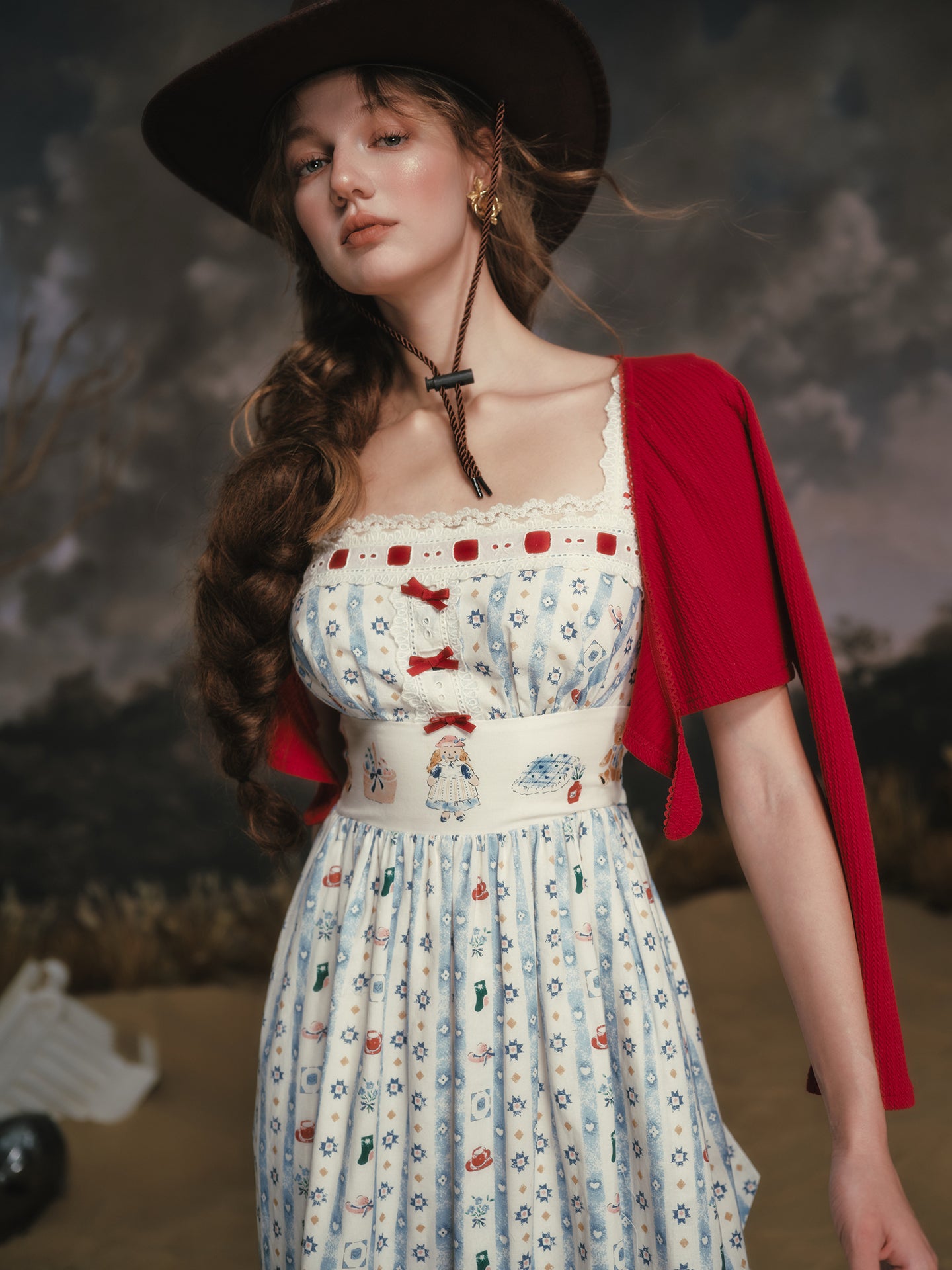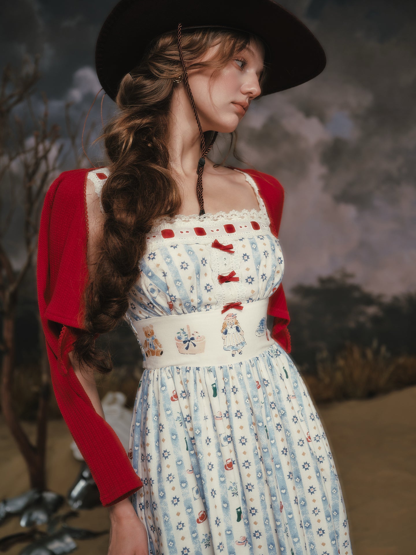 We spun this midi dress from pure, breathable cotton, think sunshine-soft against the skin—then scattered it with the sweetest storybook print, tiny teacups, stars and those nostalgic toy motifs that make you smile before your first sip of lavender lemonade. Our scallop-lace neckline meets rows of velvet-ribbon eyelets and dainty red bows, adding just the right pop of colour (and yes, that lace is custom-embroidered for us).
