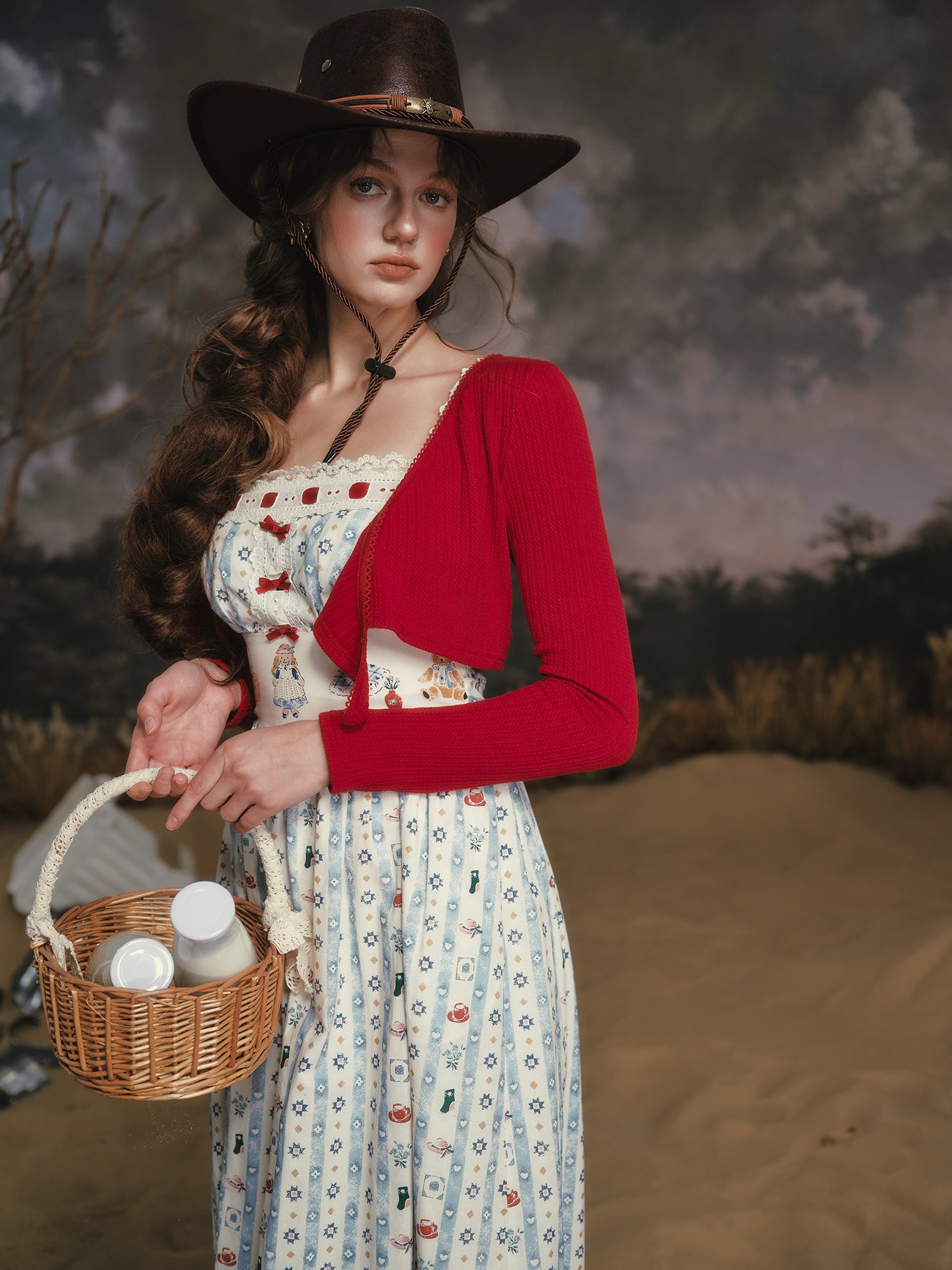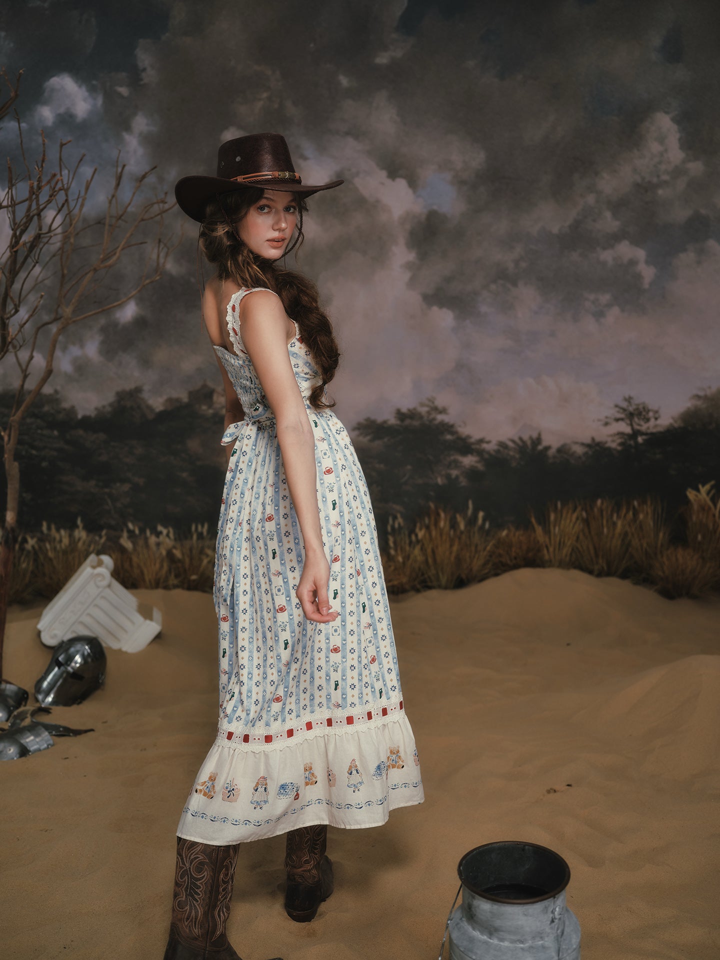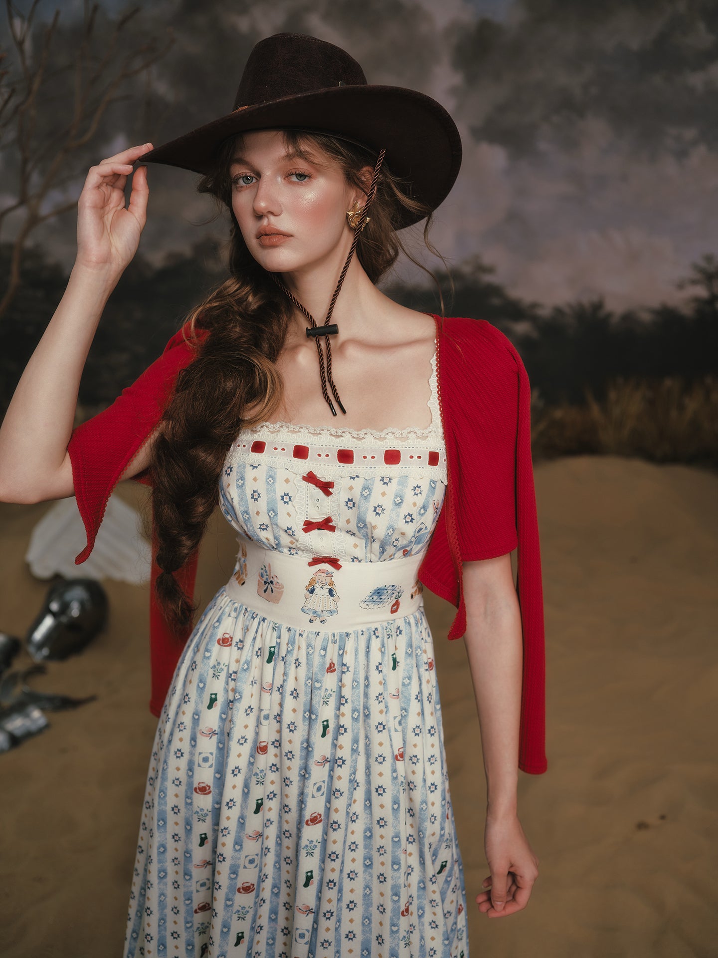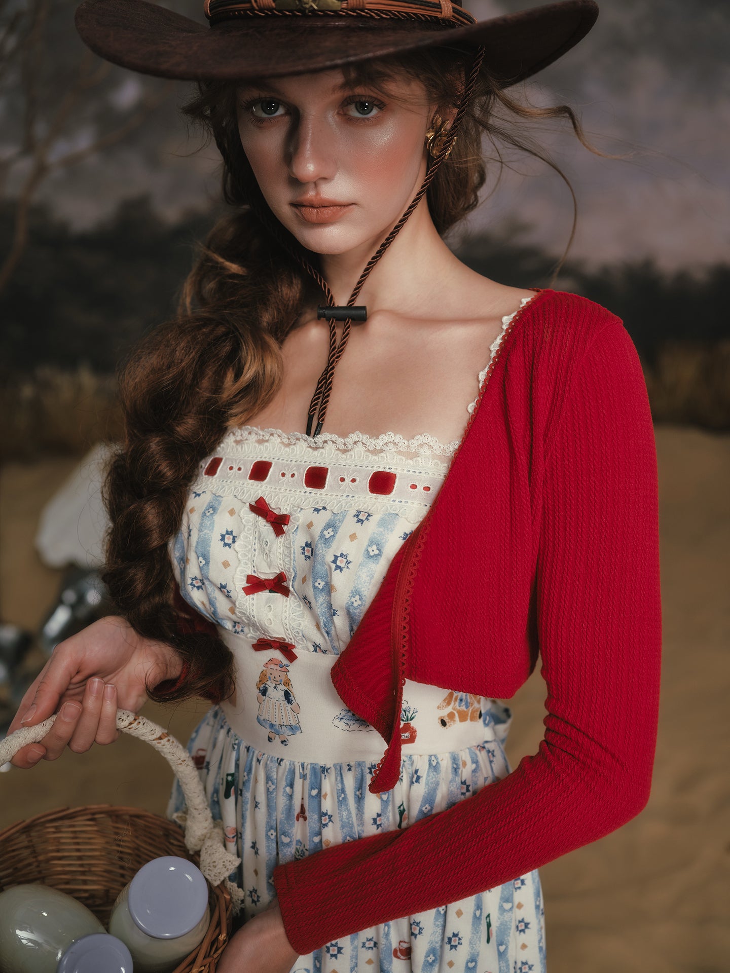 We spun this midi dress from pure, breathable cotton, think sunshine-soft against the skin—then scattered it with the sweetest storybook print, tiny teacups, stars and those nostalgic toy motifs that make you smile before your first sip of lavender lemonade. Our scallop-lace neckline meets rows of velvet-ribbon eyelets and dainty red bows, adding just the right pop of colour (and yes, that lace is custom-embroidered for us).