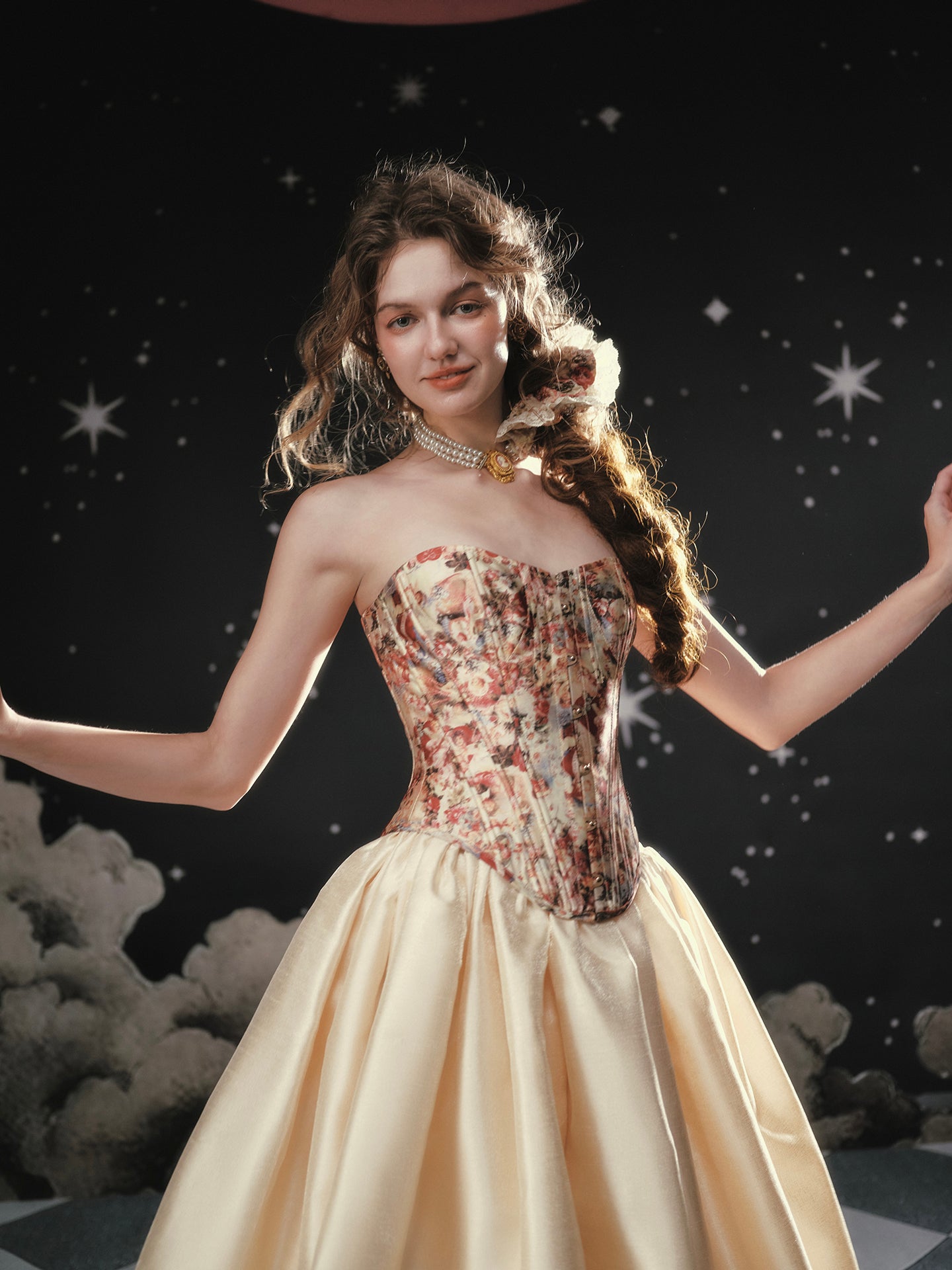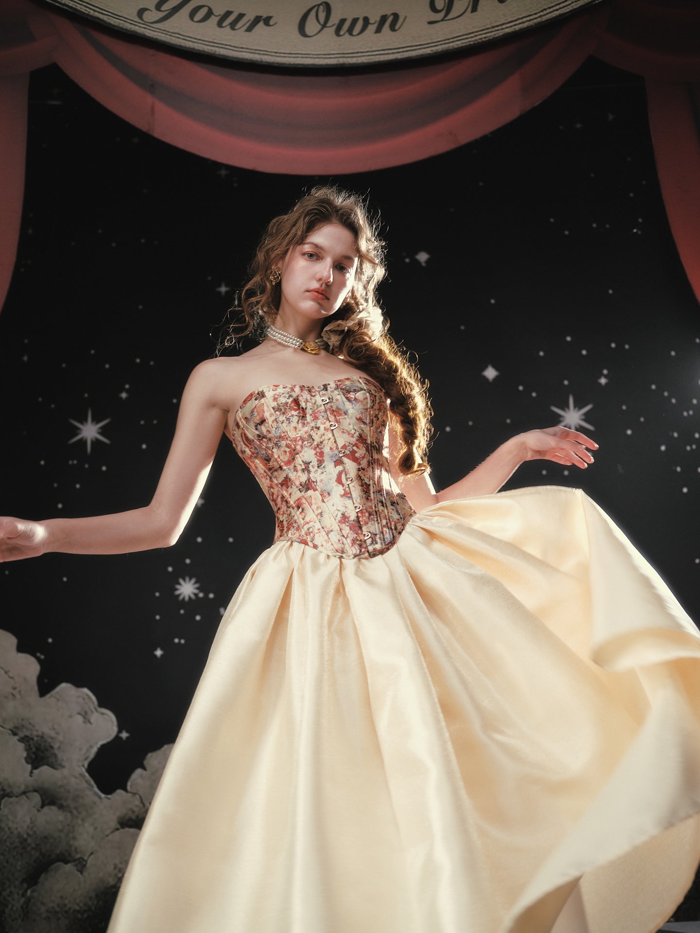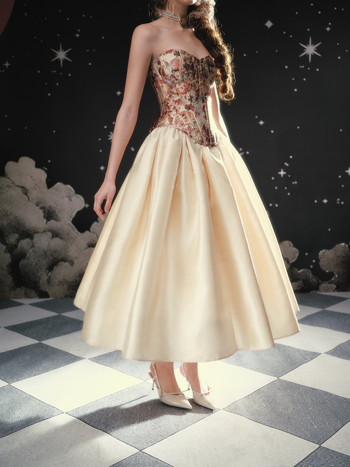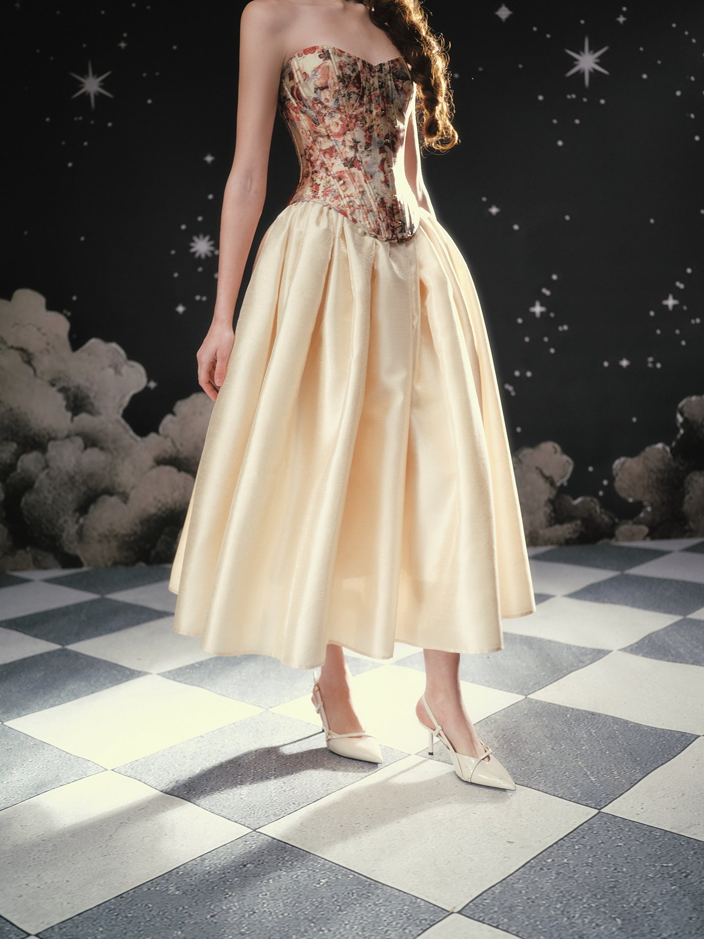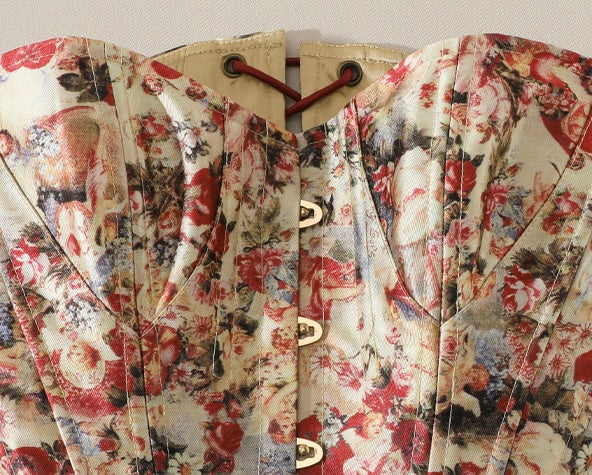 A blush-tinted tapestry, sculpted to flatter, ‘Fallen Cupid’ turns vintage romance into pure modern mischief. Woven from lustrous duchess satin printed with faded florals, the strapless silhouette curves into a gentle sweetheart before dipping to a pointed basque waist that sharpens every angle. Hidden steel boning traces the seams, cinching softly and keeping everything poised (no slipping, no tugging).