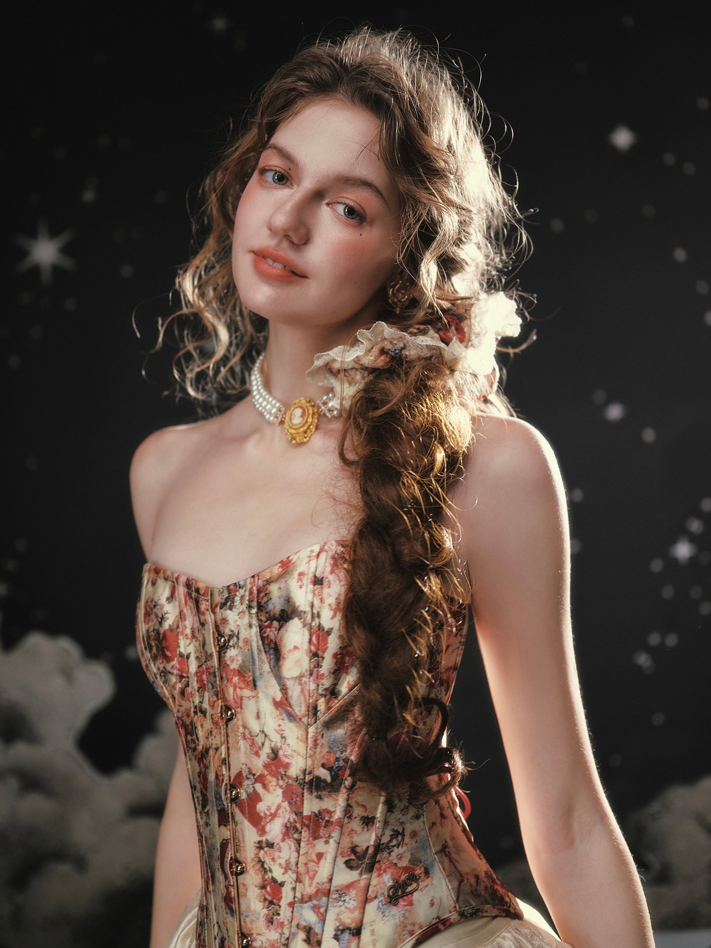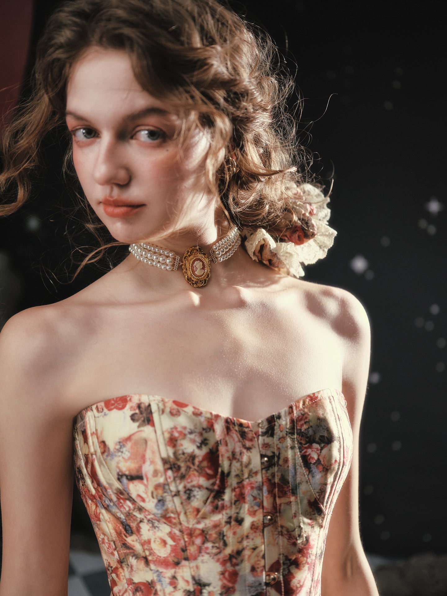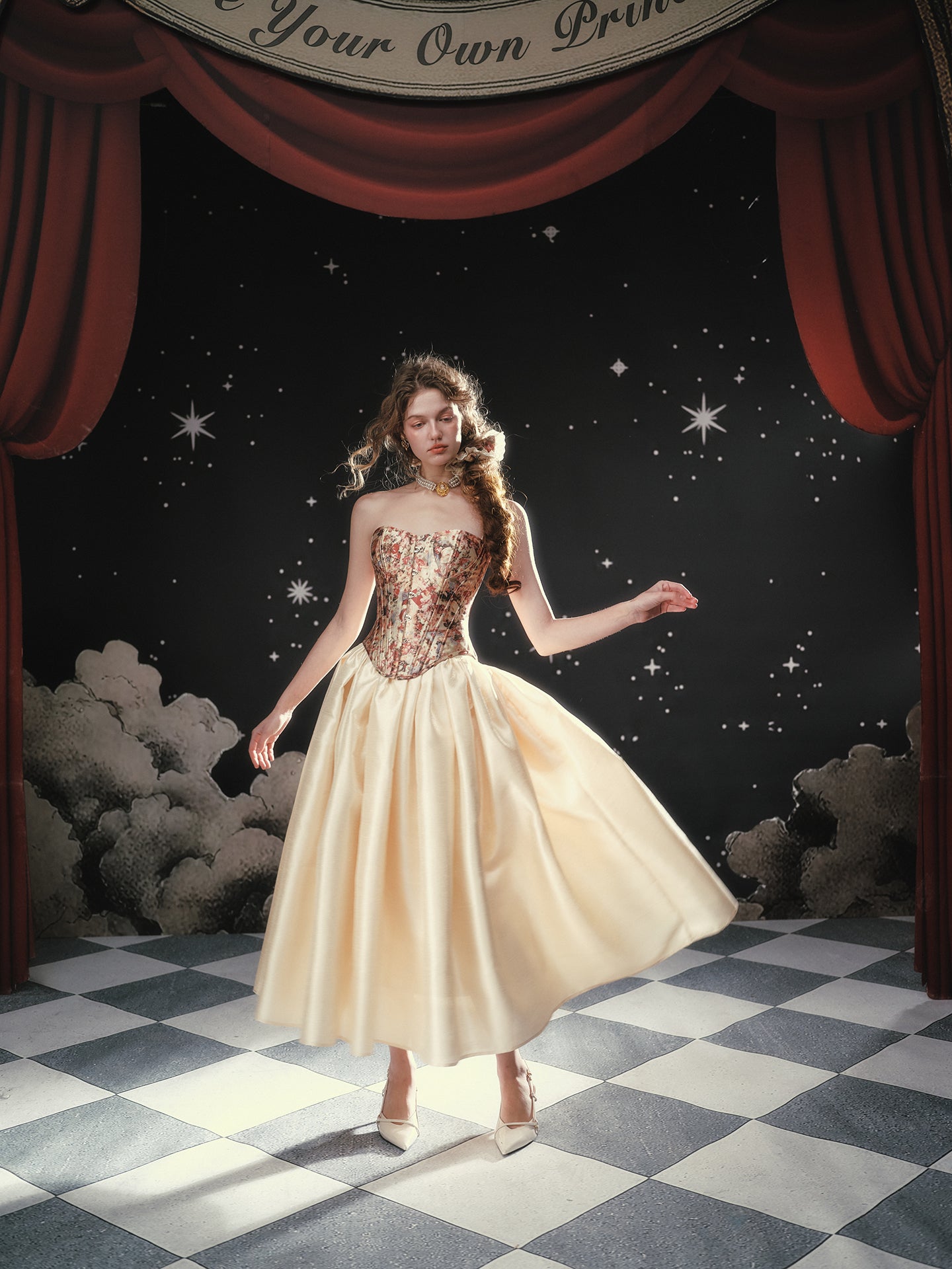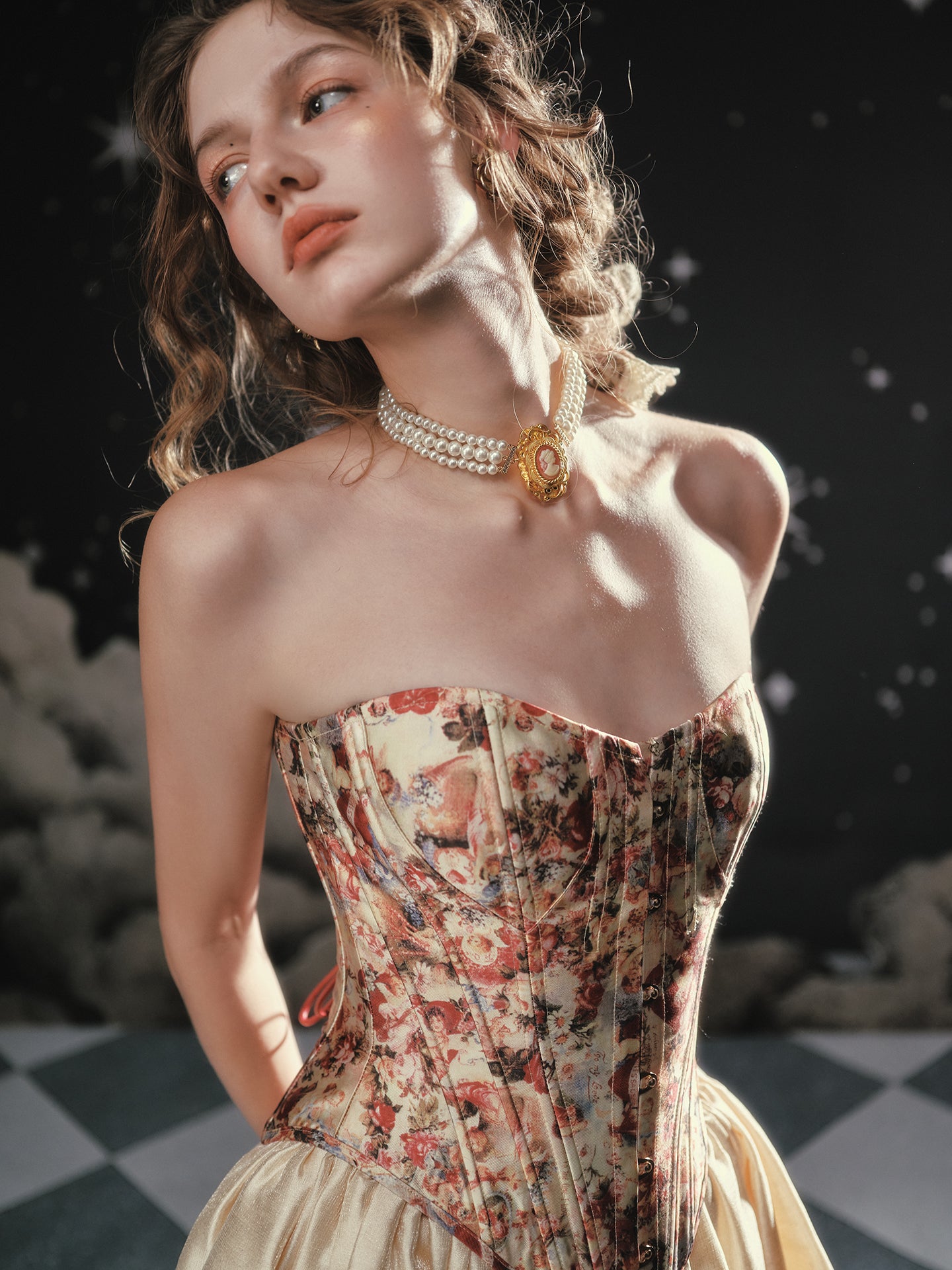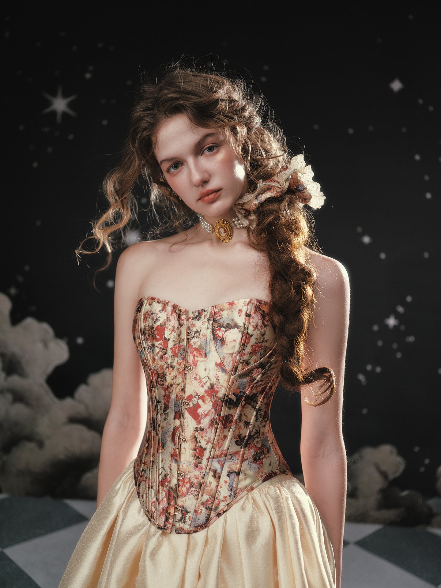A blush-tinted tapestry, sculpted to flatter, ‘Fallen Cupid’ turns vintage romance into pure modern mischief. Woven from lustrous duchess satin printed with faded florals, the strapless silhouette curves into a gentle sweetheart before dipping to a pointed basque waist that sharpens every angle. Hidden steel boning traces the seams, cinching softly and keeping everything poised (no slipping, no tugging).