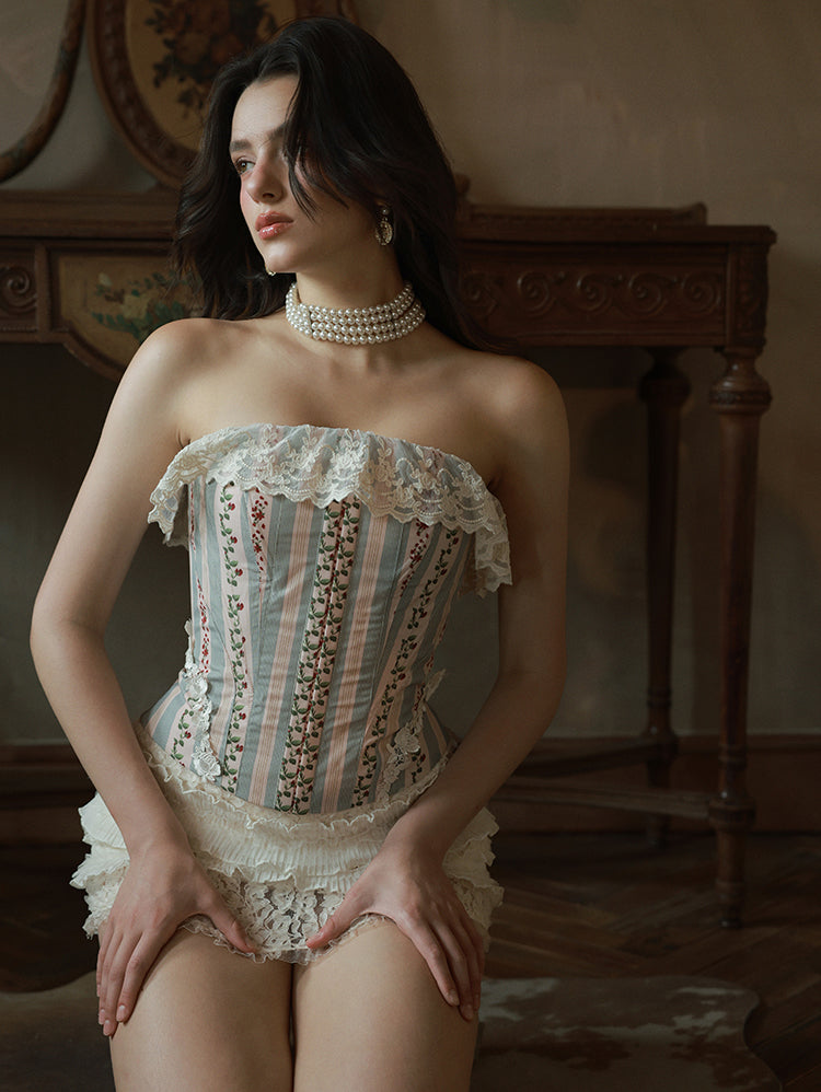 You can feel the love in every stitch: from its precision-matched vertical stripes to the fine floral embroidery climbing through each line, every detail of ‘Gilmore’ is crafted with care. Our signature boning is tucked along both sides of each seam, giving you that structured silhouette without any tightness or discomfort, because beauty should feel just as good as it looks.