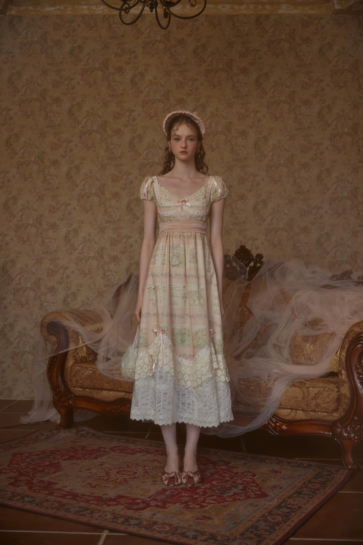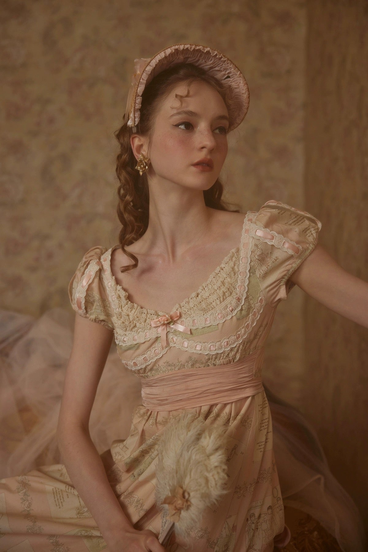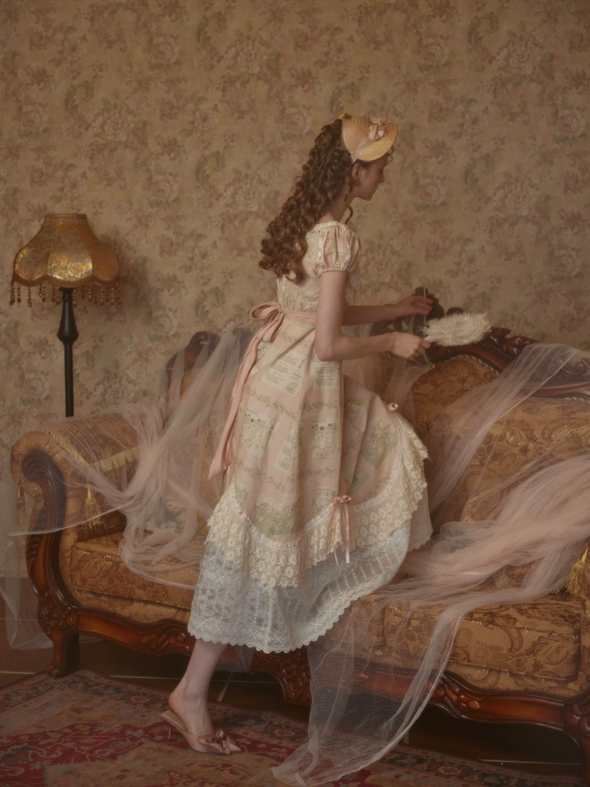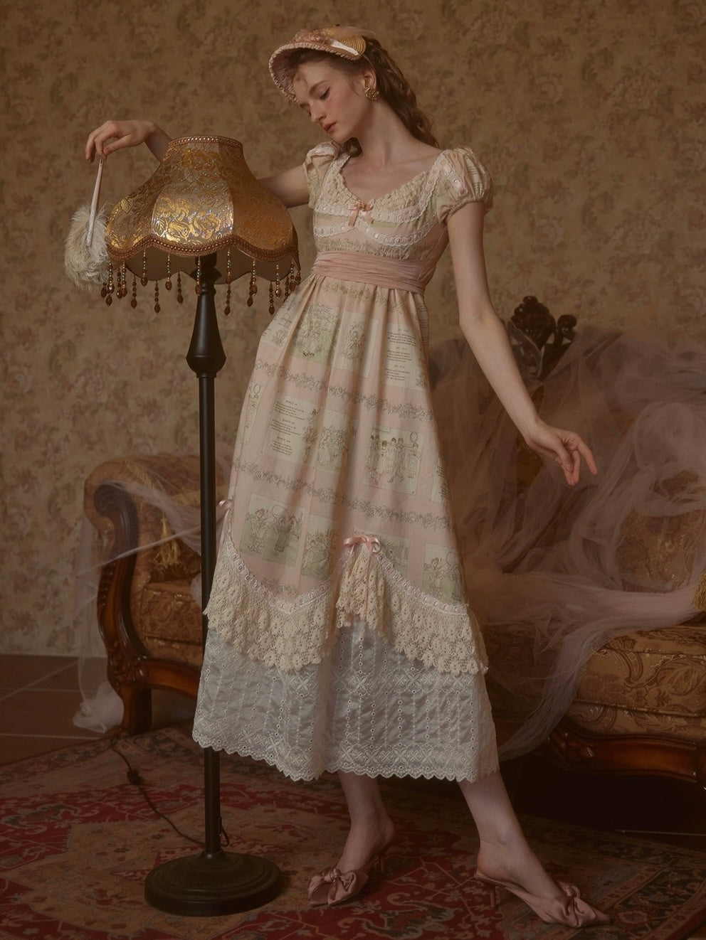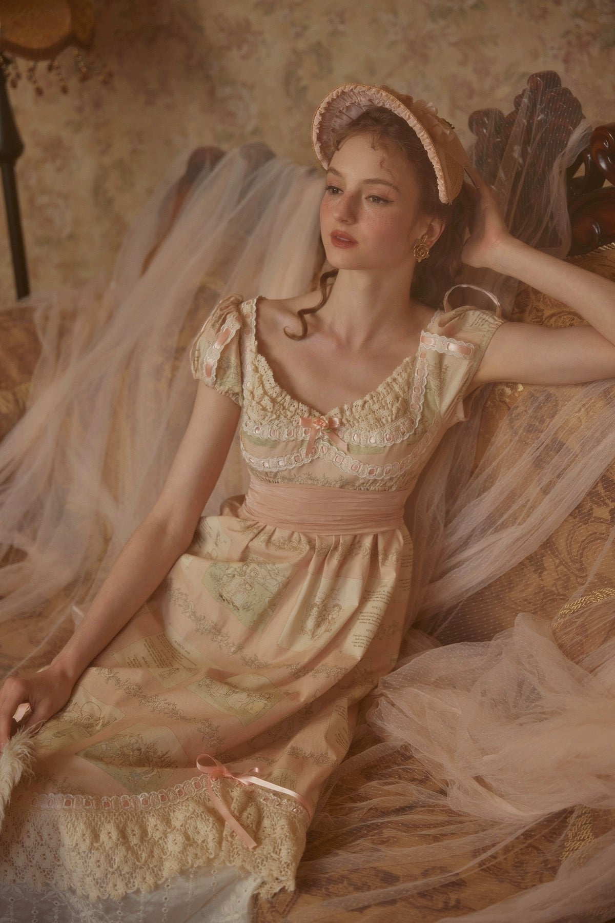 The skirt is elegantly spliced with vintage lace, and the wavy hem adds a romantic, graceful touch. The puffed princess sleeves enhance your shoulder shape, offering a flattering look. An invisible zipper at the back ensures easy wear and a seamless finish.