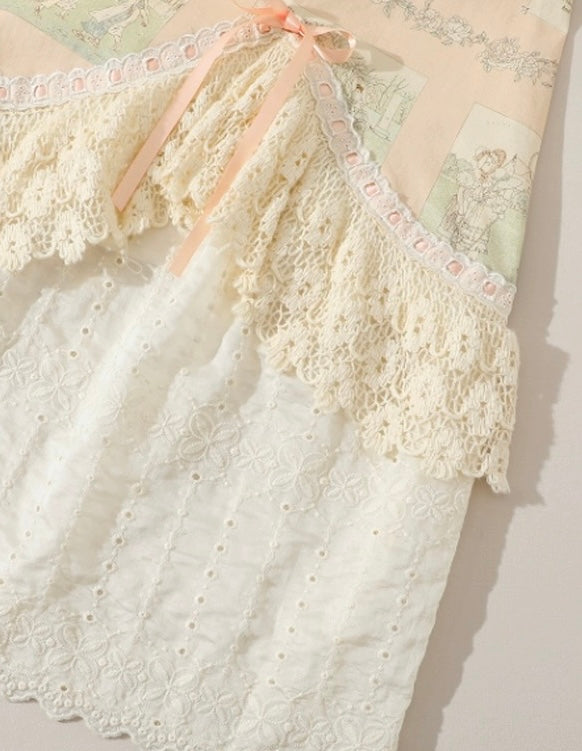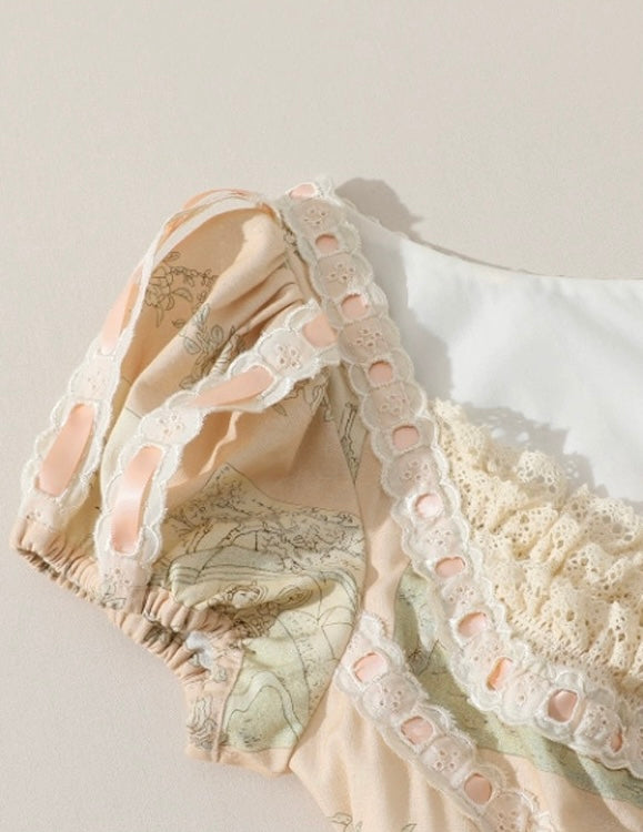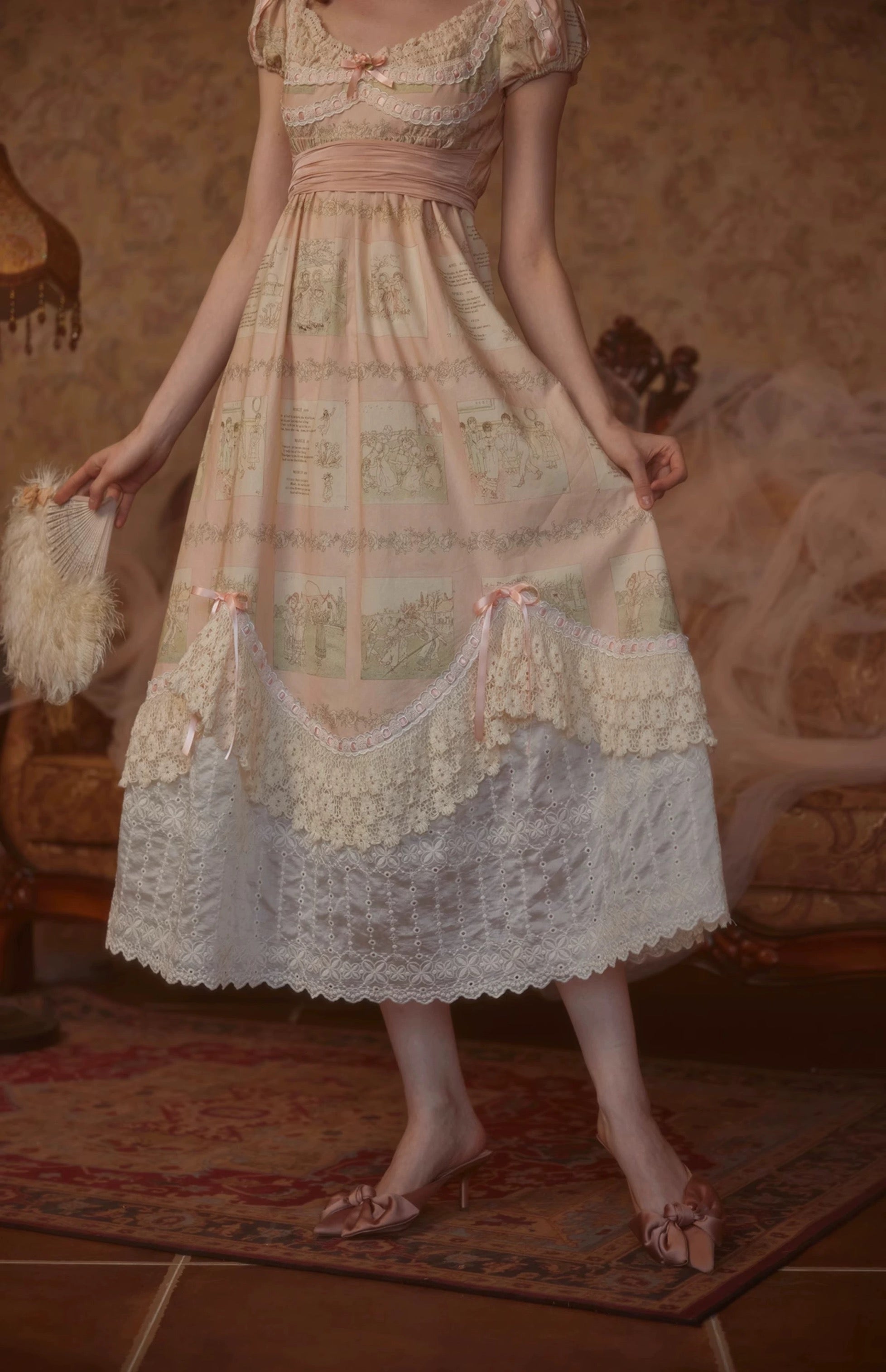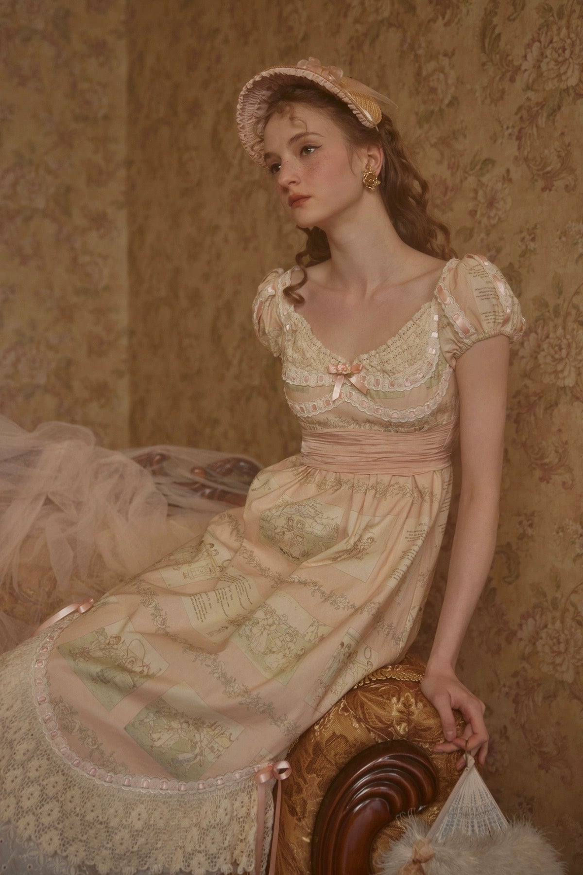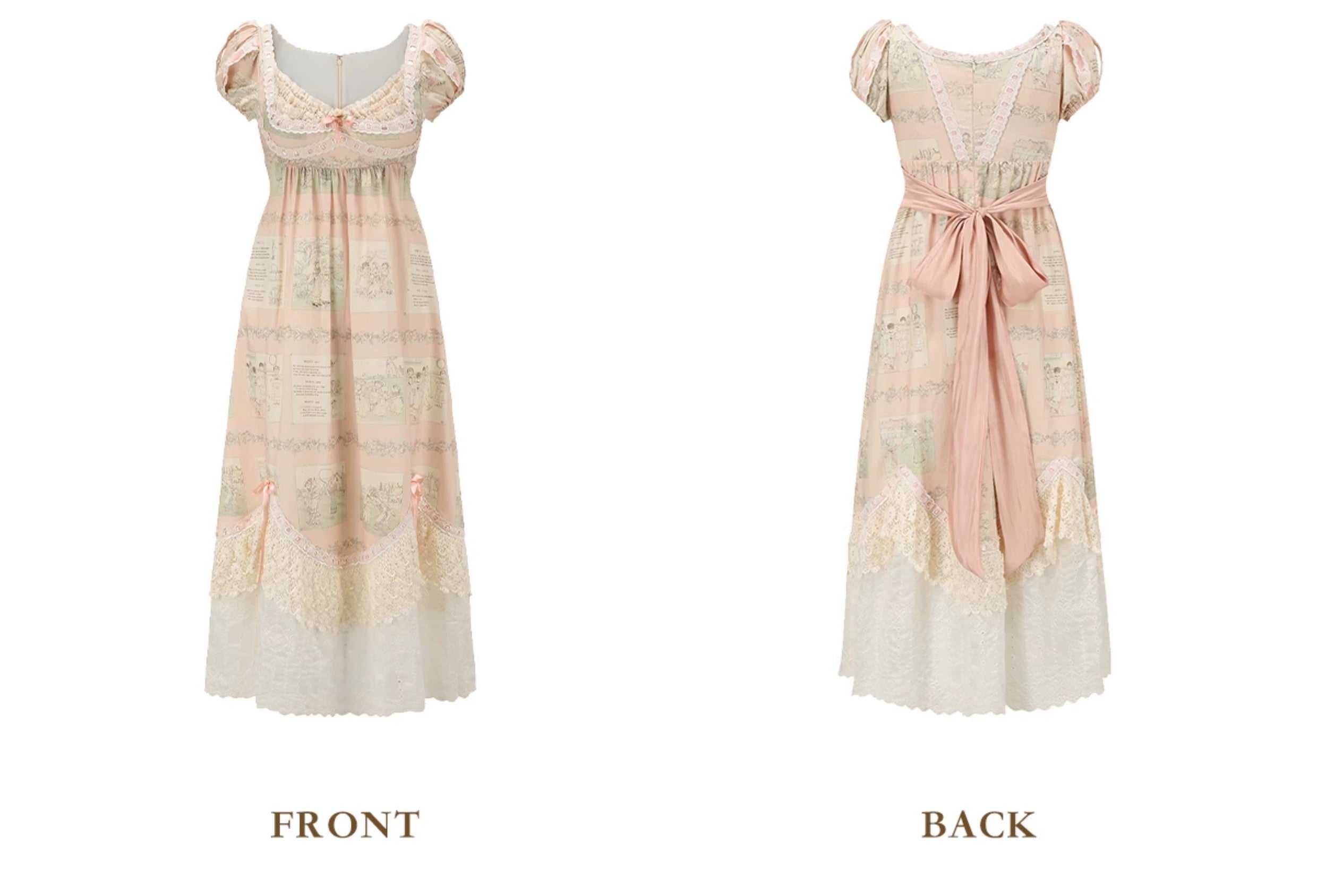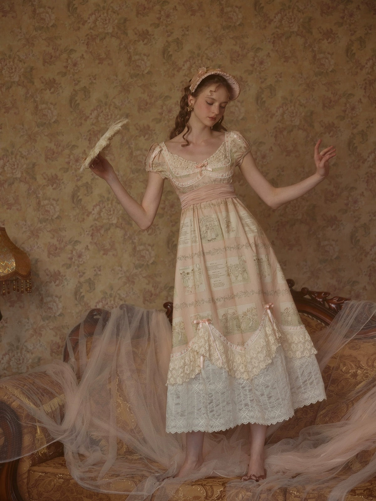 The skirt is elegantly spliced with vintage lace, and the wavy hem adds a romantic, graceful touch. The puffed princess sleeves enhance your shoulder shape, offering a flattering look. An invisible zipper at the back ensures easy wear and a seamless finish.