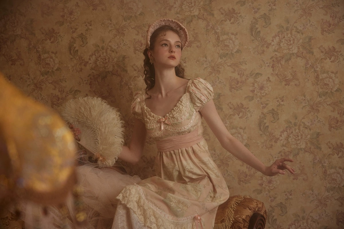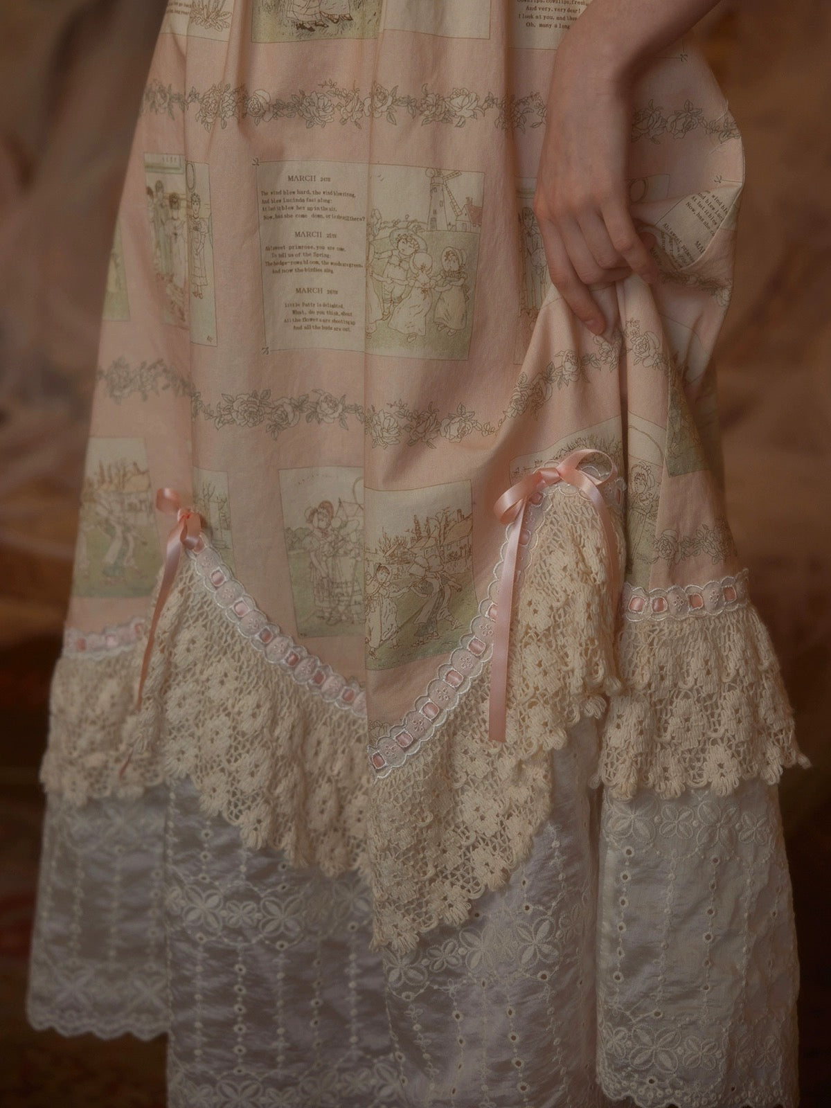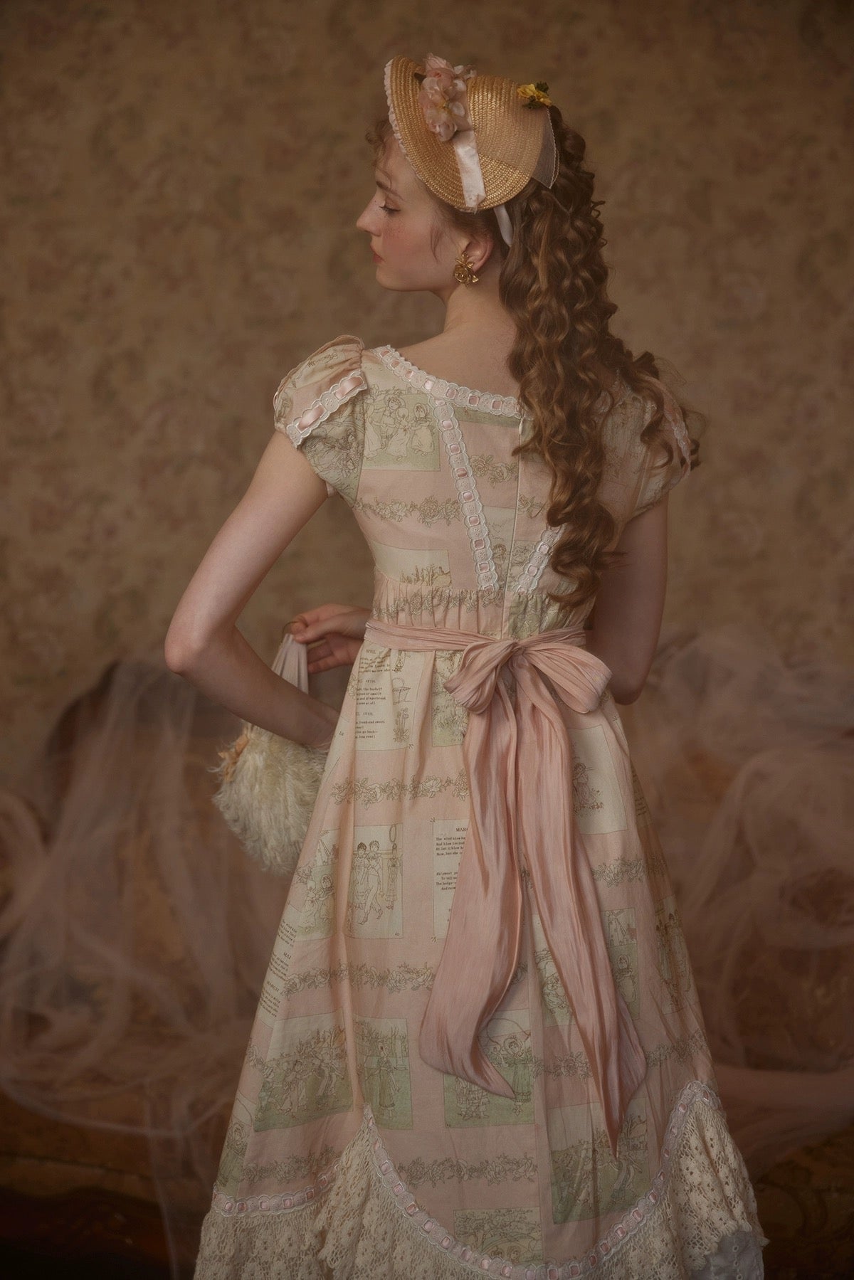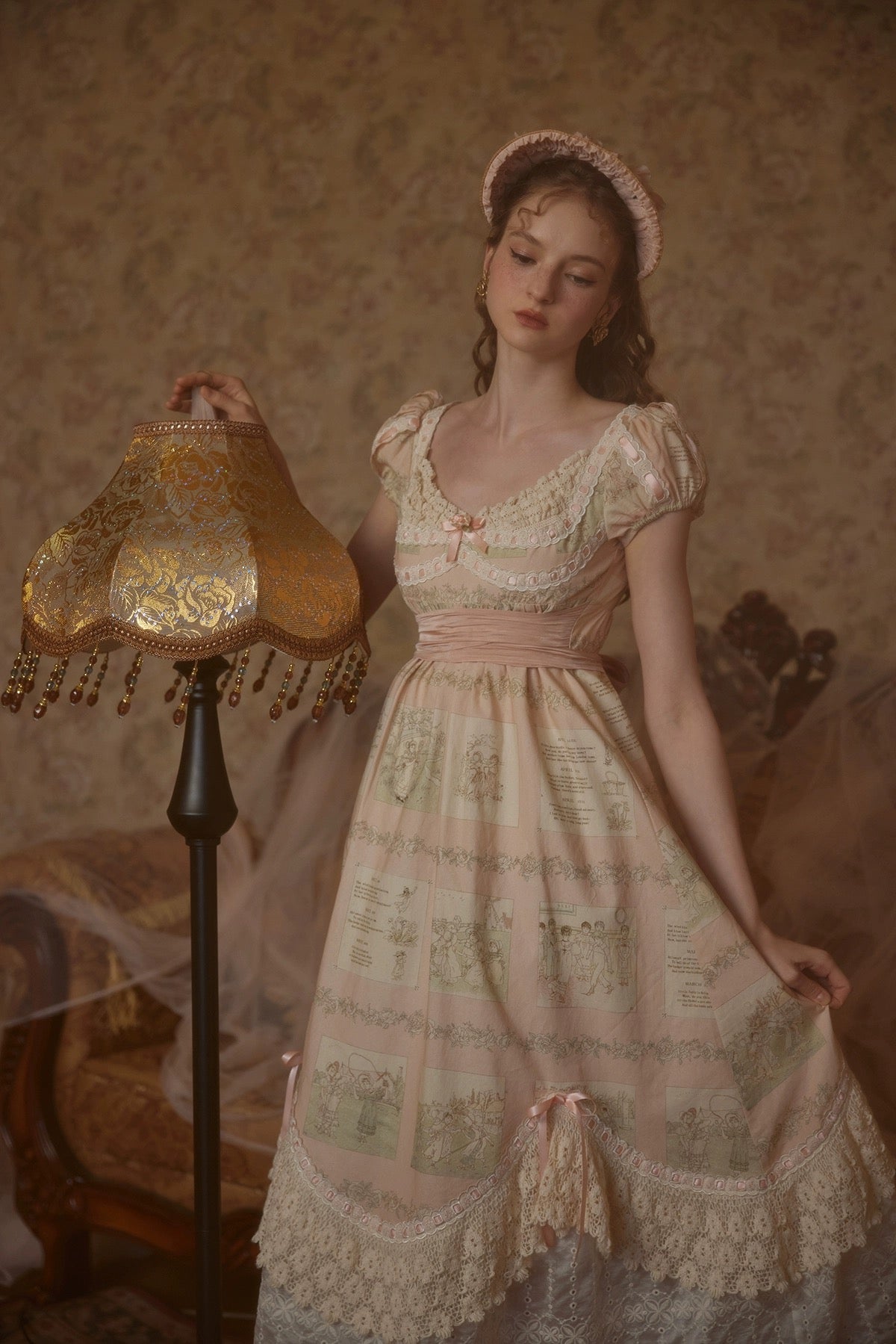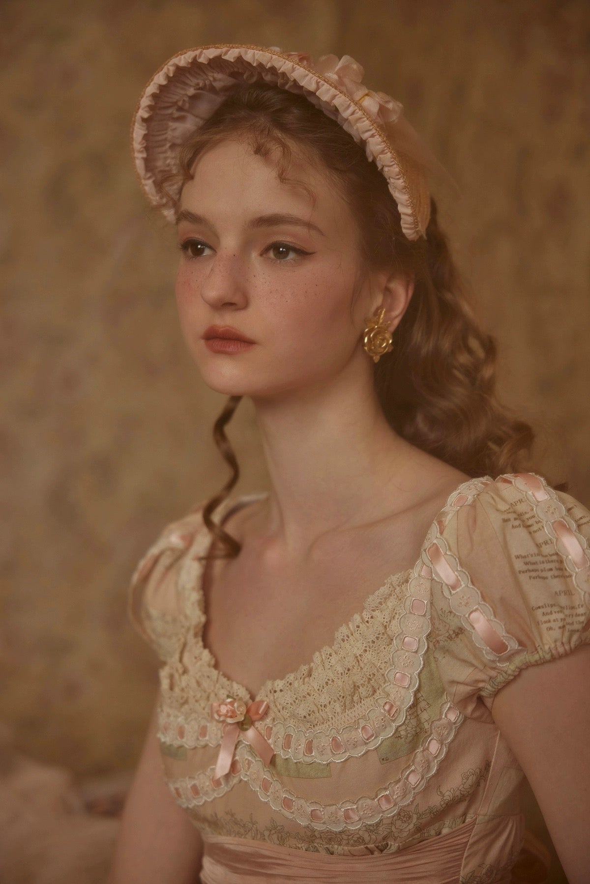 The skirt is elegantly spliced with vintage lace, and the wavy hem adds a romantic, graceful touch. The puffed princess sleeves enhance your shoulder shape, offering a flattering look. An invisible zipper at the back ensures easy wear and a seamless finish.