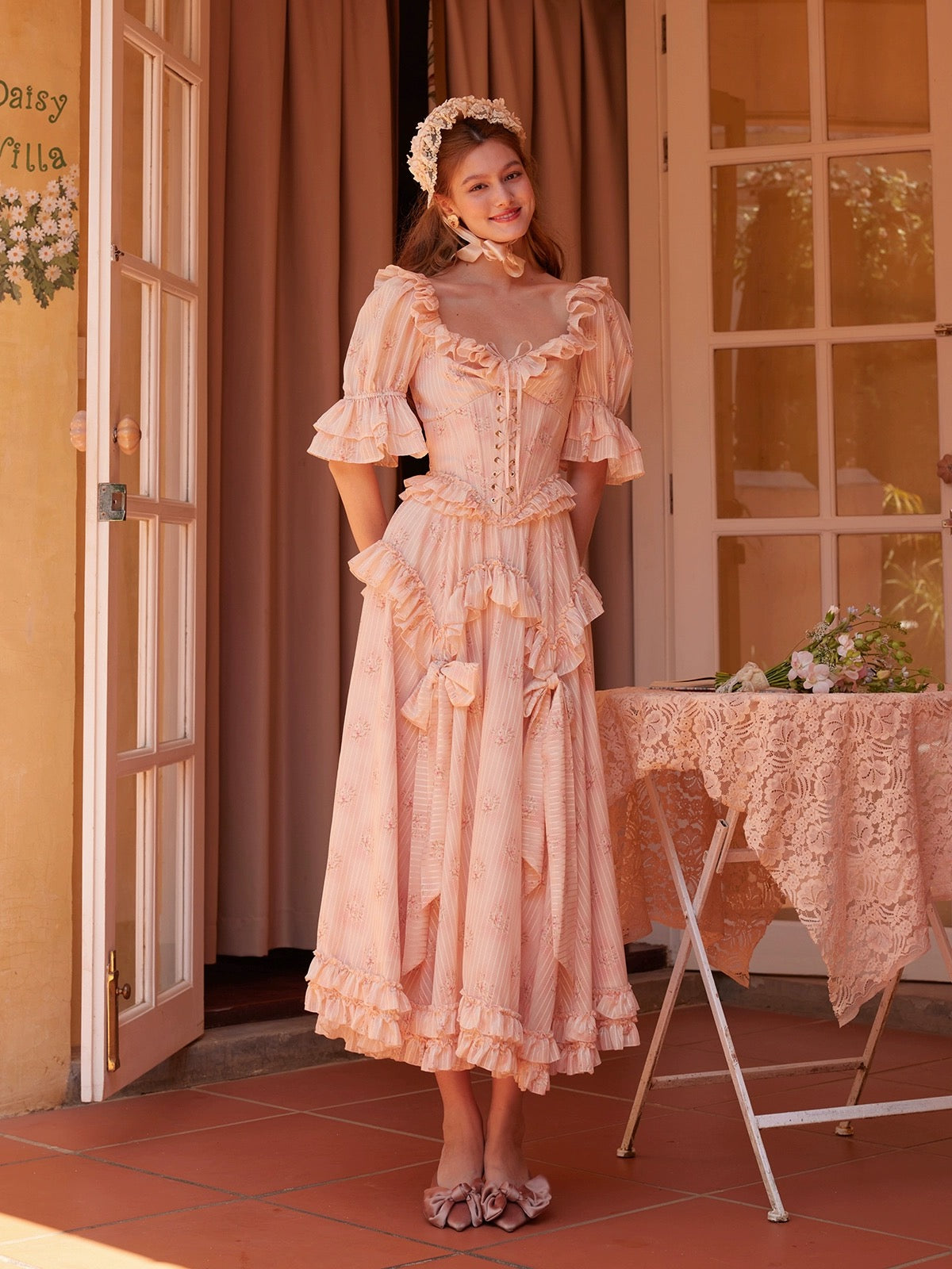 This design features a soft, skin-friendly striped jacquard fabric created with a direct-injection printing process. The satin fabric offers a luxurious glossy finish, with a smooth texture that’s both comfortable and gentle on the skin. The romantic ruffle neckline adds a sweet touch, while the adjustable drawstring at the bust ensures a personalized fit.