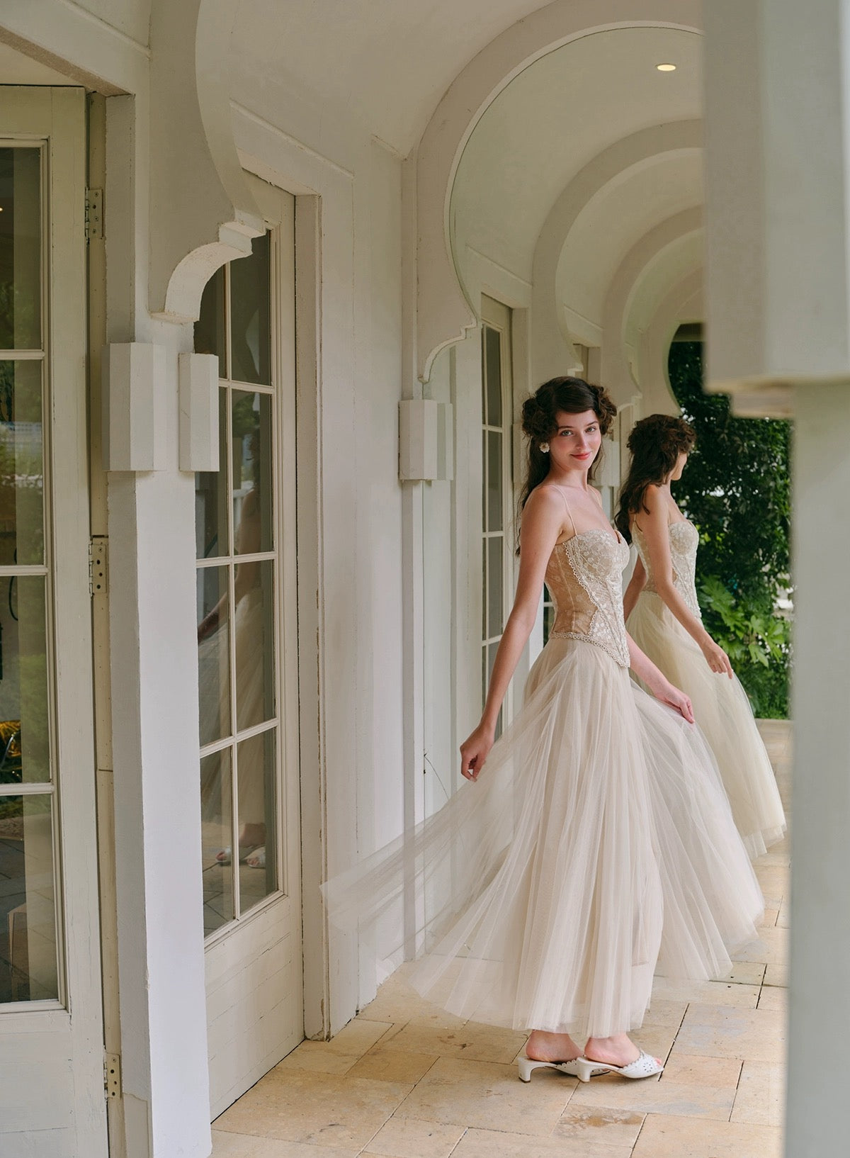 Comfort meets couture in the meticulously designed bodice. That sweetheart neckline? It's not just a design – it's a subtle artistry that sculpts and flatters your shoulders with architectural precision. The intricately constructed cups hug your silhouette, while discreet fish-bone boning provides gentle, supportive shaping that feels like a second skin.