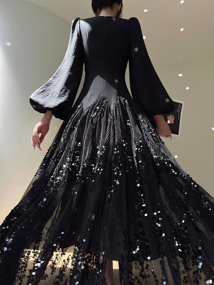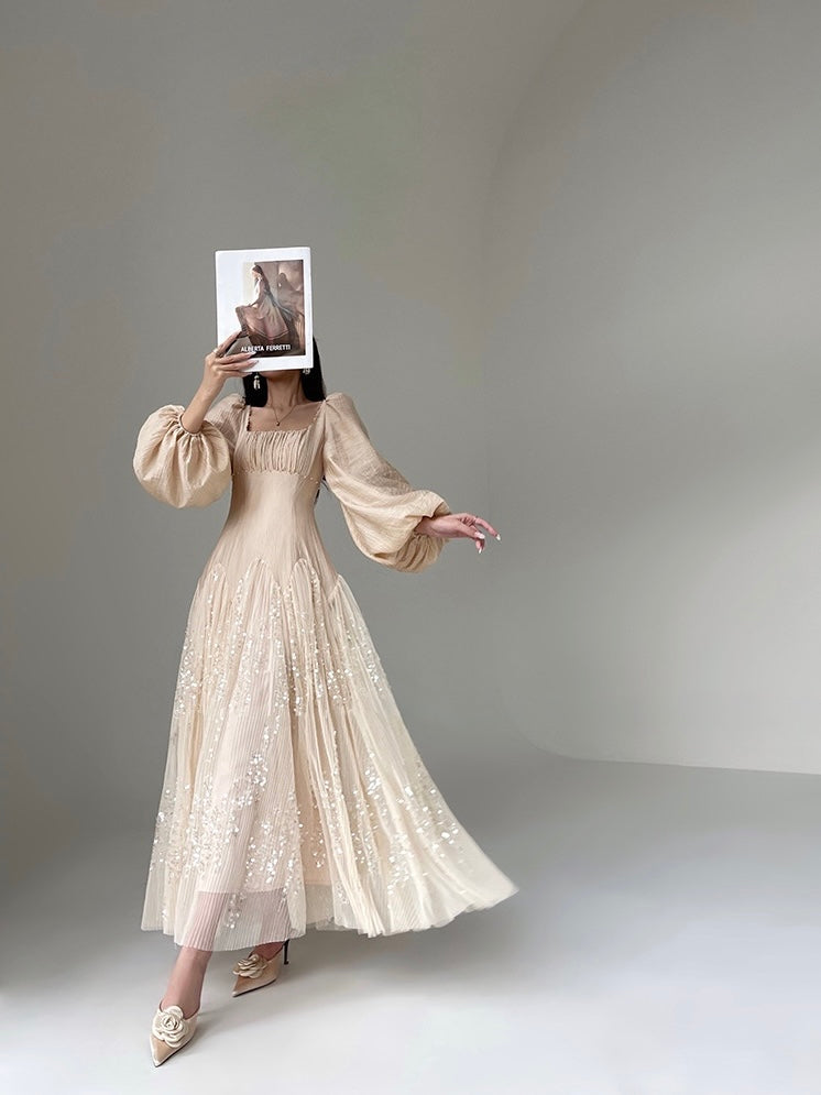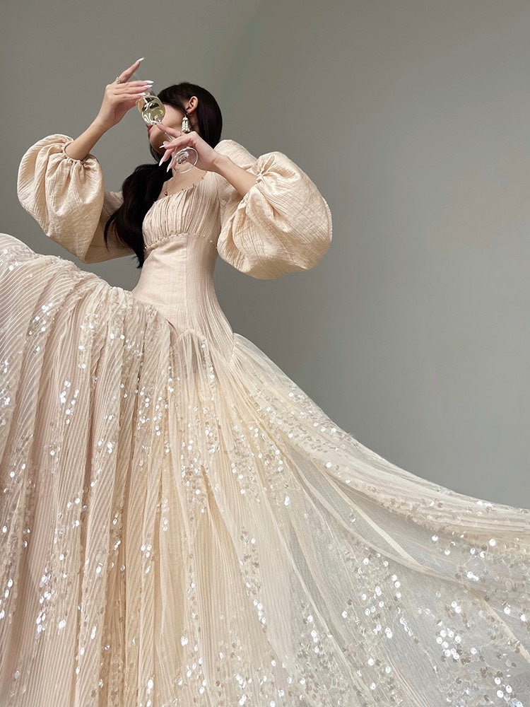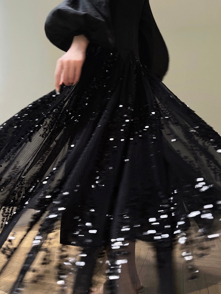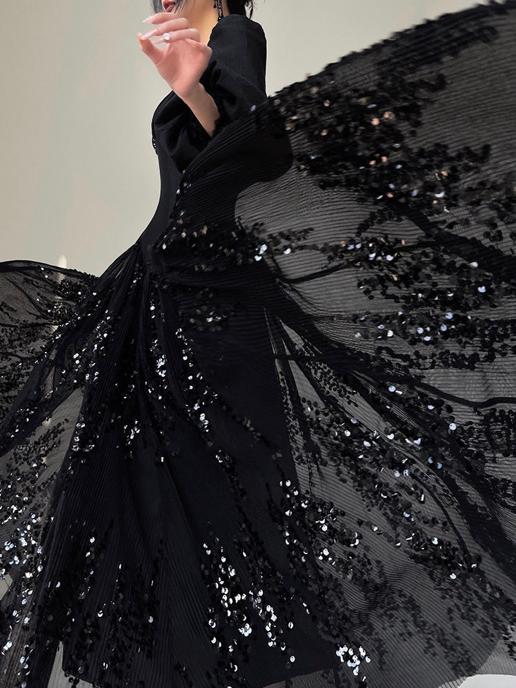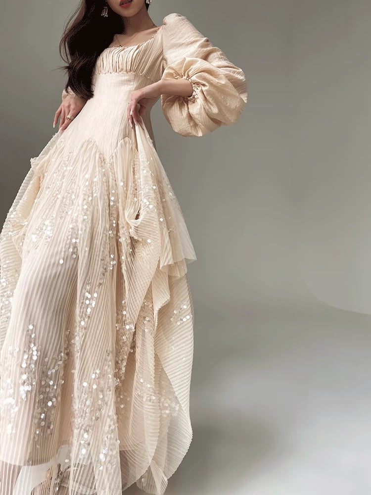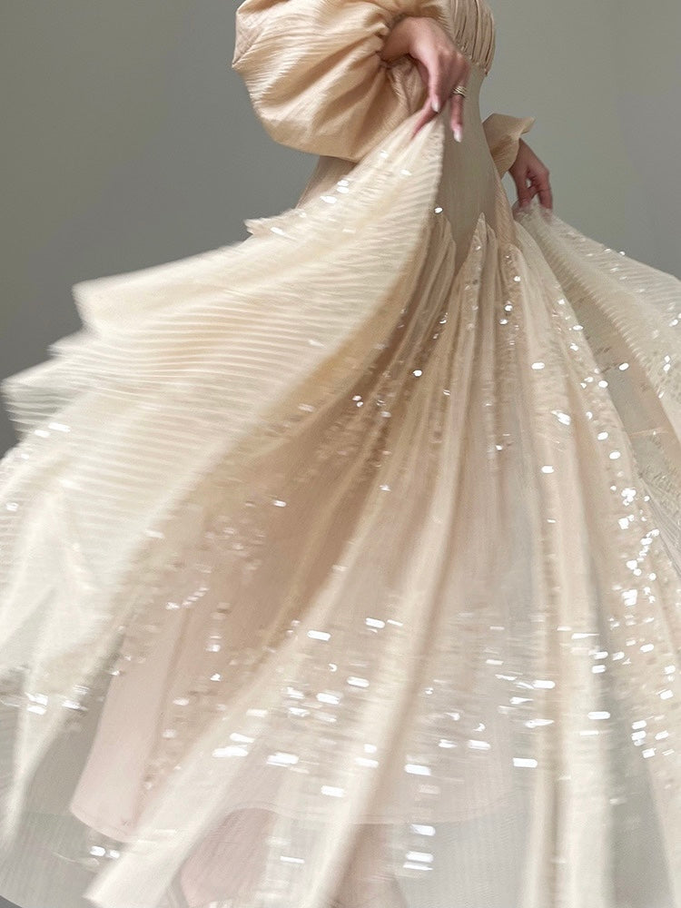 The sleeve design gently gathers at the shoulder and flows into a lantern puff shape with elastic cuffs—structured yet soft, with inner mesh for extra shape. The petal-cut hem is a highlight: flowing, asymmetrical, light as air, and embroidered with sequins that sparkle as you walk.