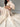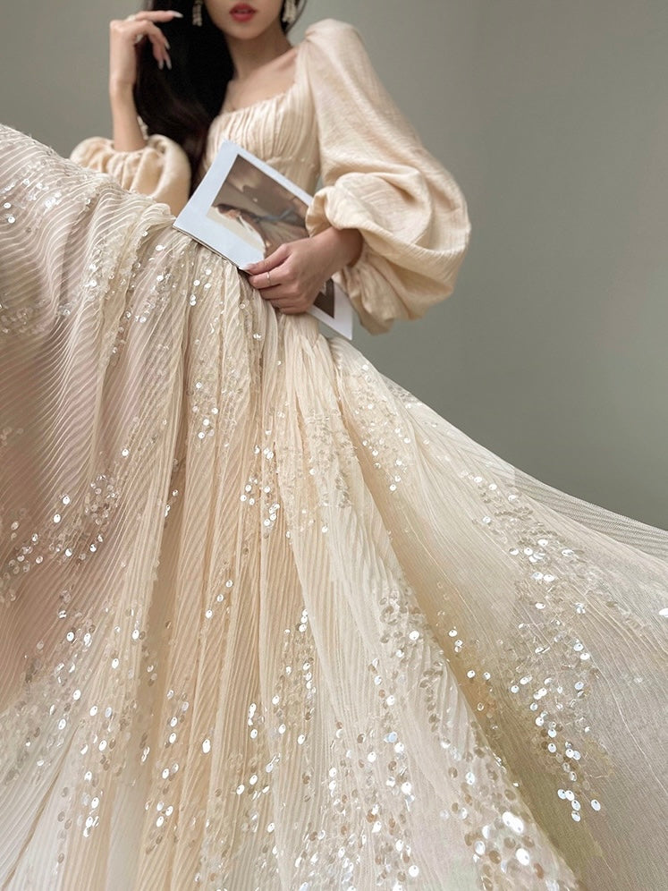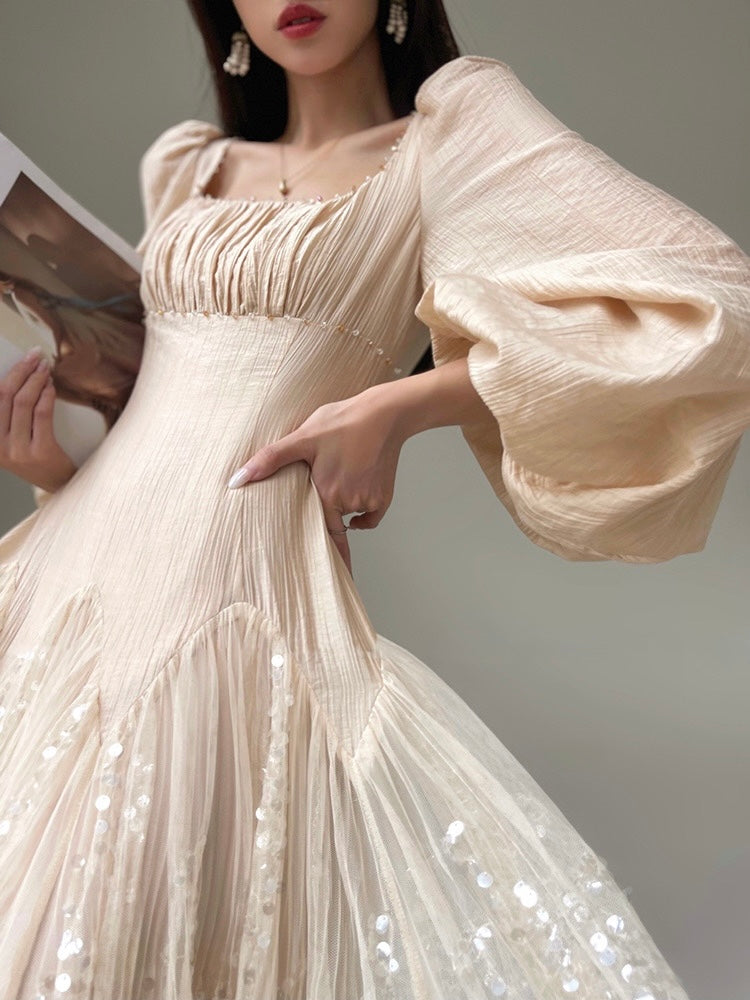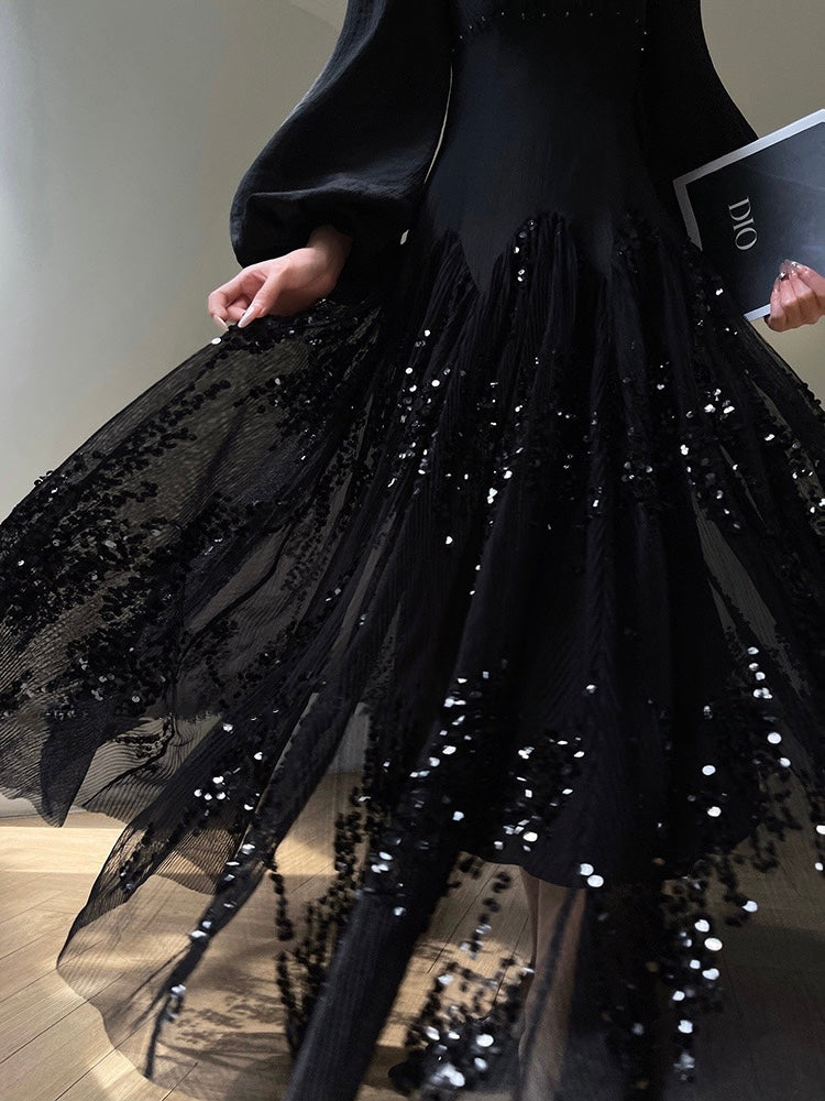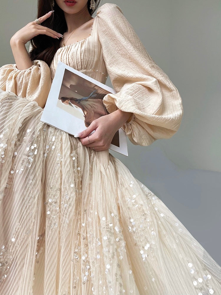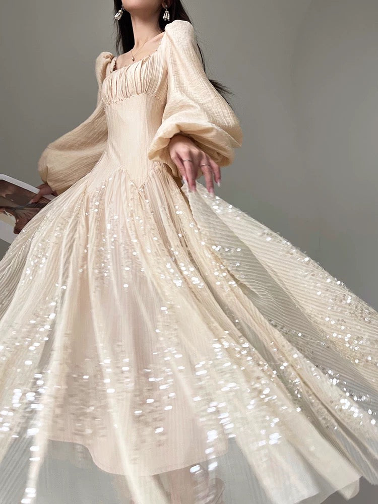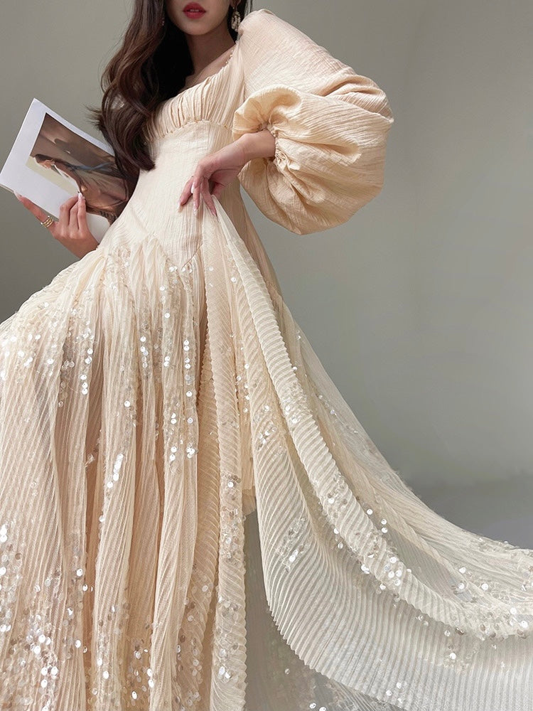 The sleeve design gently gathers at the shoulder and flows into a lantern puff shape with elastic cuffs—structured yet soft, with inner mesh for extra shape. The petal-cut hem is a highlight: flowing, asymmetrical, light as air, and embroidered with sequins that sparkle as you walk.