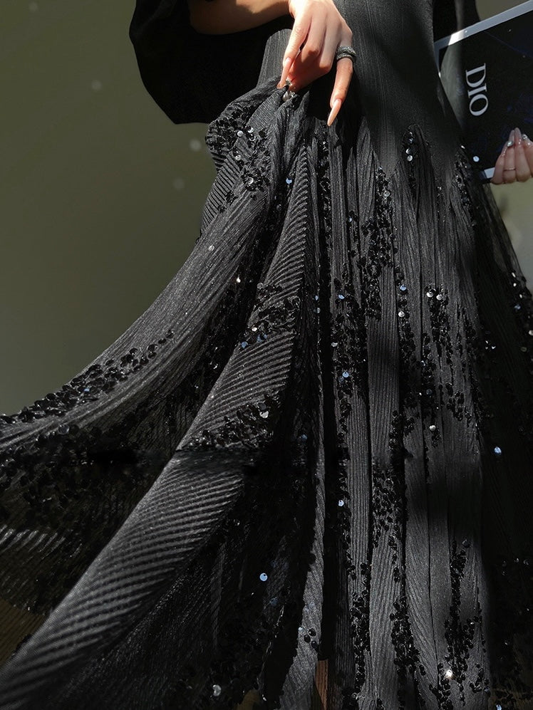We chose a matte, silky TENCEL blend for its breathable, soft touch and elegant drape. The texture? Smooth yet structured, with a subtle linear grain that flows beautifully as you move. Layers of fine mesh, pleated twice and then embroidered with sequins by hand, bring dimension and that irresistible glow.