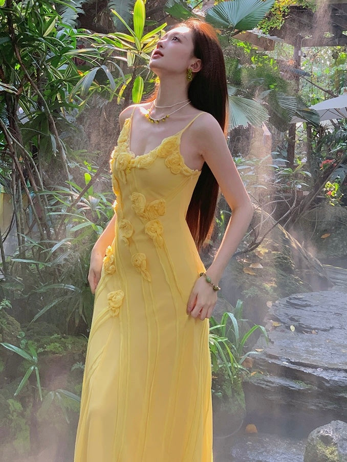 Cut on the bias for a fluid, curve-skimming fit, she drapes like a dream with softly sculpted lines that feel both delicate and defined. The soft buttery yellow fabric is fresh and luminous, while the subtle green-gold trim nods to tender new buds just beginning to bloom.