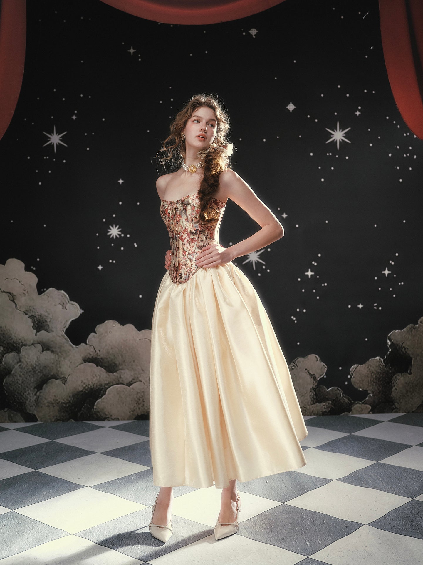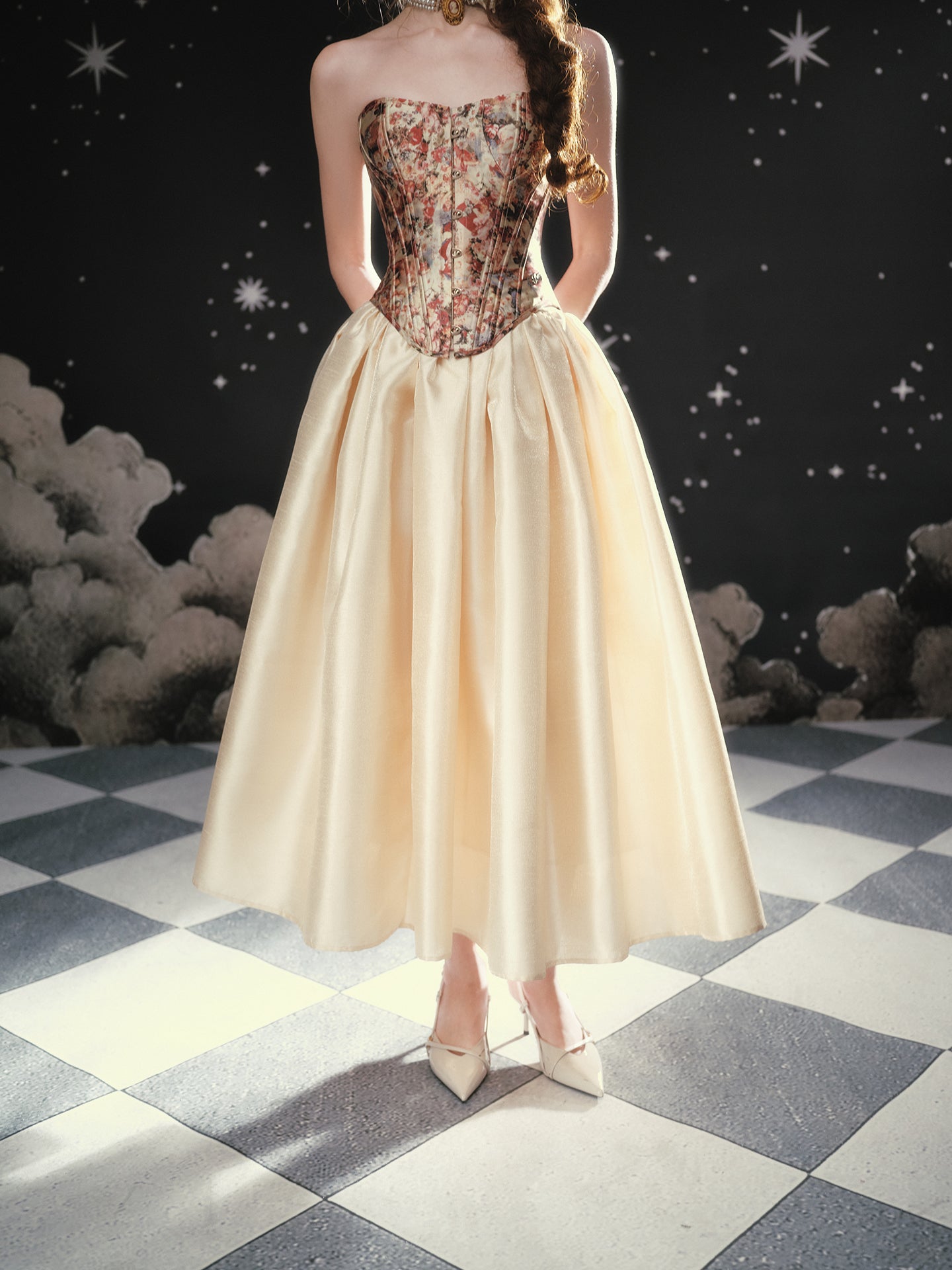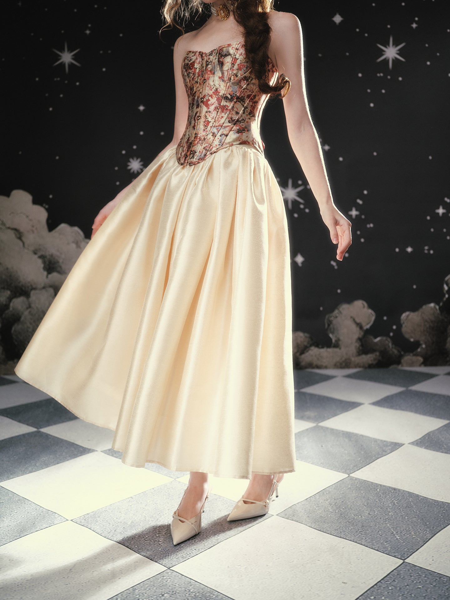 Soft rebellion wrapped in satin, ‘Fallen Eros’ glides from a neat mid-waist into an exaggerated A-line flare, delivering that cinematic swish we all crave. We chose a luminous pearl-sheen fabric that looks almost liquid under evening lights, yet feels crisp and breathable for daytime wanderings.