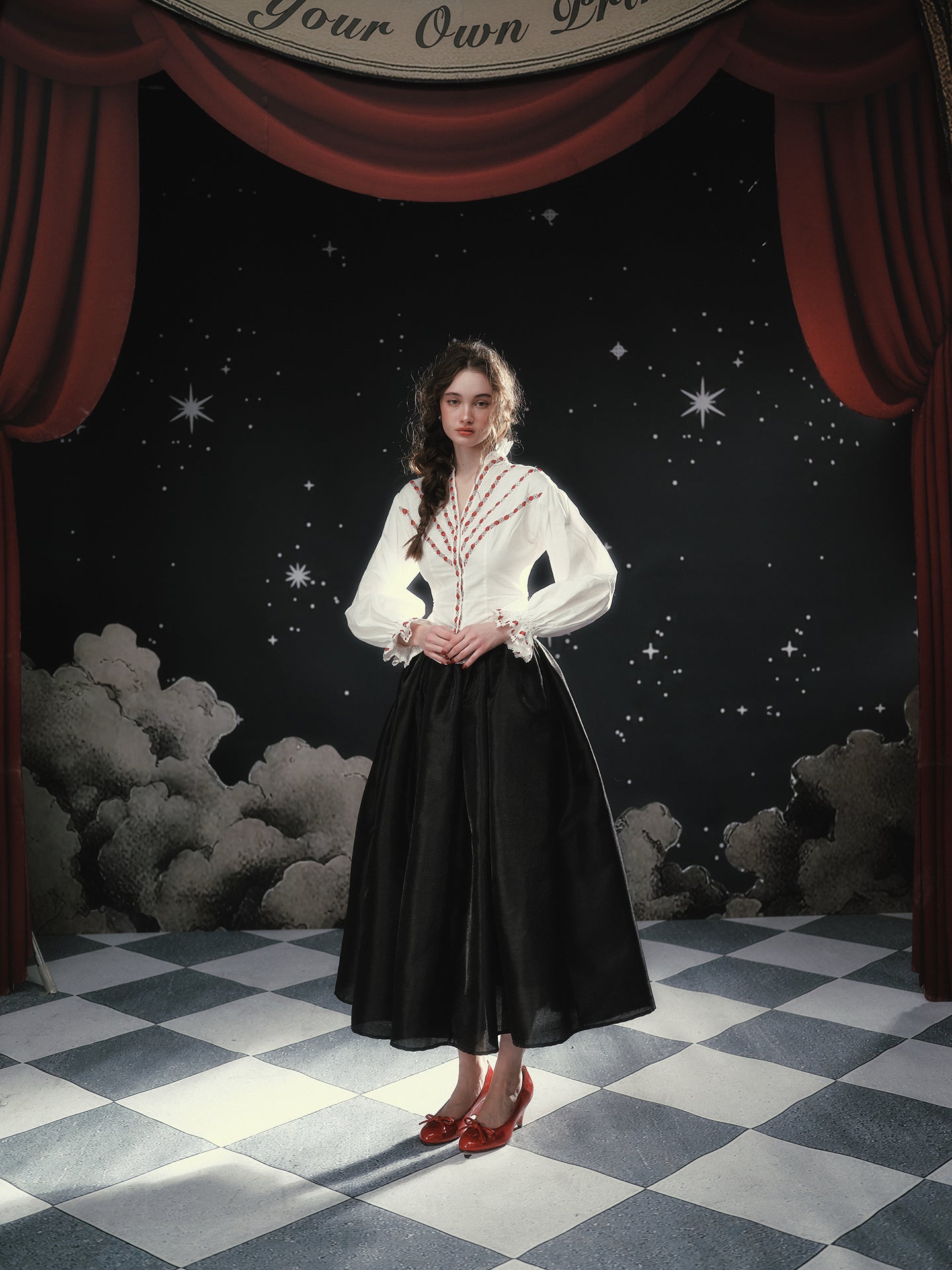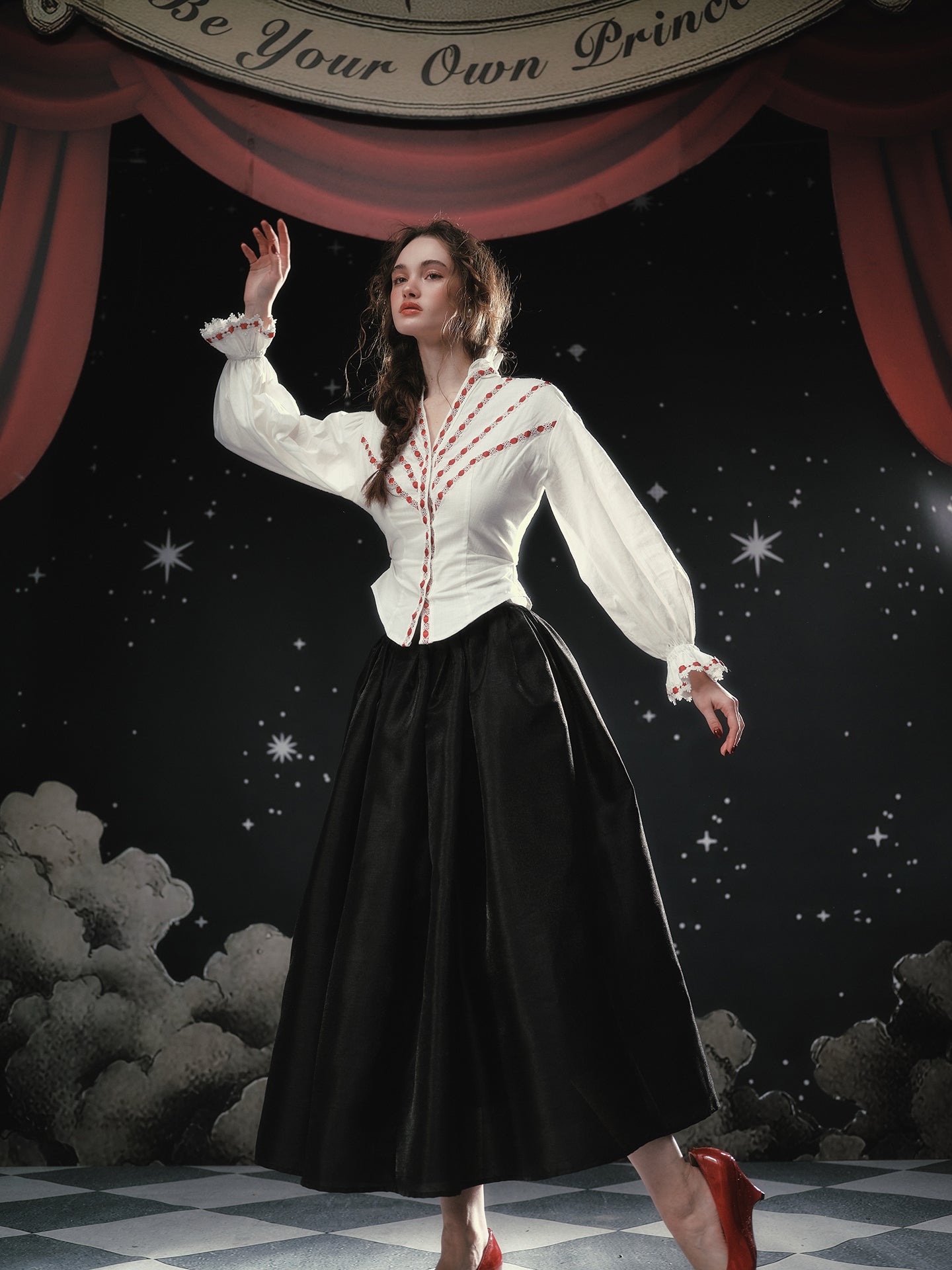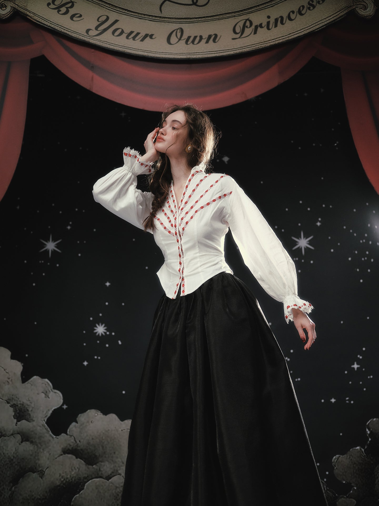 Soft rebellion wrapped in satin, ‘Fallen Eros’ glides from a neat mid-waist into an exaggerated A-line flare, delivering that cinematic swish we all crave. We chose a luminous pearl-sheen fabric that looks almost liquid under evening lights, yet feels crisp and breathable for daytime wanderings.