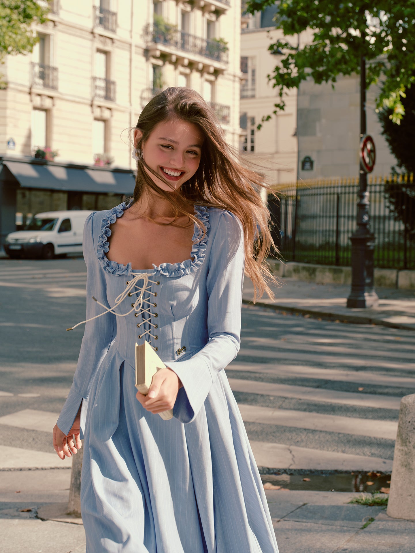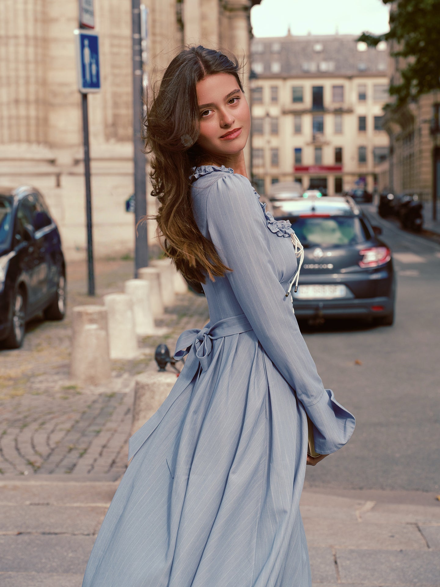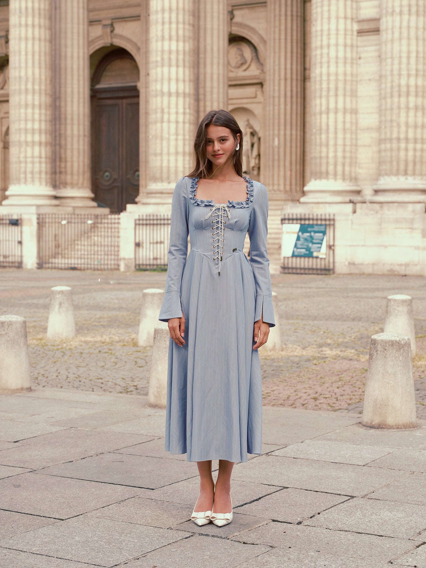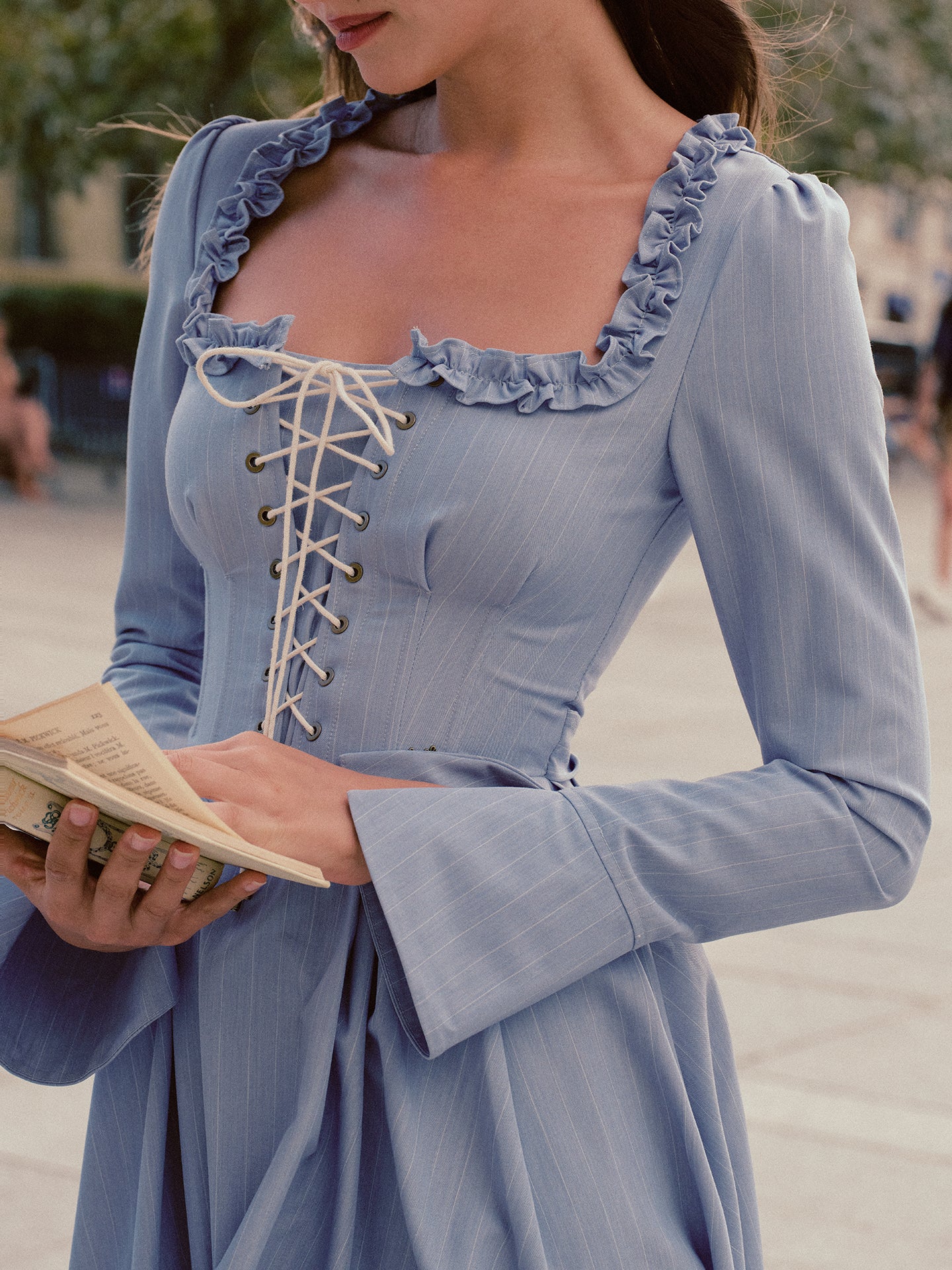 We cut ‘Côte Bleue’ with a gently corseted lace-up bodice that cinches just so, framed by a square neckline trimmed in playful ruffles and finished with fluted sleeves that swish as you stroll - oui, it’s the perfect blend of romance and everyday chic.