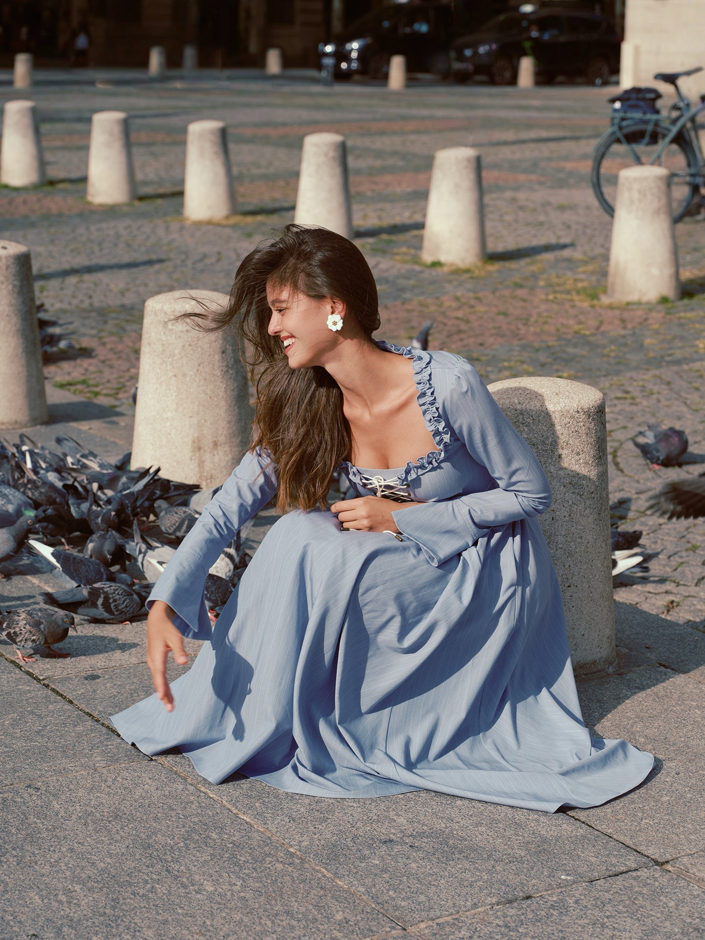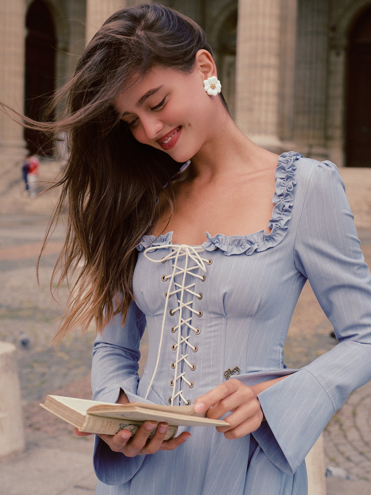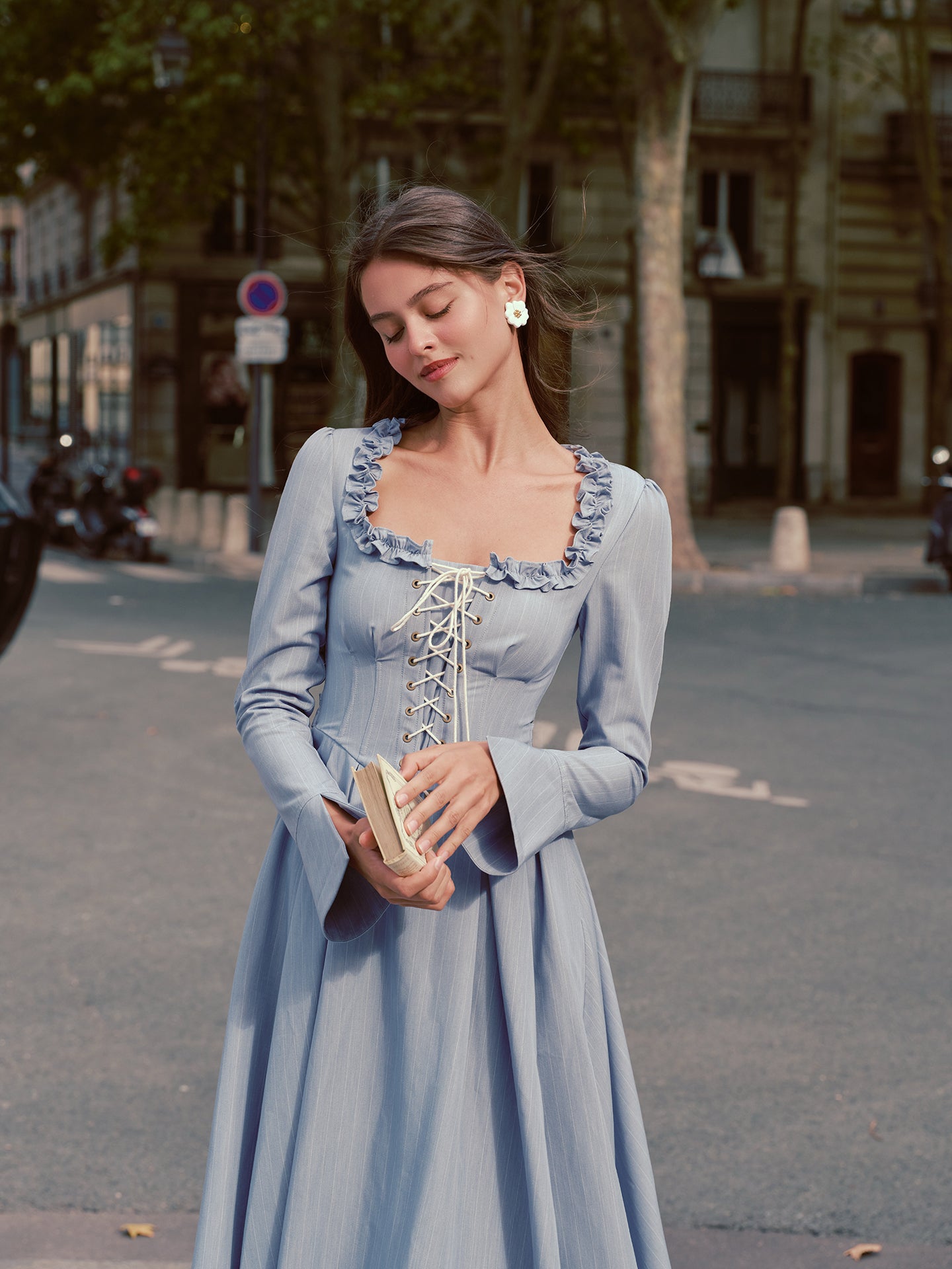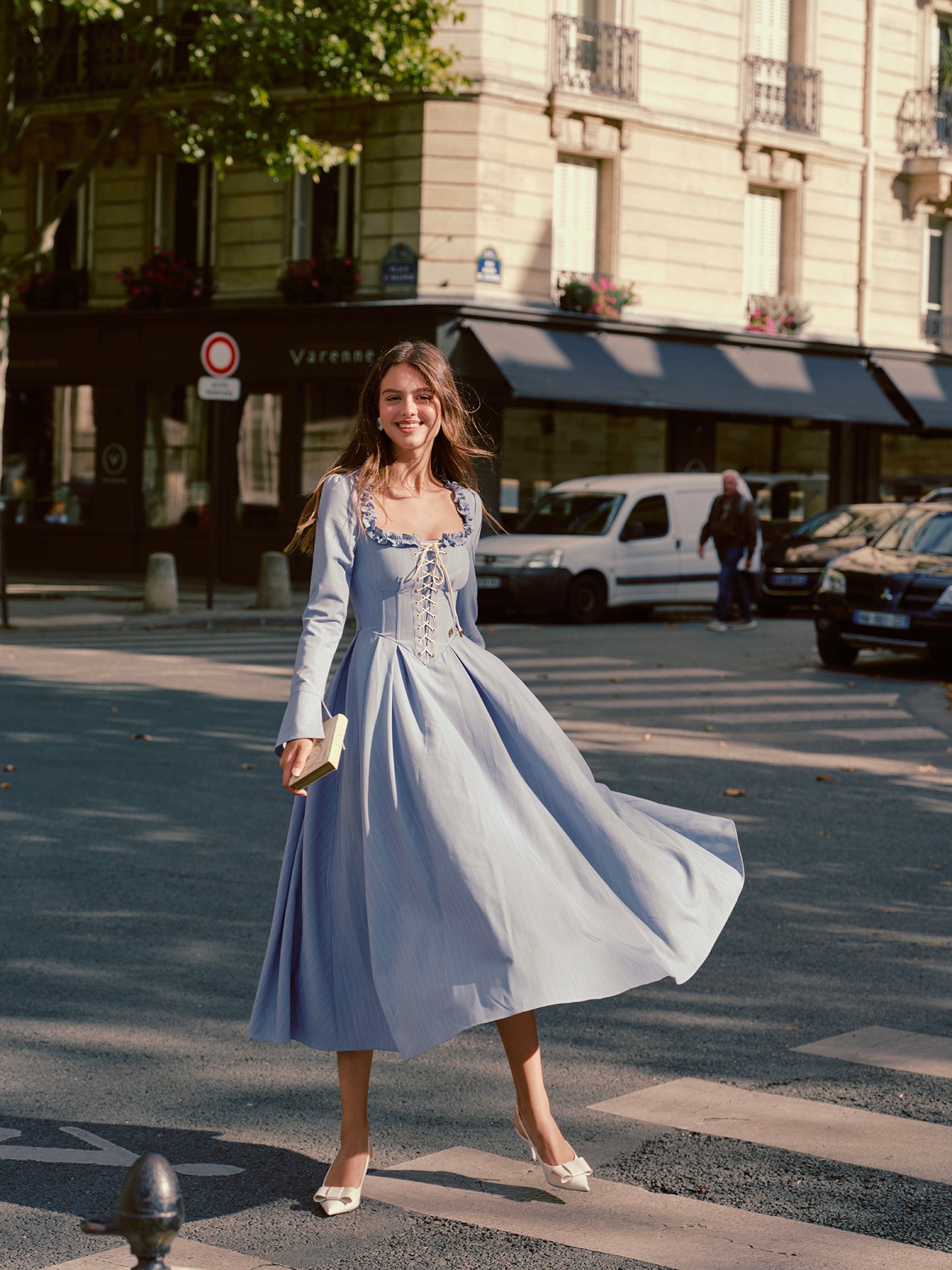 We cut ‘Côte Bleue’ with a gently corseted lace-up bodice that cinches just so, framed by a square neckline trimmed in playful ruffles and finished with fluted sleeves that swish as you stroll - oui, it’s the perfect blend of romance and everyday chic.