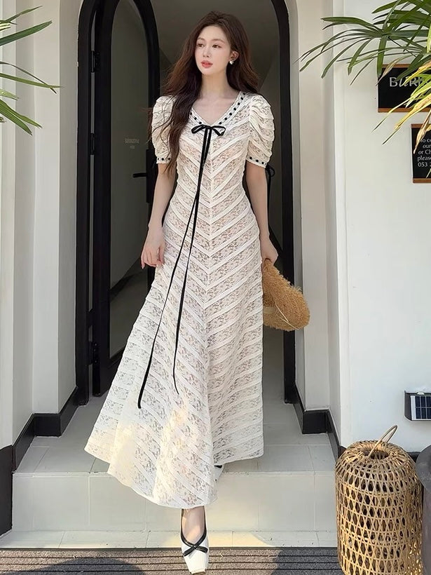 The upper bodice is cut at a precise 35° angle, with the skirt panels laid at 45° to create that perfect drape and soft movement. Because the lace width is narrow, it takes time—and a whole lot of craftsmanship—to bring her to life. The velvet ribbon at the neckline is hand-threaded by our artisans for a clean, knot-free finish, adding just the right amount of texture and vintage flourish.