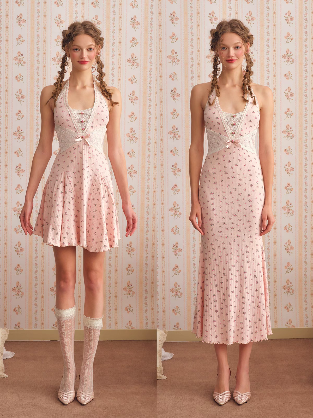 The Cheryl dress captures the essence of French-inspired romance with its enchanting rose-inspired floral print and versatile design. Available in both short and long versions, this lightweight cotton halter dress features a delicate white lace bodice that beautifully contrasts with the soft pink background and intricate floral pattern. The exposed back adds a touch of allure, creating a perfect balance between sweet femininity and modern elegance.