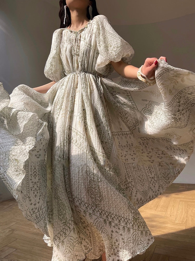 The round neckline transitions into a relaxed V-cut, framed by soft ties that fall effortlessly. Hand-stitched natural crystals are embedded along the neckline, catching the sunlight with subtle glimmers of gold and silver—each stone layered and luminous in its own way.